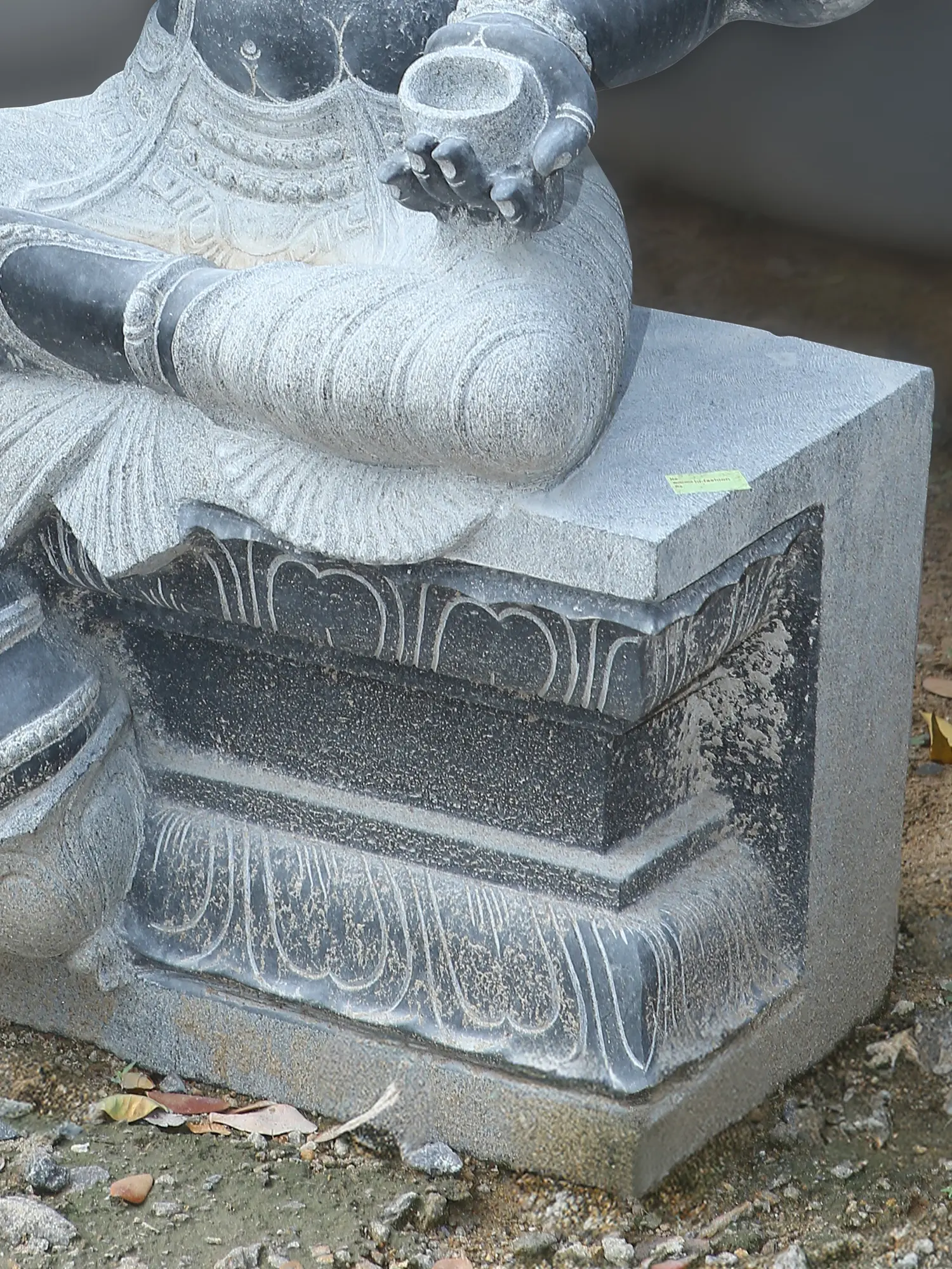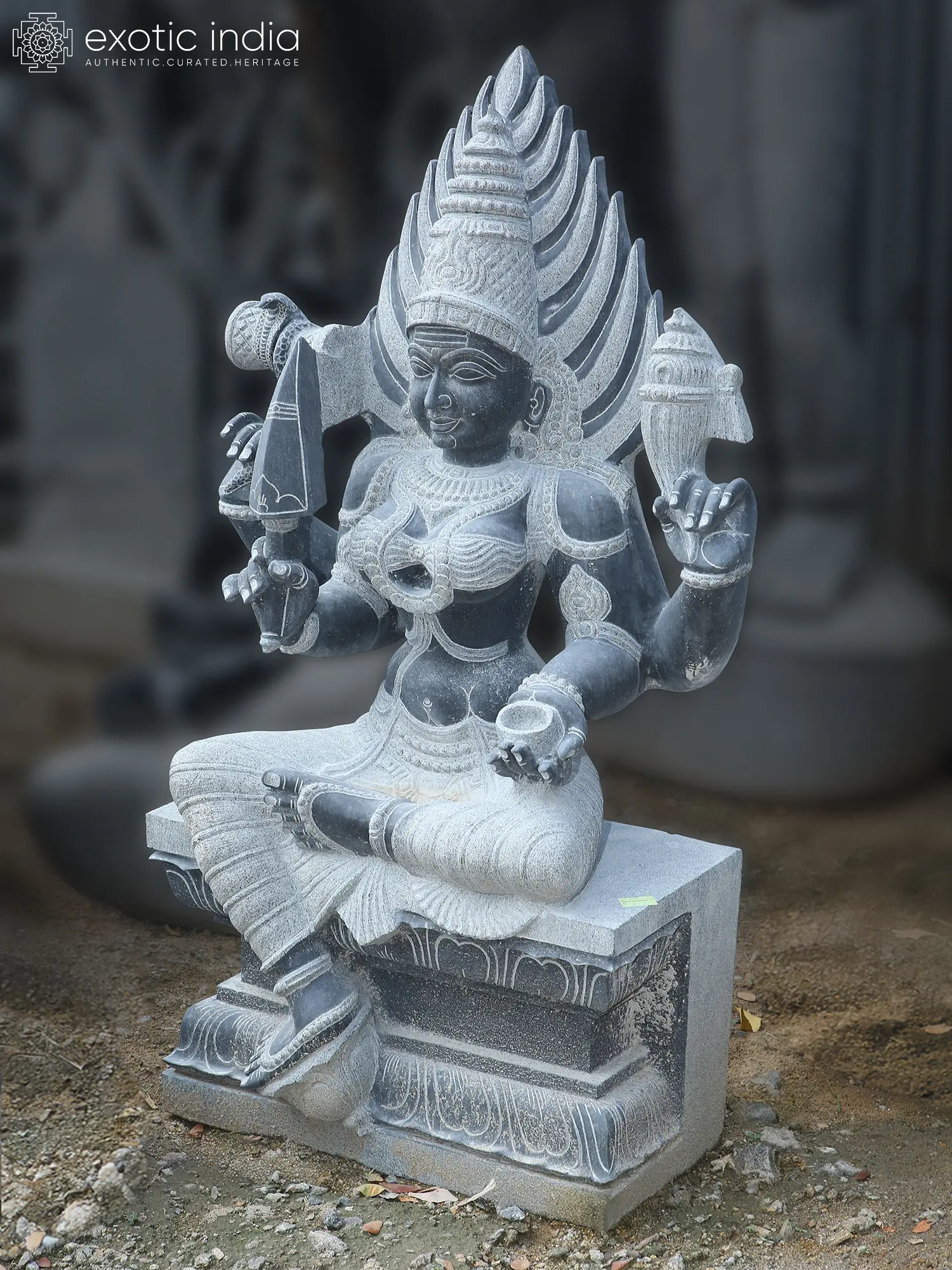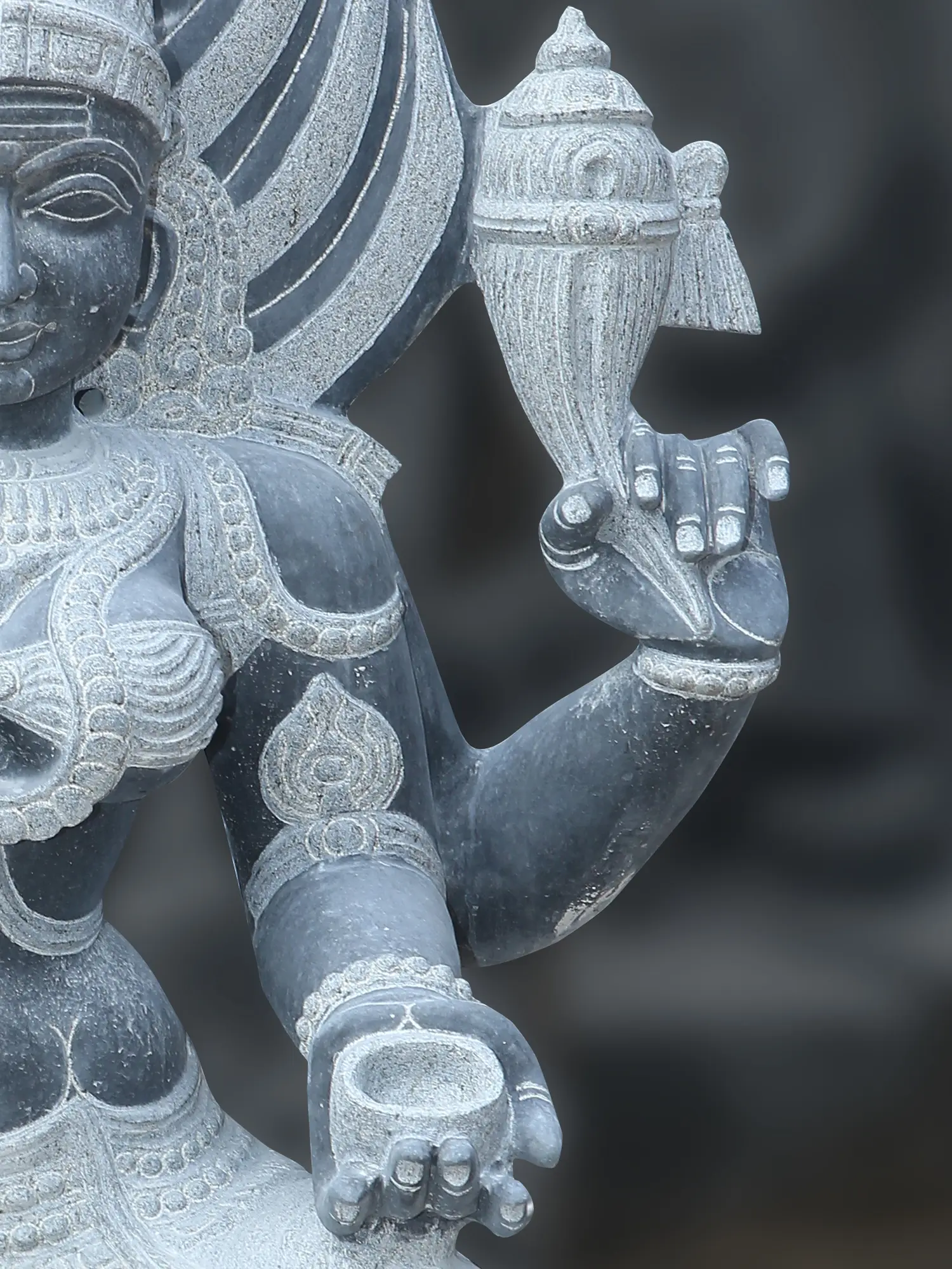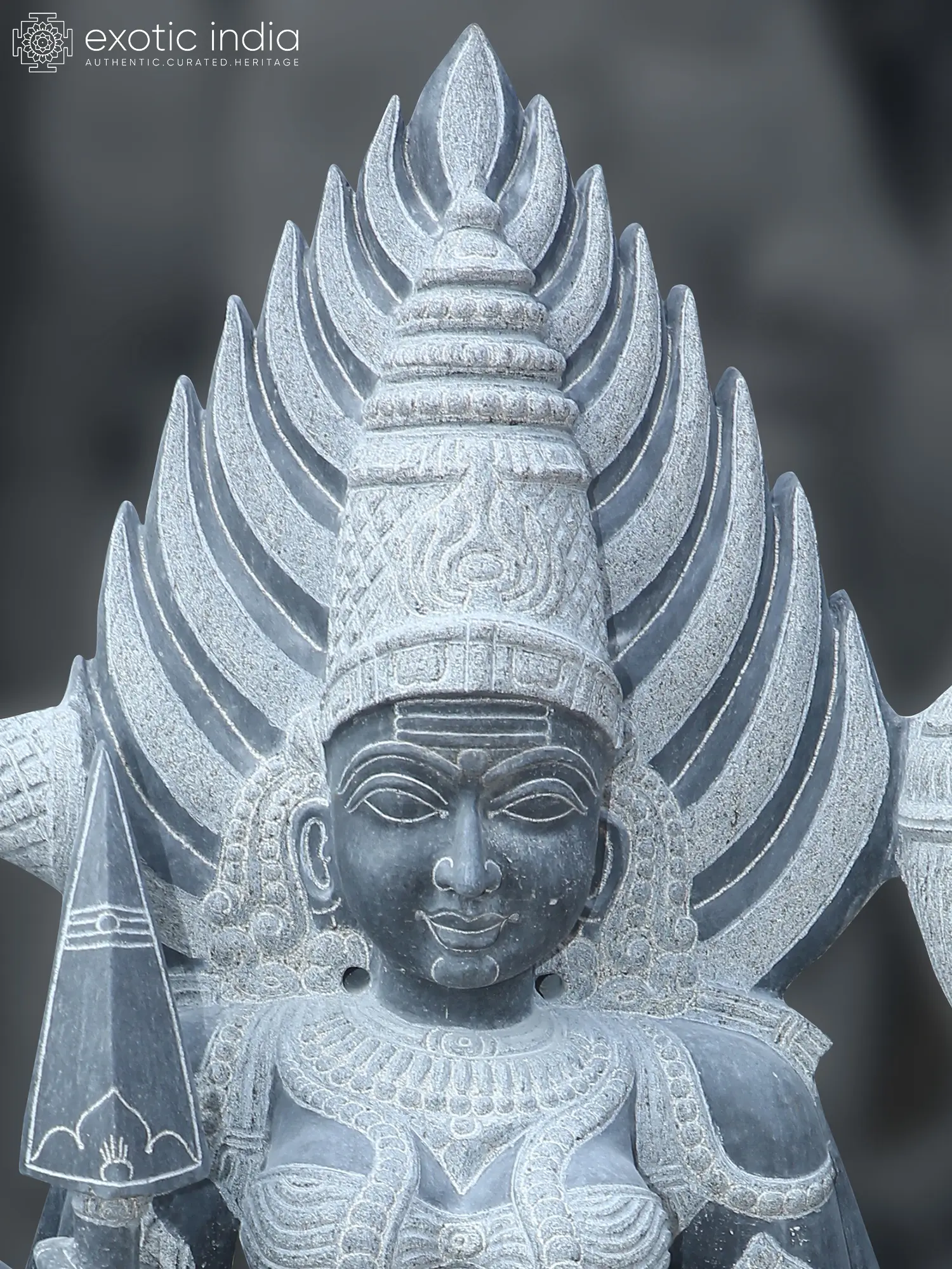 This granite statue is devoted to her sacred form, haloed by fire, adorned with Tripunda that connects her to Shiva’s wife, Parvati, fine jewelry and ornaments, and attributes that she uses to guard devotees and annihilate negative forces.