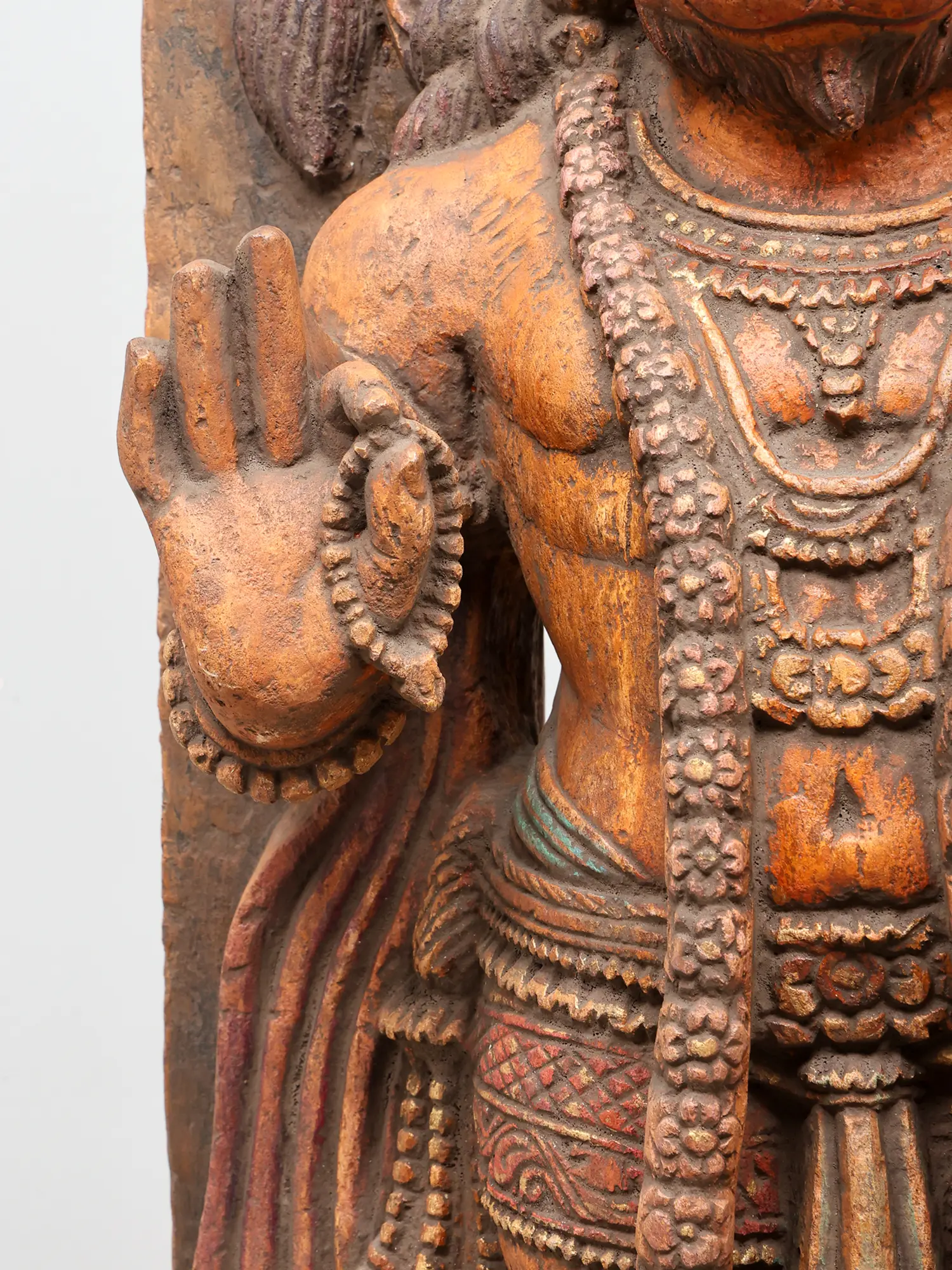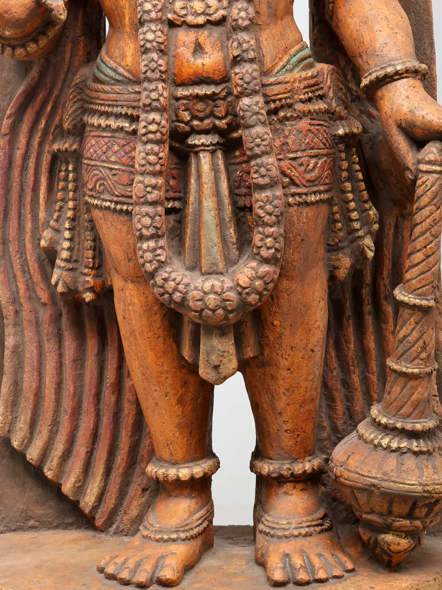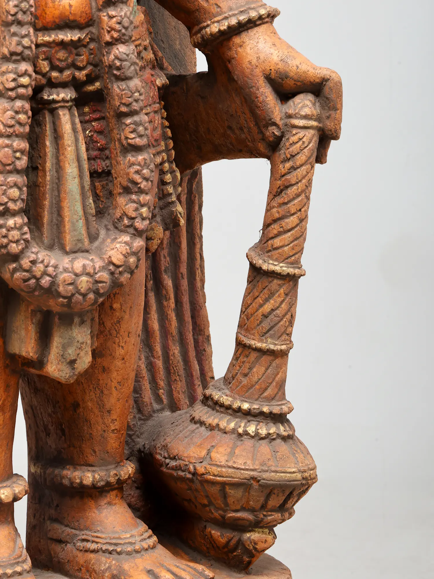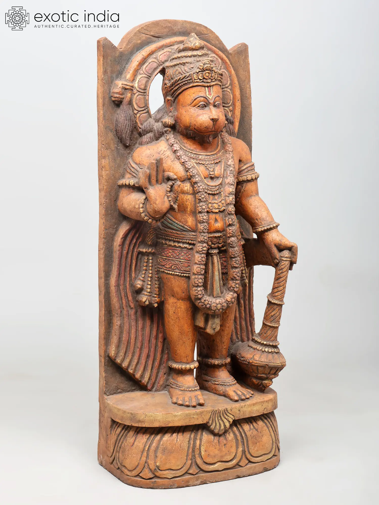 The composition is carefully harmonised. Hanuman’s tail curves upward, running parallel to the floral prabhavali, while the softly flowing garments on either side introduce a gentle rhythm that offsets the solidity of his stance.