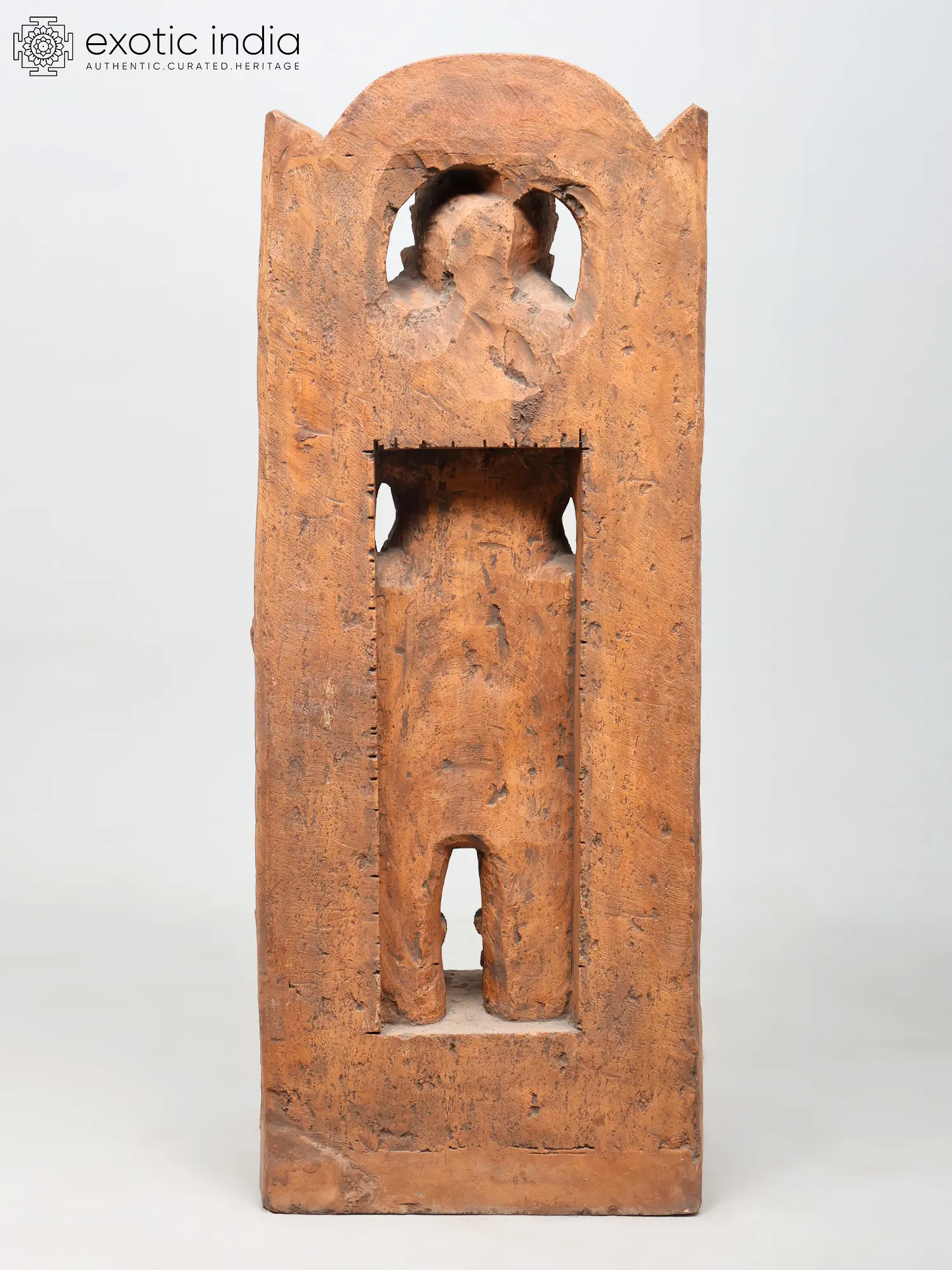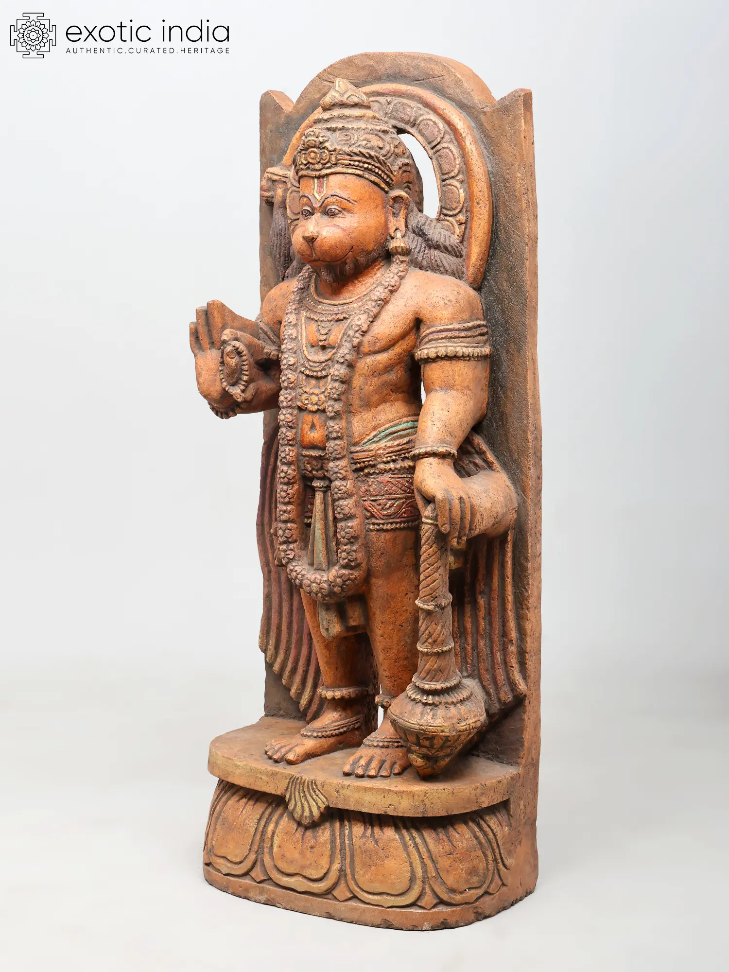 The stone is worked with a tactile texture, its surface recalling the warmth of unpolished wood. The natural terracotta hue of the material mirrors the sindoor traditionally associated with Hanuman, lending the image an intimate devotional resonance. This earth-bound quality enhances the sense of alertness and vitality that animates the figure.