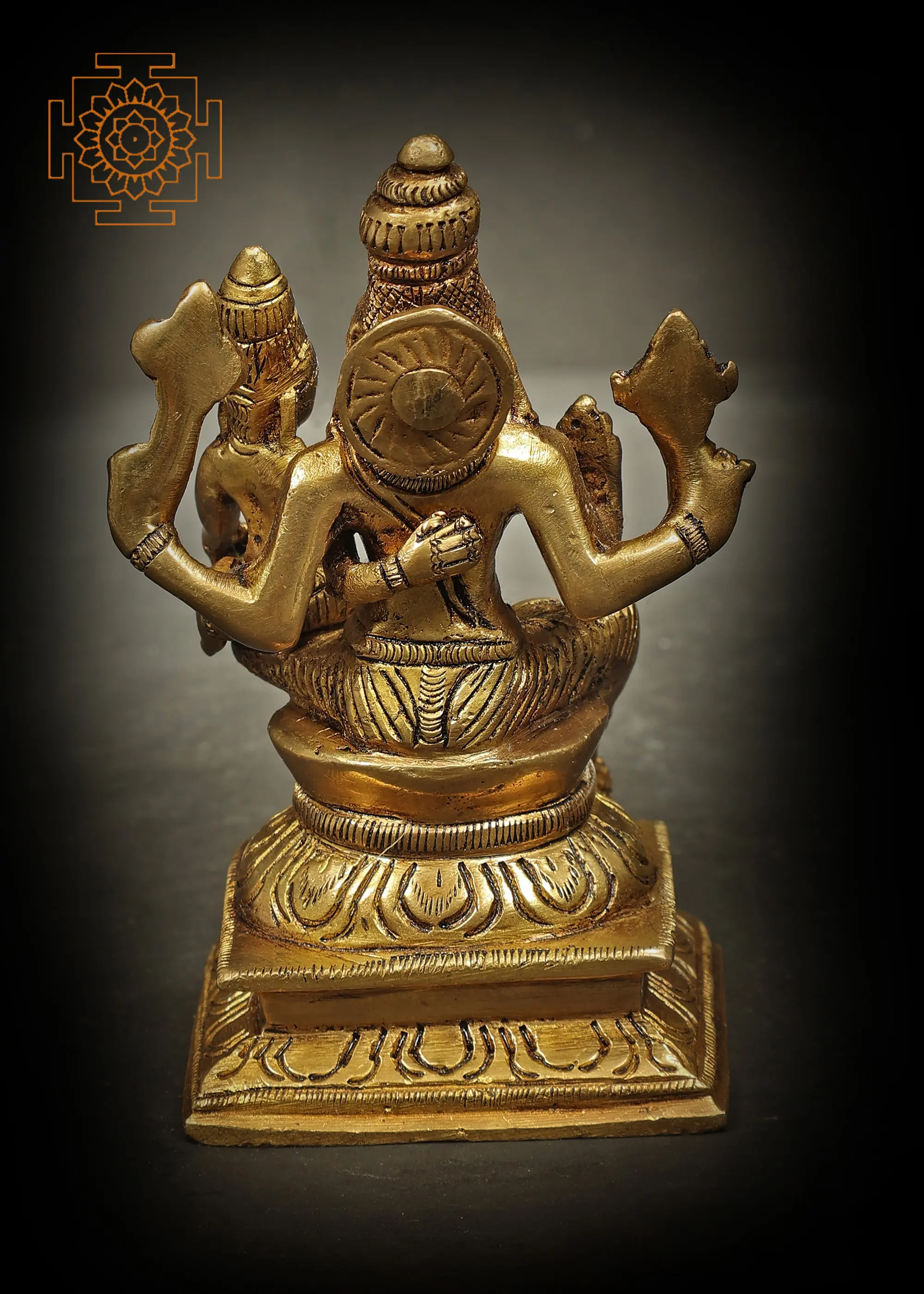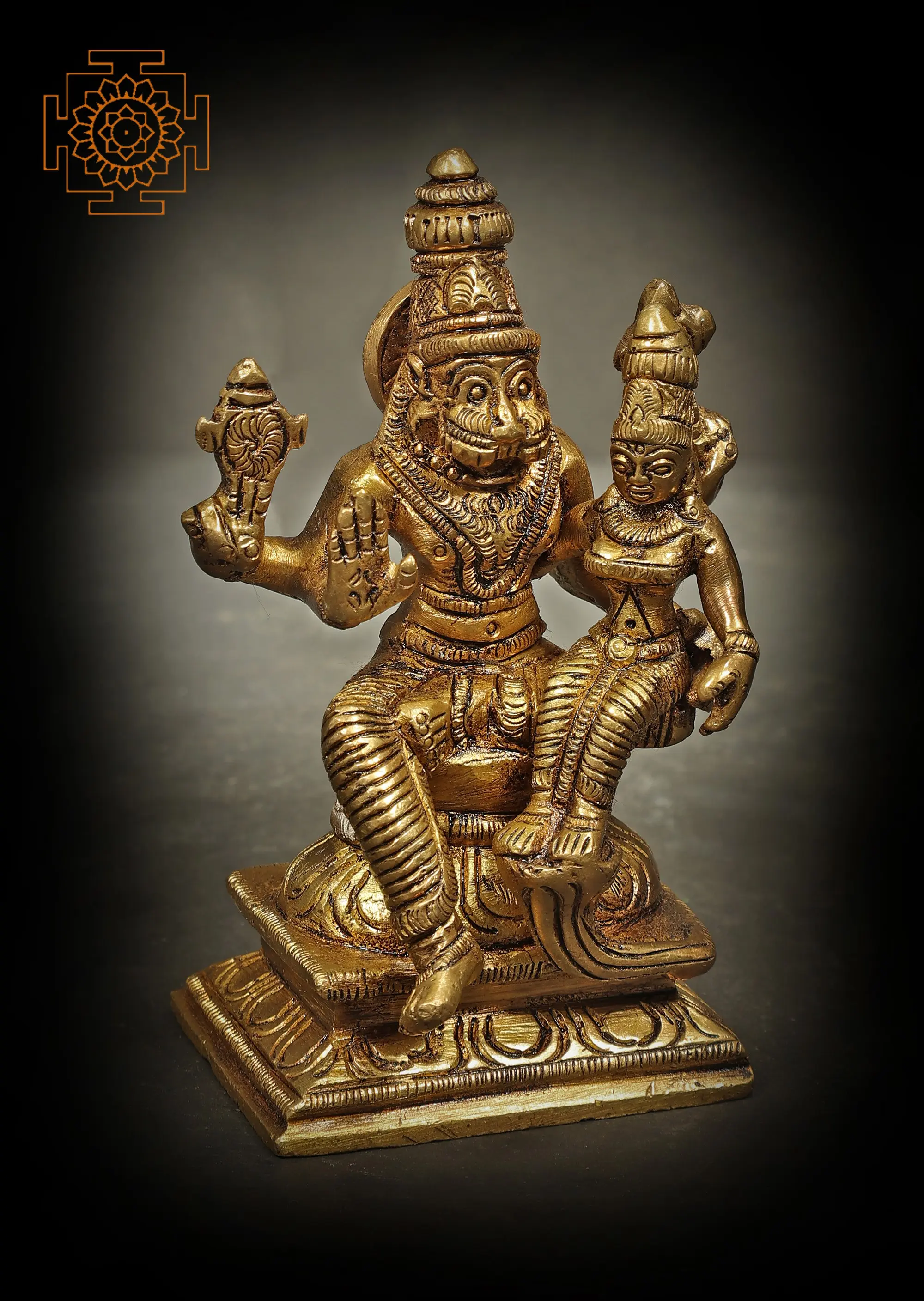 This exquisite brass idol captures a powerful and auspicious moment from Hindu mythology: the divine union of Bhagawan Narasimha and Devi Lakshmi. Bhagawan Narasimha, the fourth avatar of Lord Vishnu, is depicted in his iconic form, a human torso with the head of a lion, symbolizing supreme strength, courage, and the unwavering protection of Dharma. His fearsome visage, though emanating power, is softened by the serene presence of Devi Lakshmi, the goddess of wealth, fortune, and prosperity, seated gracefully on his lap. This imagery signifies that even the fiercest protector is a devoted consort, and that true prosperity flourishes under the umbrella of divine justice and righteous order. The idol is meticulously handcrafted in India from high-quality brass, a material revered for its durability and its ability to hold intricate details. The artisans have poured their skill and devotion into every curve and contour, from the majestic mane of Narasimha to the delicate ornaments adorning both deities. The rich golden hue of the brass lends an aura of divinity and timeless elegance to the piece, making it a captivating addition to any sacred space or home decor. ––––––––––