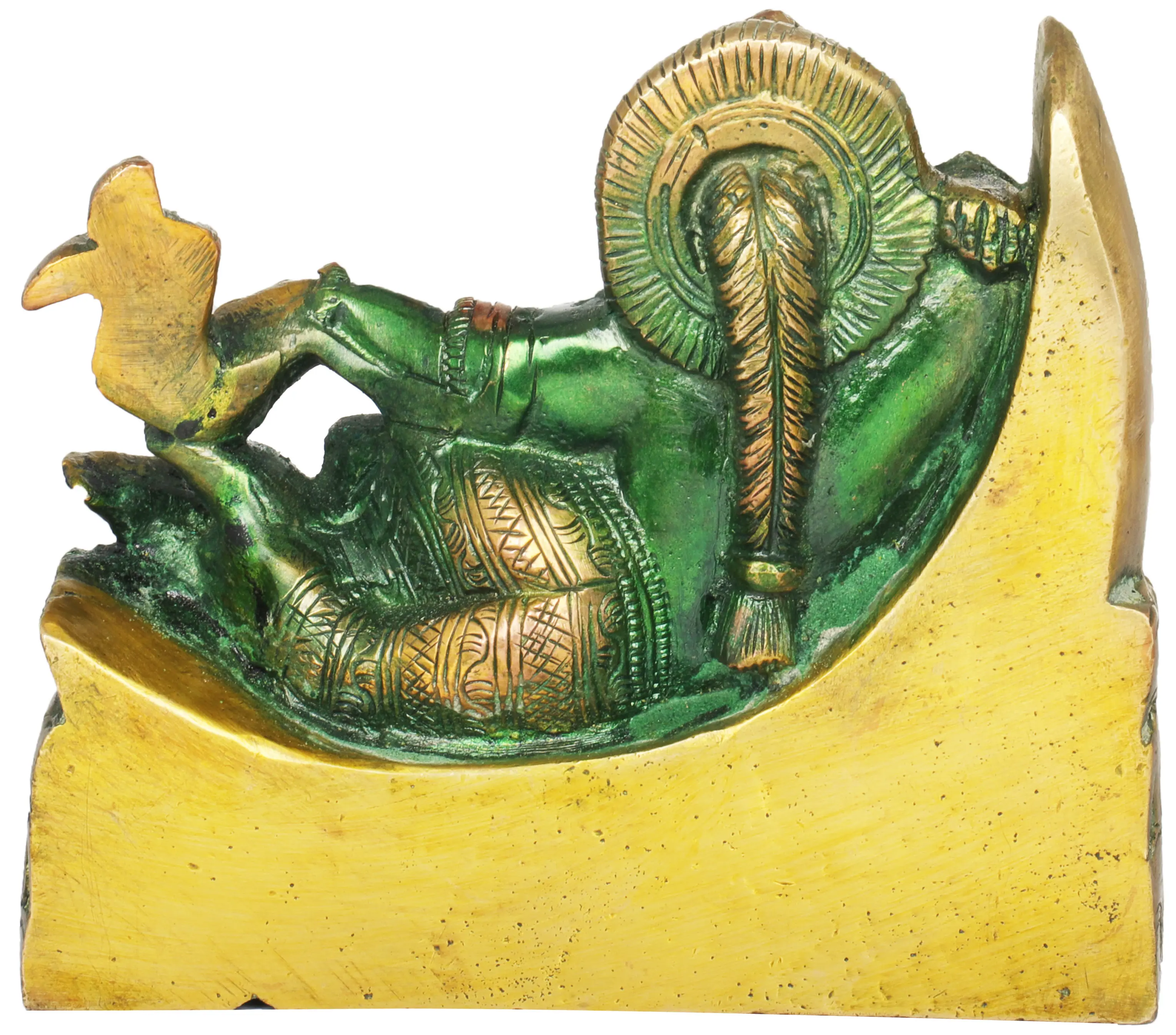 In this unique rendition, Ganesha lies gracefully on his right side, cradling his head with his right hand, resting upon the crescent moon, a symbol of purity and enlightenment. Lord Ganesha exudes a sense of serenity and calmness. This brass creation captures the essence of Ganesha’s wisdom and benevolence, symbolizing his ability to bring calmness and serenity to the chaotic and challenging aspects of life. This mesmerizing artwork encourages you to seek balance and harmony amidst life’s ups and downs, invoking Ganesha’s blessings for success and prosperity.