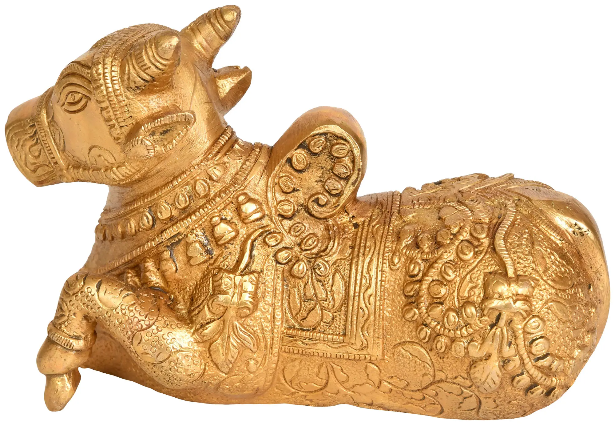 Seated with regal poise, this brass Nandi's posture evokes a sense of readiness and dedication. His strong shoulders and gently sloping back tell tales of the burdens he carries – not only as a vehicle for the divine but also as a metaphor for the burdens we all bear in our mortal lives. His eyes, serene and watchful, seem to hold the wisdom of ages, a silent testimony to his role as an intimate witness to the cosmic unfoldings of Lord Shiva.