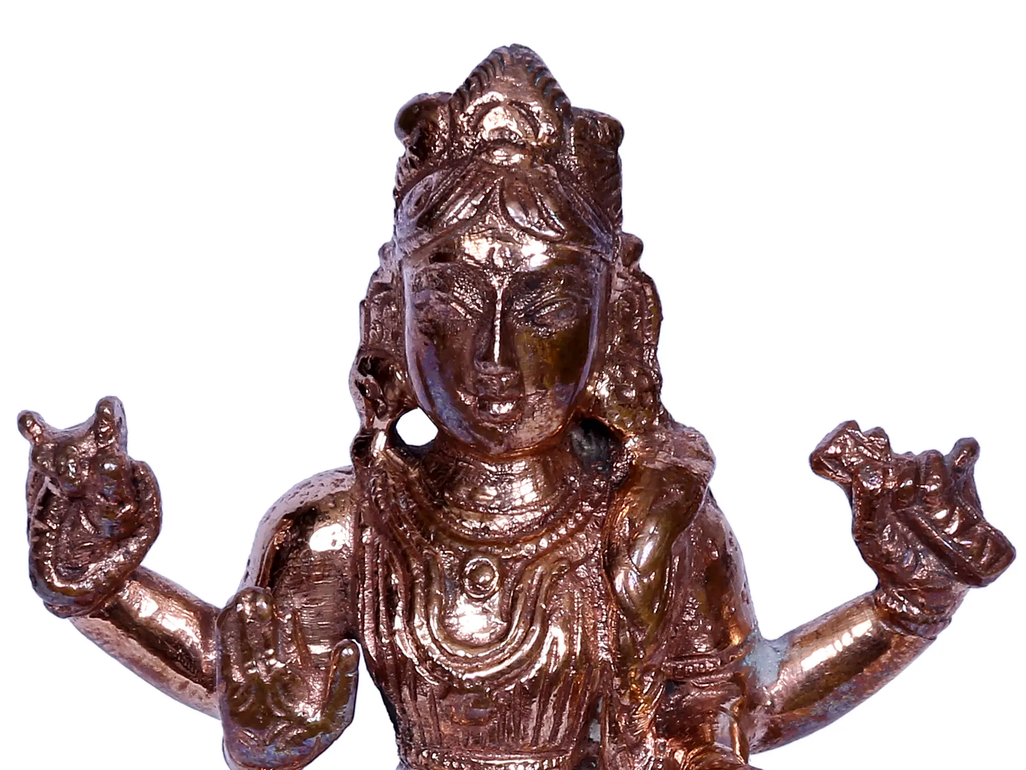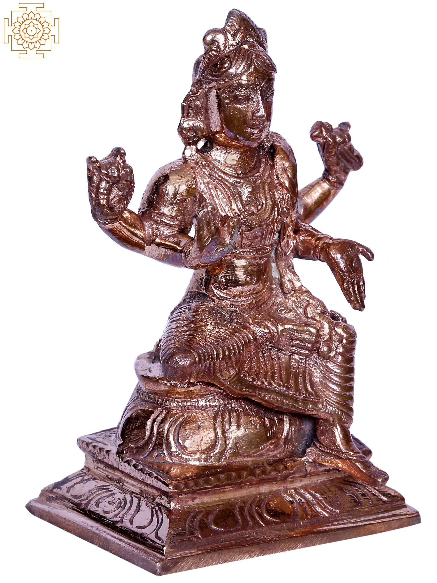 “Balambika”- bal or young, Ambika or mother goddess, is a unique aspect of Parvati’s form as Tripurasundari, the most beautiful woman in three realms. Revered popularly in Southern India and Shakta-Tantra tradition, Balambika is an eternally youthful and powerful sixteen-year-old divine feminine. She is the manifestation of Parvati’s auspicious and supreme beauty which she was bestowed with by Shiva, a beauty that never fades. Pure and potent, Balambika is worshipped by devotees to receive boons of Roopa (beauty) and Saubhagya (fortune). In this bronze statue, goddess Balambika is represented in her characteristic form, as a 16-year-old girl, attired in a lovely saree, with her hair in a charming braid. Chaturbhuja or four-armed, Balambika carries a book and rosary in her hand as symbols of spiritual powers, and has her primary hands in Varada and Abhaya mudra, the gesture of giving boon and dispelling fears.