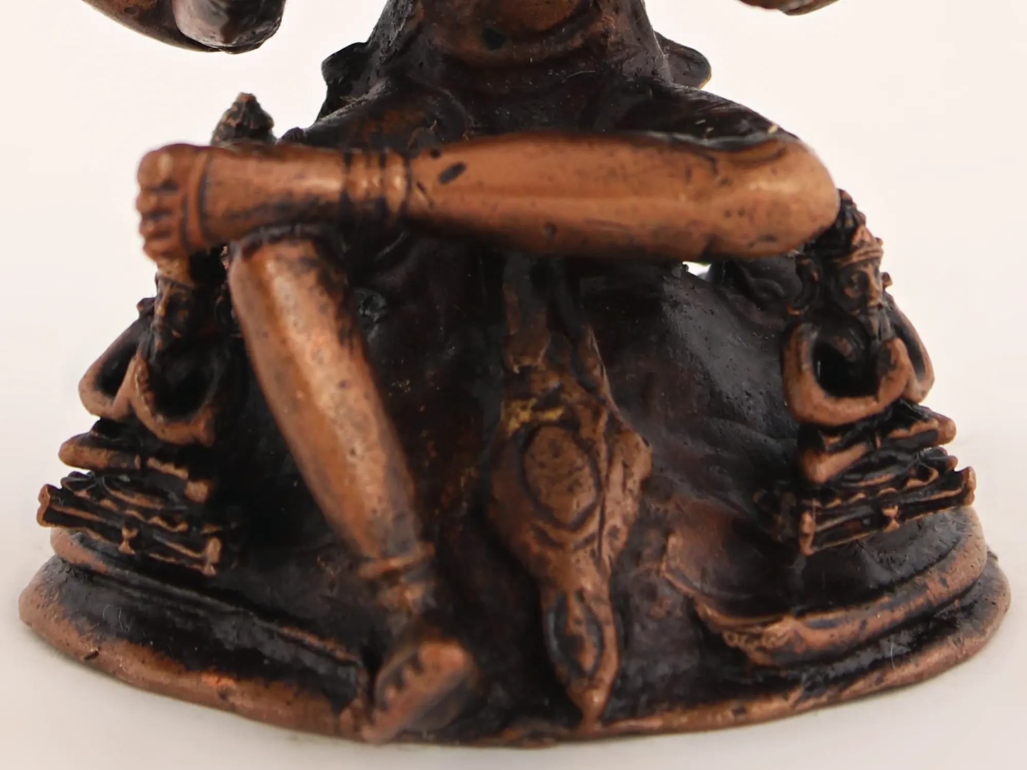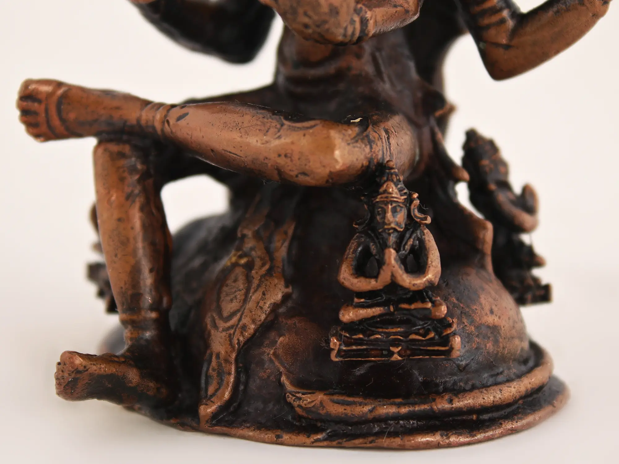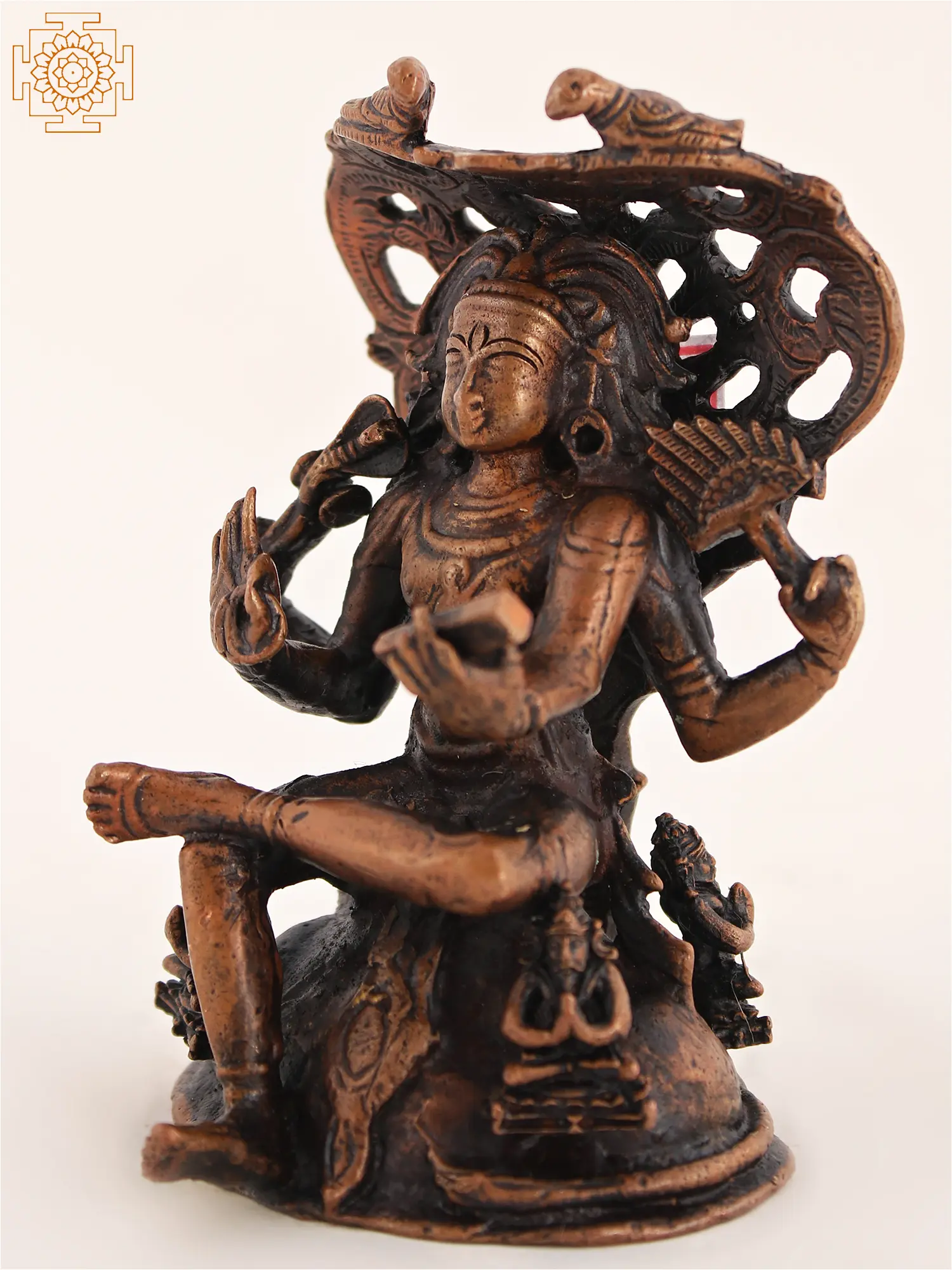Emanating royalty with his Lalitasana posture and supreme asceticism with his mediative expressions, Shiva as Dakshinamurty, the supreme Guru pervades this small copper statue in all his glory. Four-armed, Shiva is surrounded by sages who sit beneath him, basking in the wisdom that flows from his presence. Adorned with Jatamukuta, shaded by a Banyan tree, Shiva carries an animation in his visage, which is suggestive of his presence in this idol.