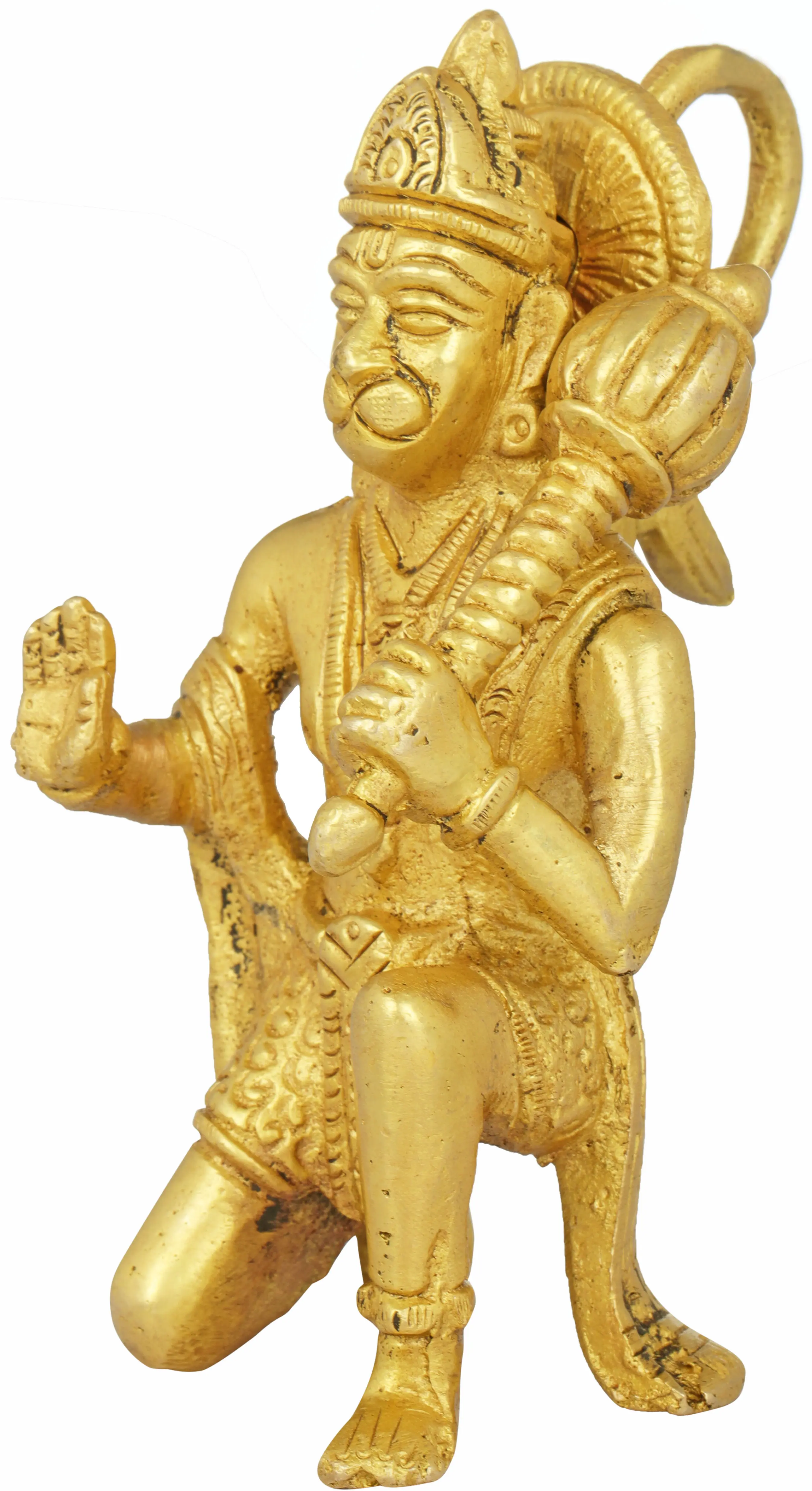 In this mesmerizing rendition, Lord Hanuman is depicted with one knee raised while the other leg rests on the ground, exhibiting a posture of blessing and grace. With his right hand raised in a gesture of benediction (Ashirwad Mudra), Hanuman bestows divine blessings upon his devotees. In this iconic depiction, Hanuman Ji’s face radiates compassion and love, demonstrating his role as a compassionate and benevolent deity. Alongside his blessing posture, he holds his mighty mace, emphasizing his valor and readiness to protect his devotees from Evil forces. Crafted in Brass with devotion, this stupendous artwork is a spiritual treasure, symbolizing strength, and echoing Hanuman Ji’s unwavering determination.