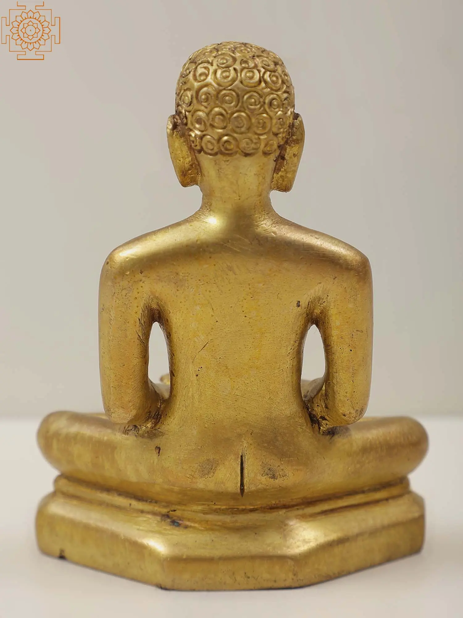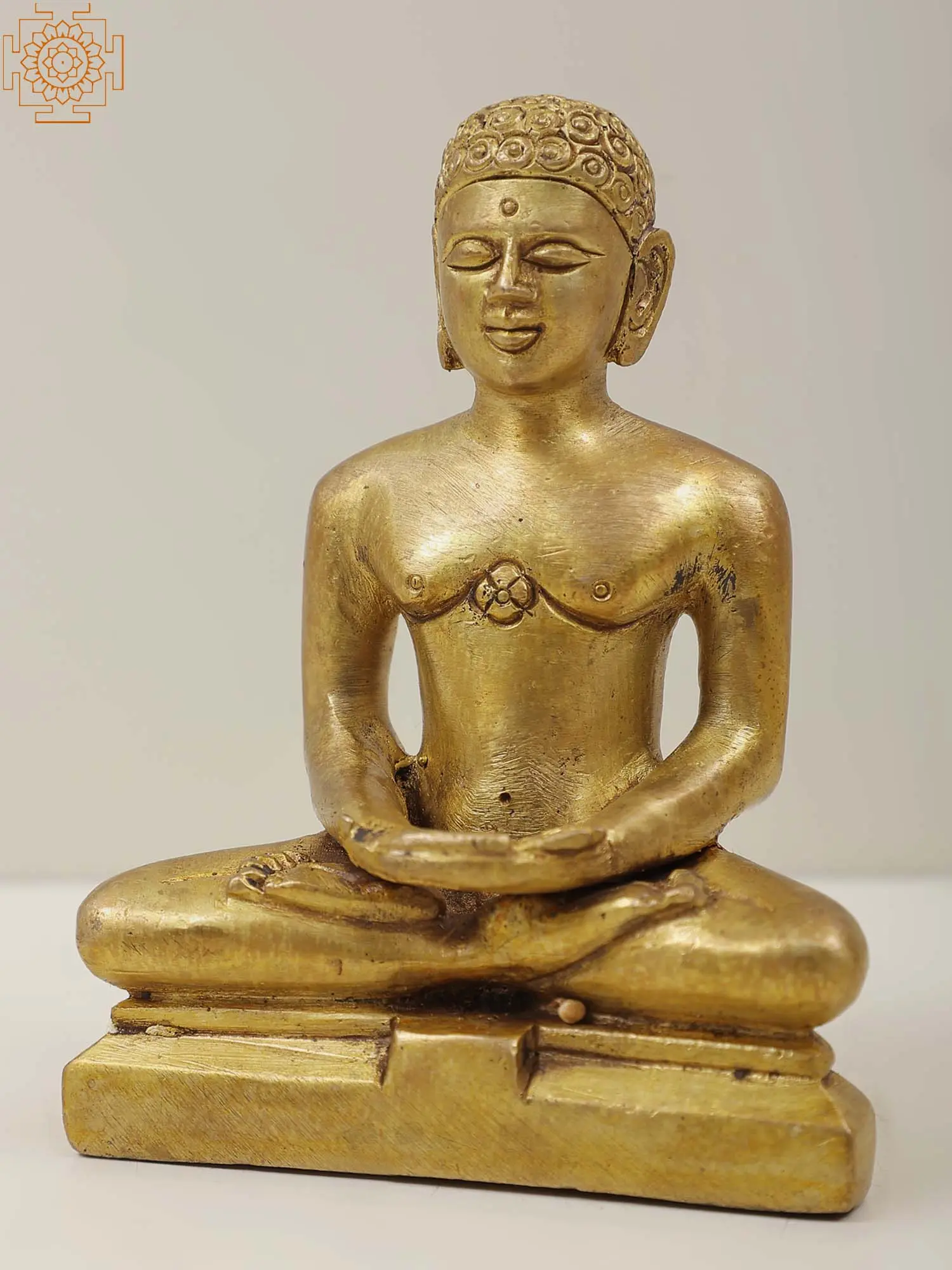 "The soul knows no birth or death." This minutely detailed brass sculpture embodies the enlightened spirit of a Jain Tirthankara, a liberated soul who guides others toward liberation. With serene eyes gazing inward, the Tirthankara's deep meditation resonates. The hand gestures symbolize fearlessness, detachment, and spiritual enlightenment. Adorned in simple attire, the Tirthankara emphasizes detachment from materialism. The beautiful sculpture here invites one to seek the timeless wisdom within, transcending the cycles of birth and death.