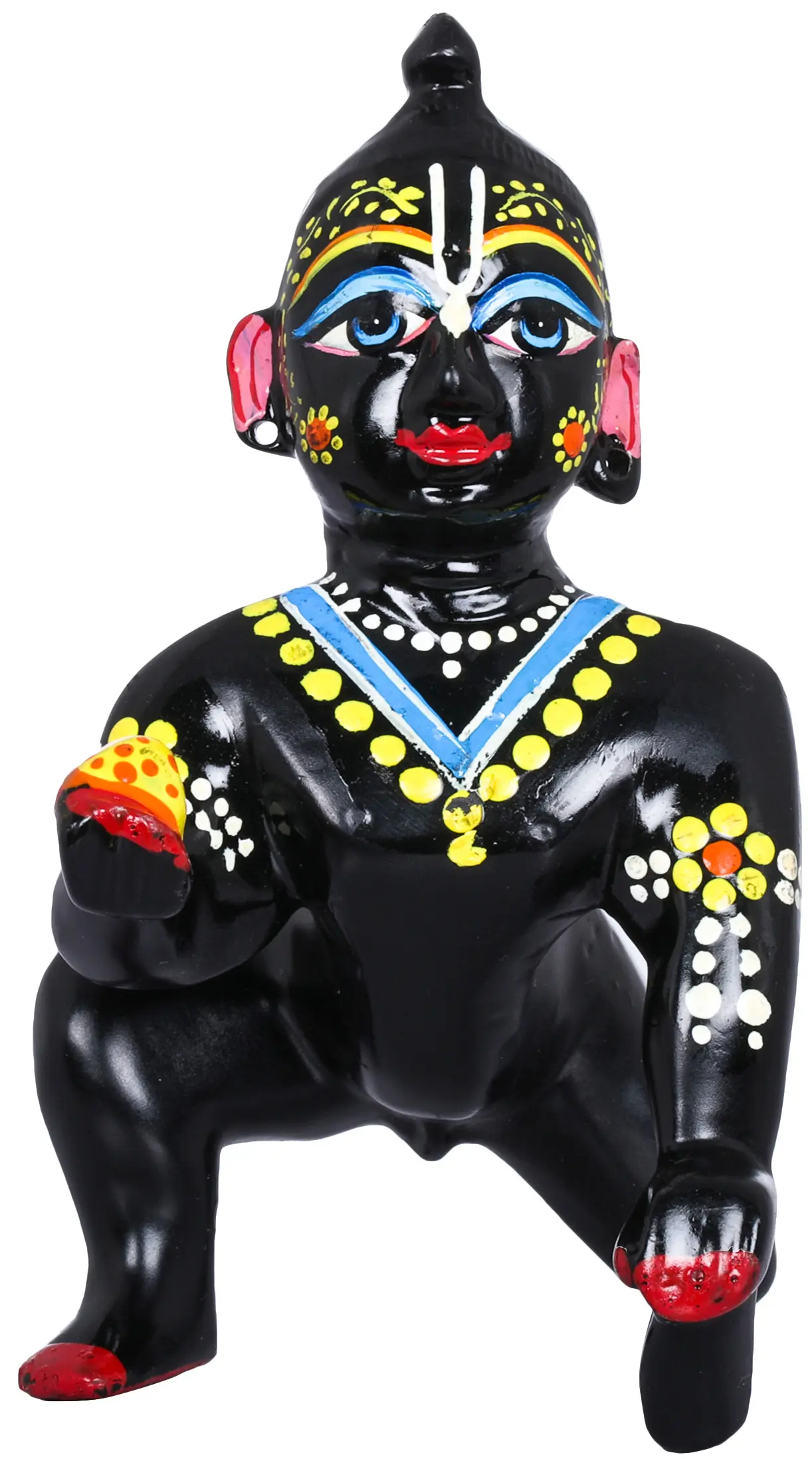 Laddoo Gopal in this brass murti handmade murti is painted in pitch black color, owing to his textual descriptions as the dark god. His one hand rests on the floor, supporting the charming physique of Krishna. His body is covered in traditional Indian motifs, flowers, white dots, and leaves. The sweet in his hand is given a yellow-orange tint. His ear, hands, and feet are painted in a pretty pink color, hinting at the lotus-like limbs of the divine child Krishna. Krishna’s face looks magnetic, his eyes blue and deep like the ocean, his lips similar to the petals of a flower, each of his features unparalleled.