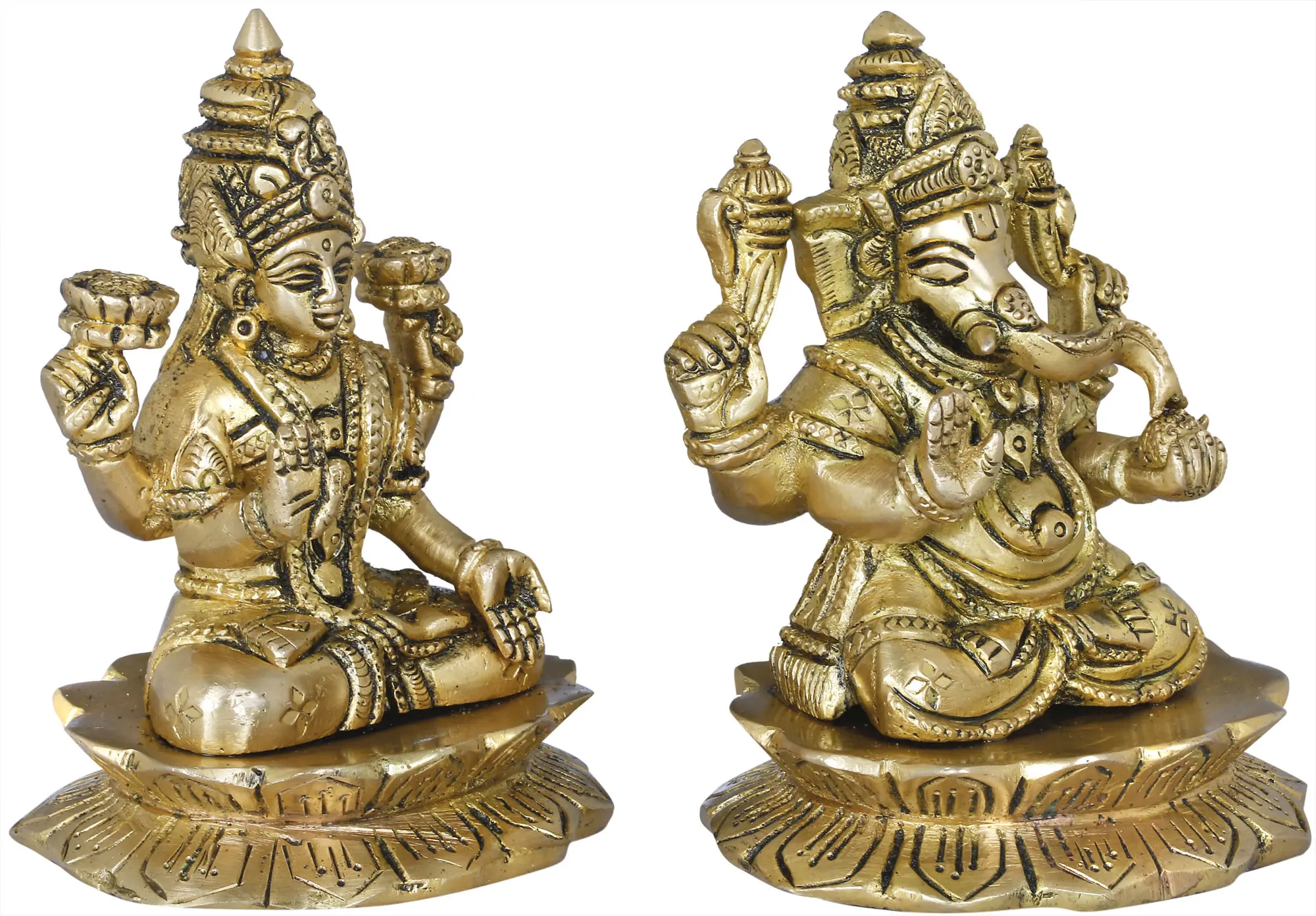 4" Lakshmi Ganesha - Small Statue Pair In Brass | Handmade | Made In India