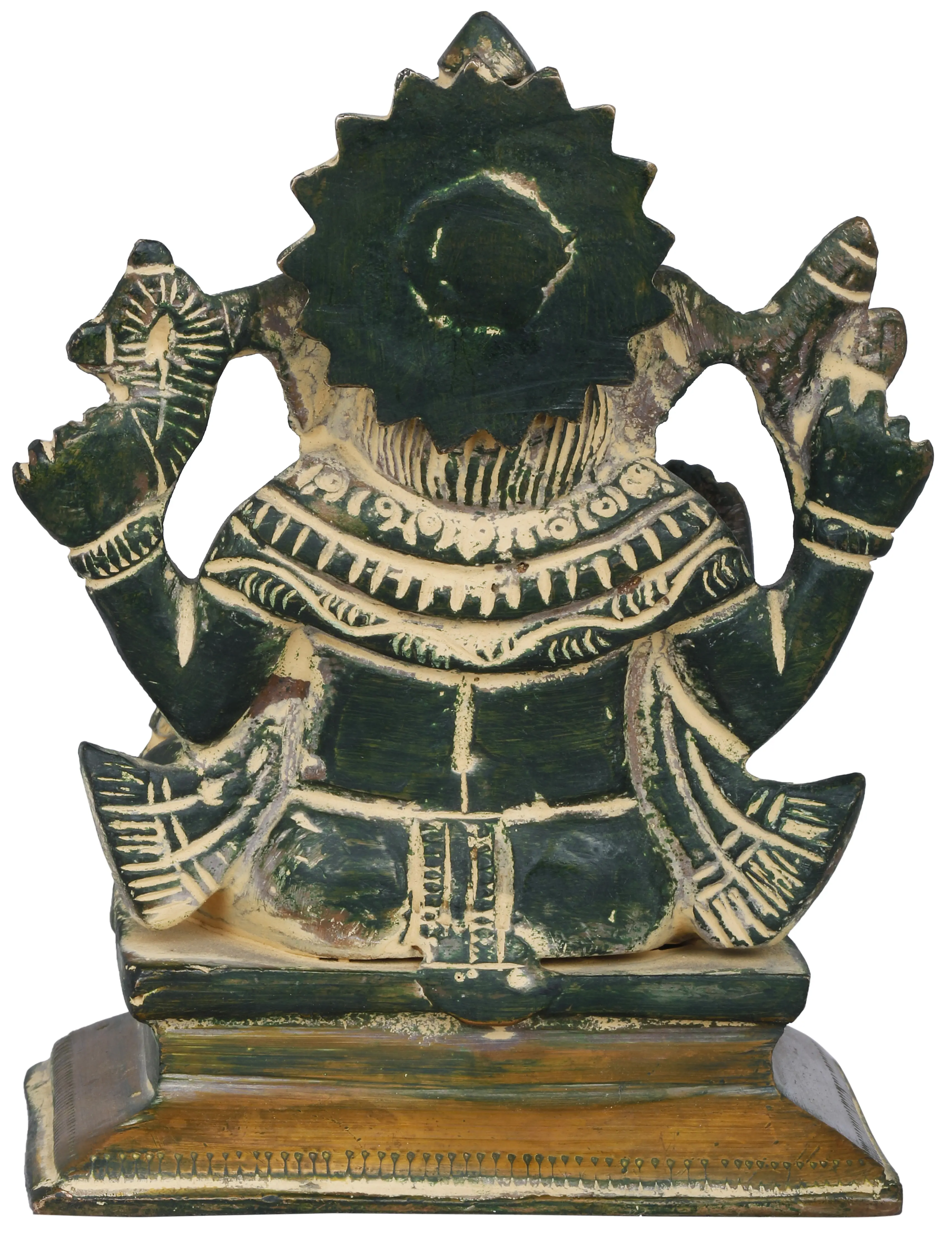 This statue is a testament to the rich heritage of Indian craftsmanship. Each piece is handmade, ensuring that no two idols are exactly alike, imbuing it with a unique character and soul. The dark, rich green hue, characteristic of aged brass, is artfully contrasted with hints of golden brass, highlighting the intricate carvings and symbolic gestures. The serene expression, the curved trunk, and the multiple arms, each holding significant symbols, are all rendered with profound respect and artistic skill. The meticulous detailing on the crown and ornaments speaks to the artisan's dedication to capturing the divine form.
