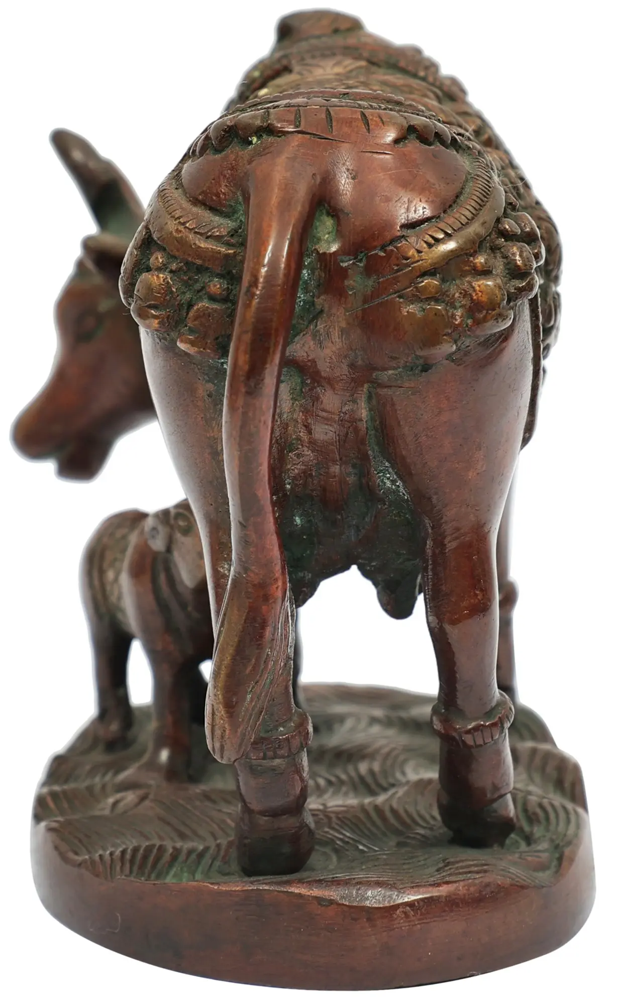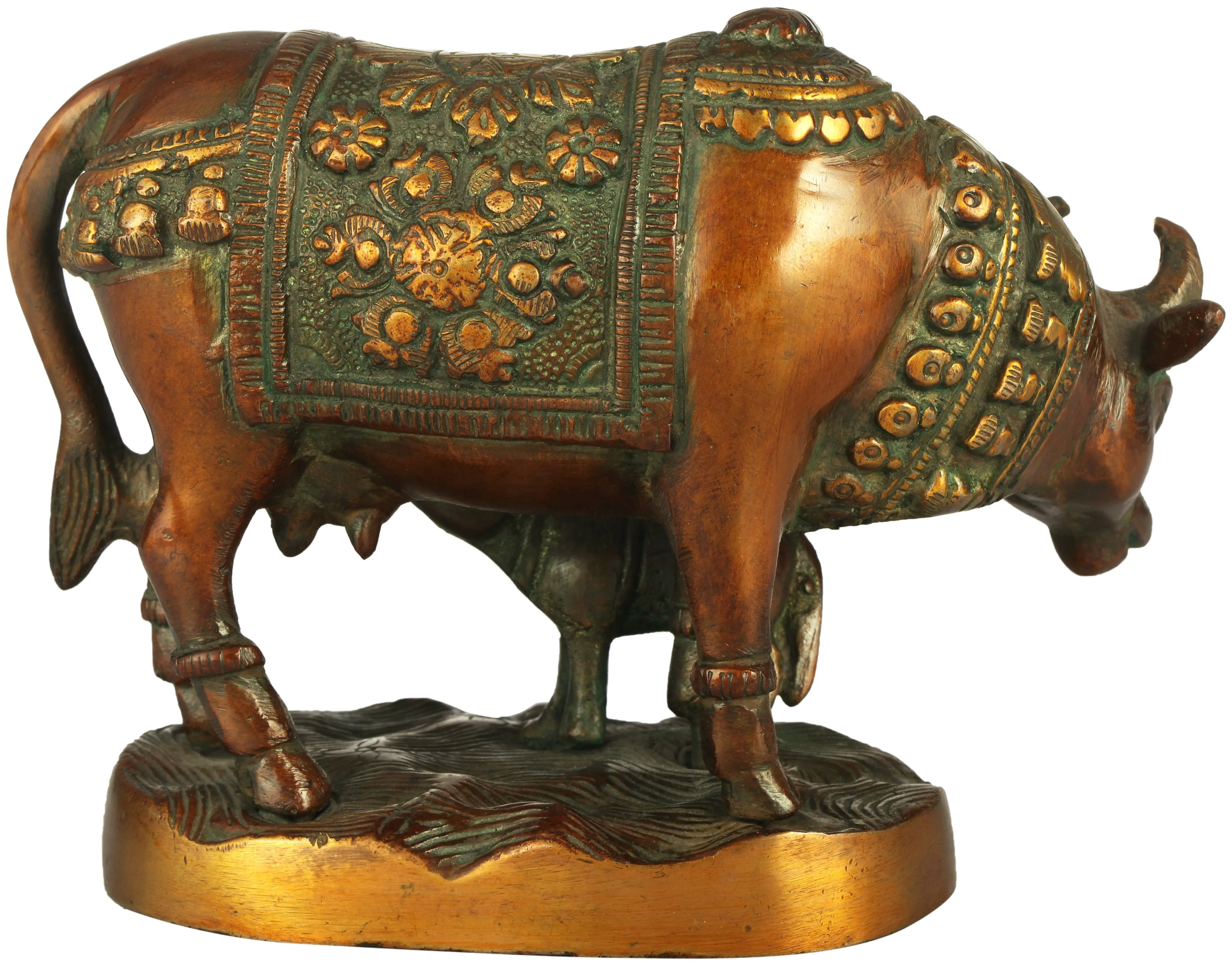 In this heartwarming sculpture, a mother cow lovingly suckles her calf, symbolizing the epitome of maternal care and nurturing. The bond between mother and calf is beautifully captured as they share this mesmerizing moment of nourishment and affection. The calf finds security and sustenance in its mother’s presence. Adorned with a beautiful robe and bells, the mother cow embodies grace and dignity, symbolizing the sacredness of the cow in various societies. This brass creation serves as a beautiful reminder of the sanctity of life, emphasizing the need to cherish and protect all living beings with the same tenderness and love exhibited by the Mother Cow.