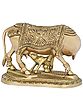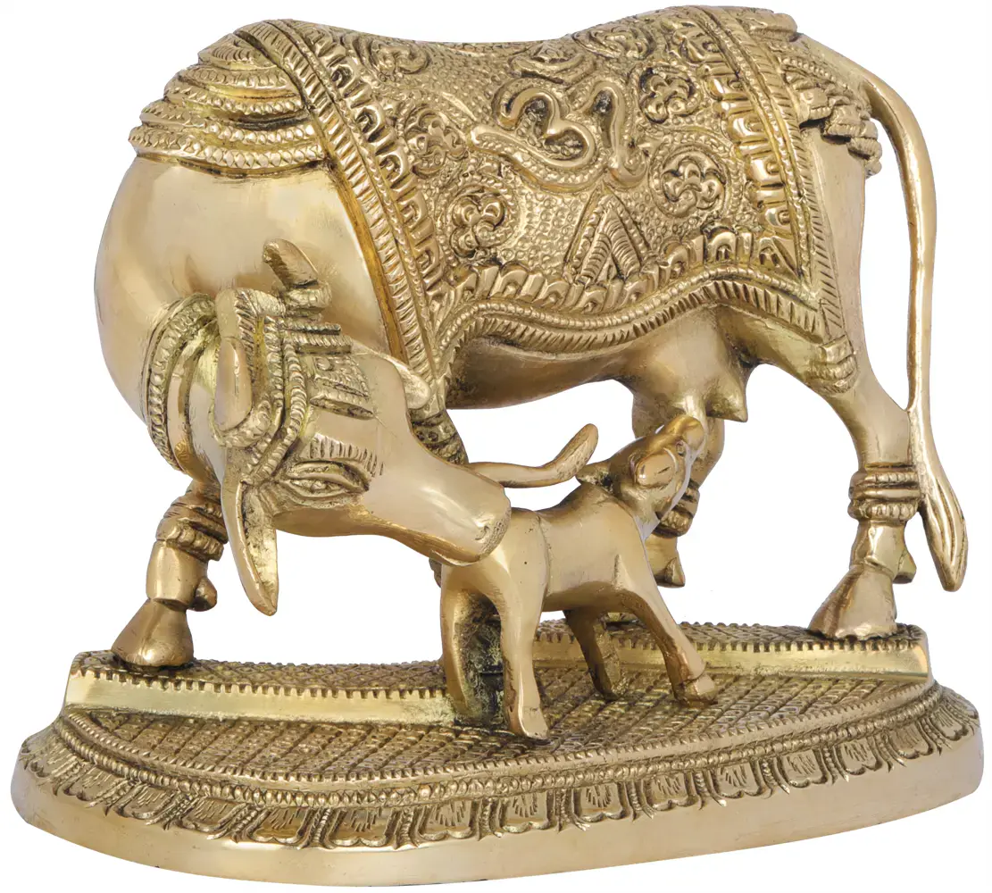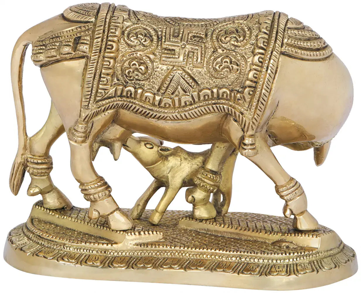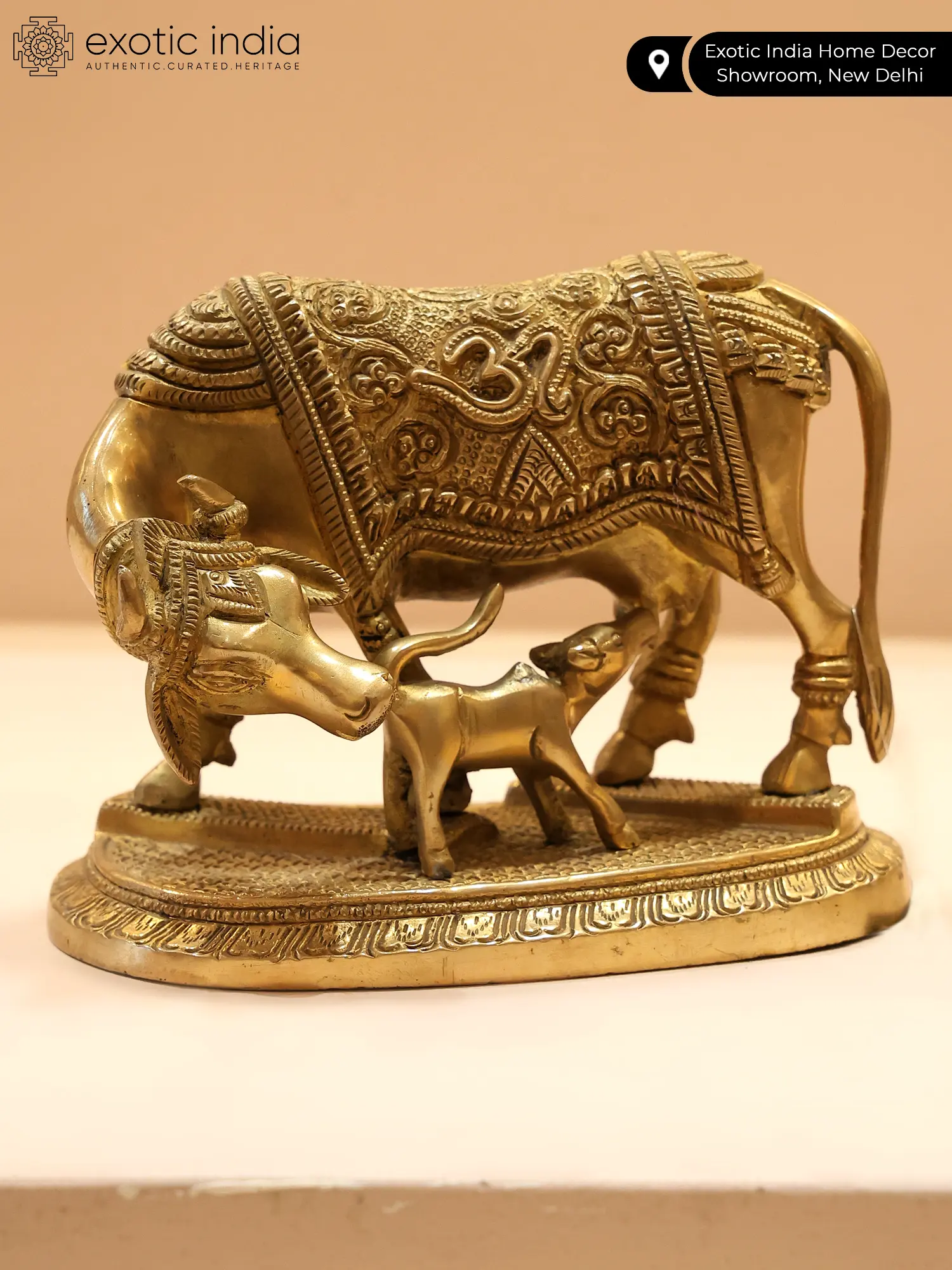 In this serene scene, “Mother Cow”, adorned in intricate robes symbolising the divine “Aum” and embodying the purity of “Satvik”, tenderly cradles her calf. This sacred bond epitomises nurturing love and sustenance. Her gaze, filled with maternal devotion, mirrors the universe’s gentleness. As she suckles her calf, she imparts life’s essential nourishment. This sacred brass artwork embodies the sanctity of life and the eternal cycle of creation. Crafted from lustrous brass, this artwork is a symbol of nurturing love and purity.