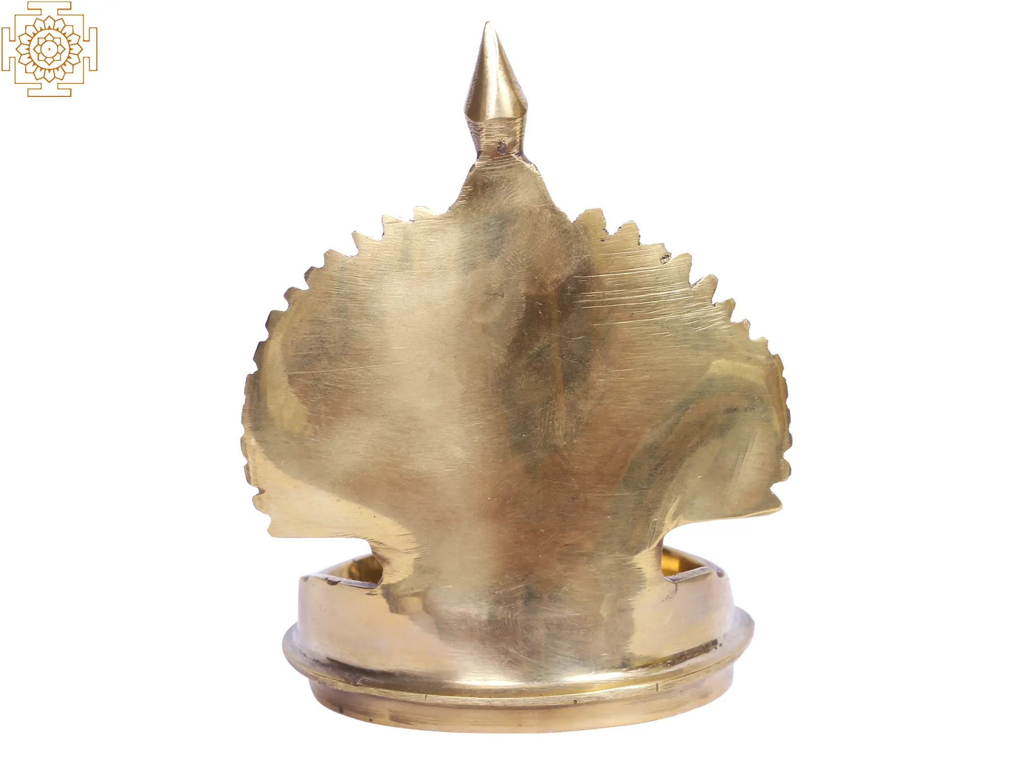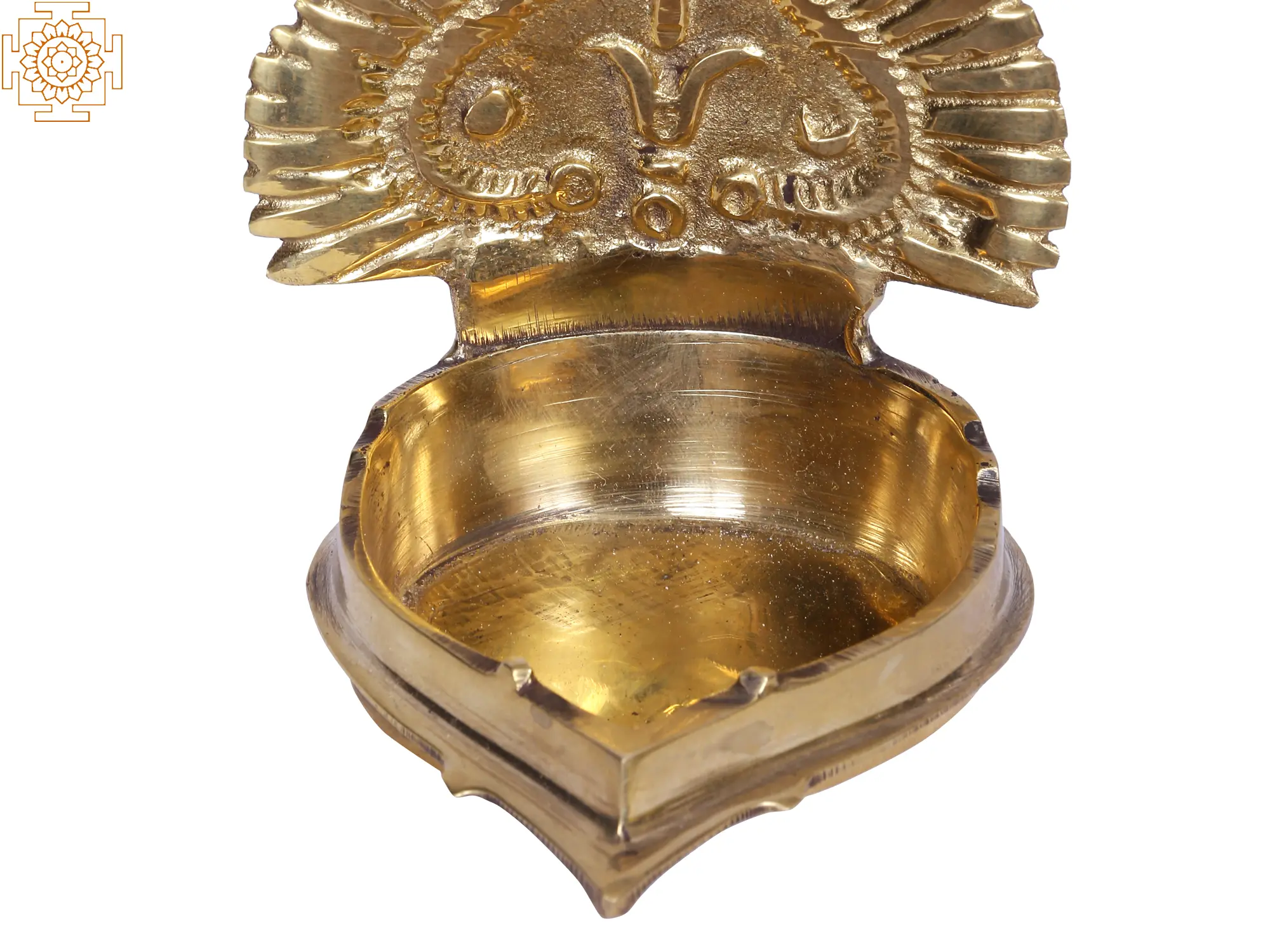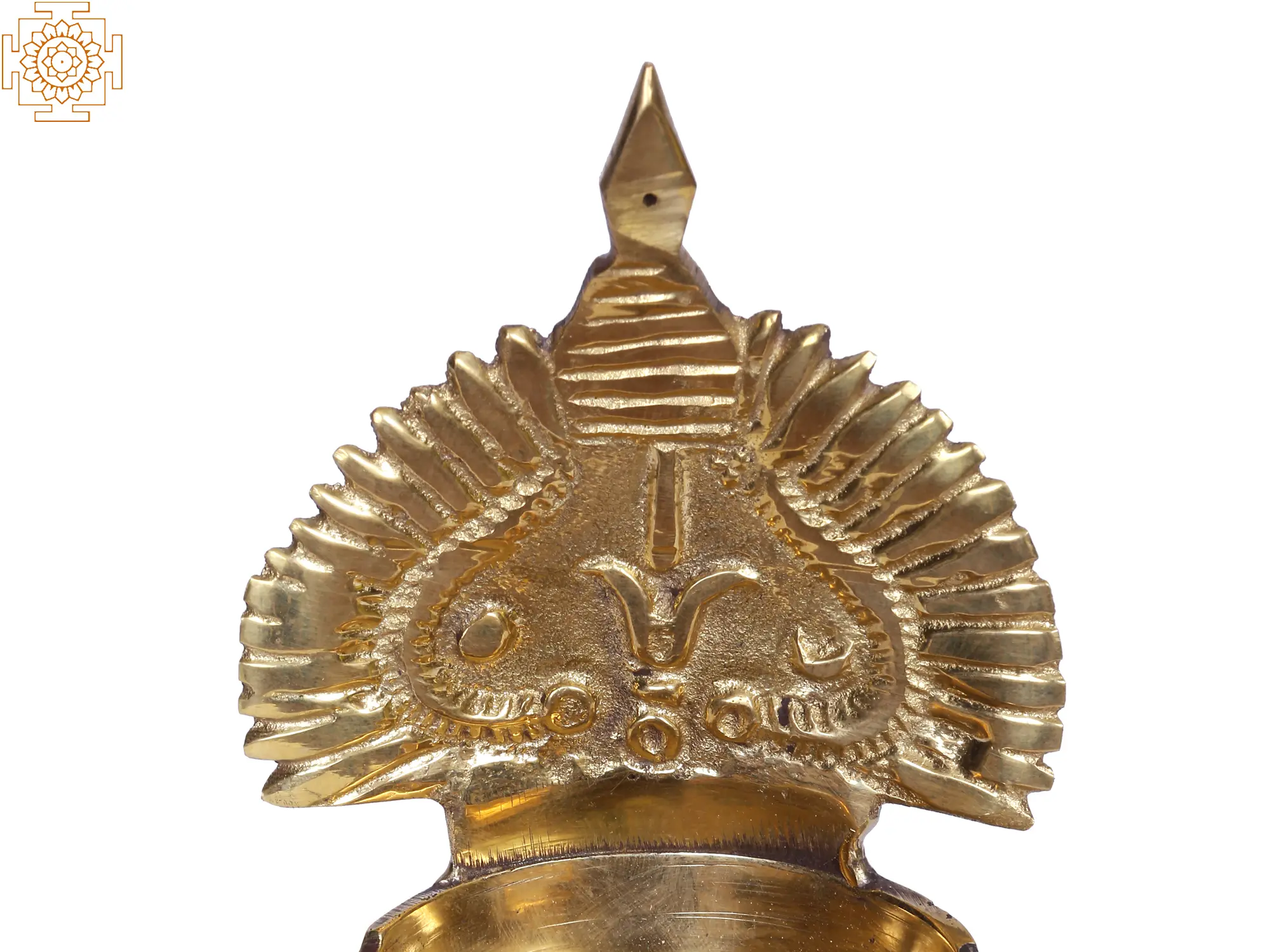 This brass oil has the auspicious emblem of Lord Vishnus Urdhva Pundra at the crown, commonly known as Vishnu Nammam or Lord Vishnu's mark. The lamp's sides feature a halo-like design and converge to form an externally projecting rim to accommodate a wick. It's a votive or floor lamp with a wide base and a traditional oil basin. It is crafted using the traditional lost wax casting method and is an item that will be passed down through generations.