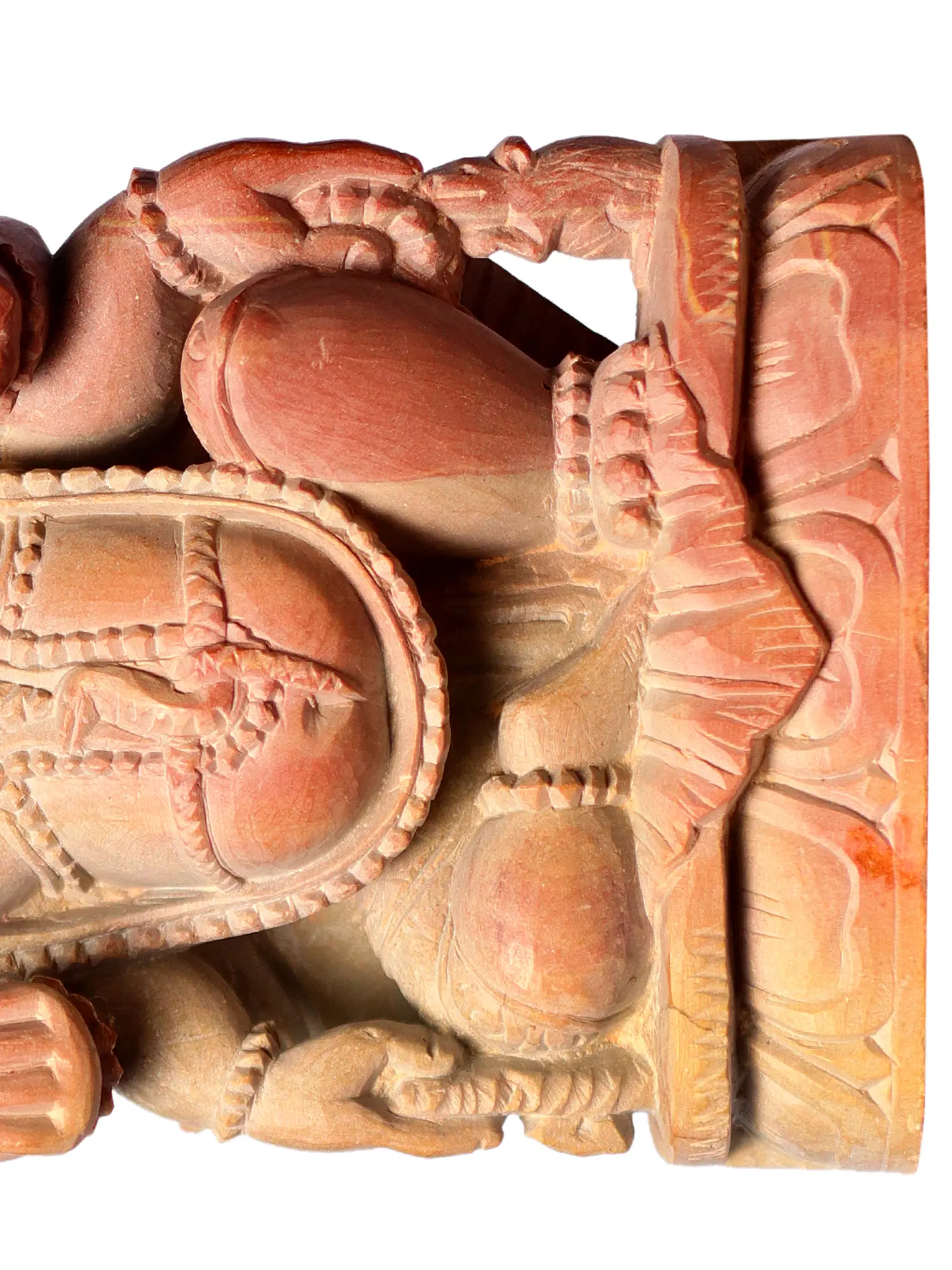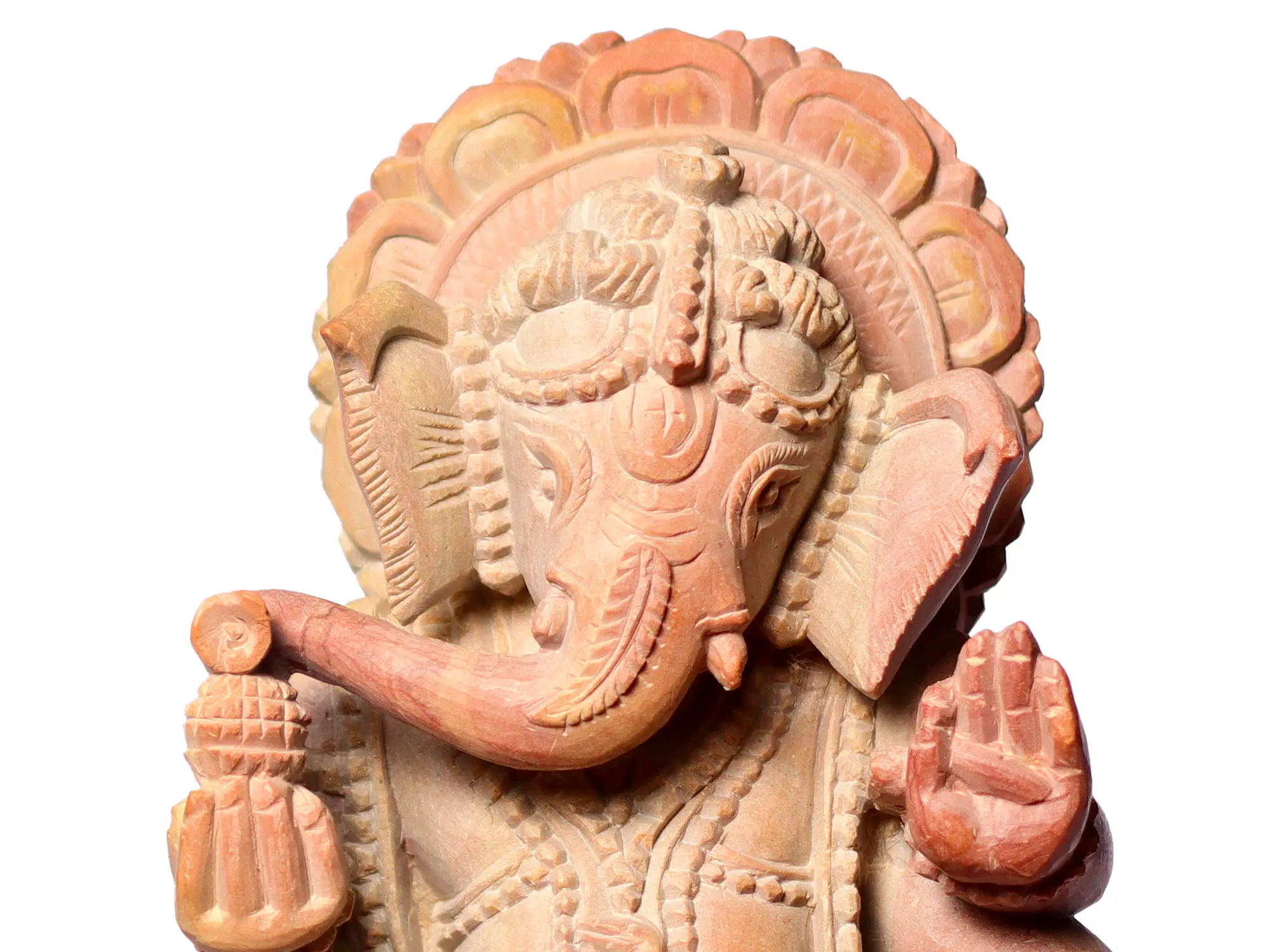 At first glance, the pink stone emanates a soft, soothing aura, symbolizing the divine love that Shri Ganesha embodies. Sitting in a relaxed posture, his stout, pot-bellied physique signifies both the material abundance of the world and the reservoir of spiritual wisdom within. Ganesha's elephant head exudes majesty, symbolizing the sheer intellect that governs the universe. In Hindu mythology, the elephant represents strength, intelligence, and memory, and Ganesha's head is a testament to his unparalleled wisdom and all-encompassing knowledge.