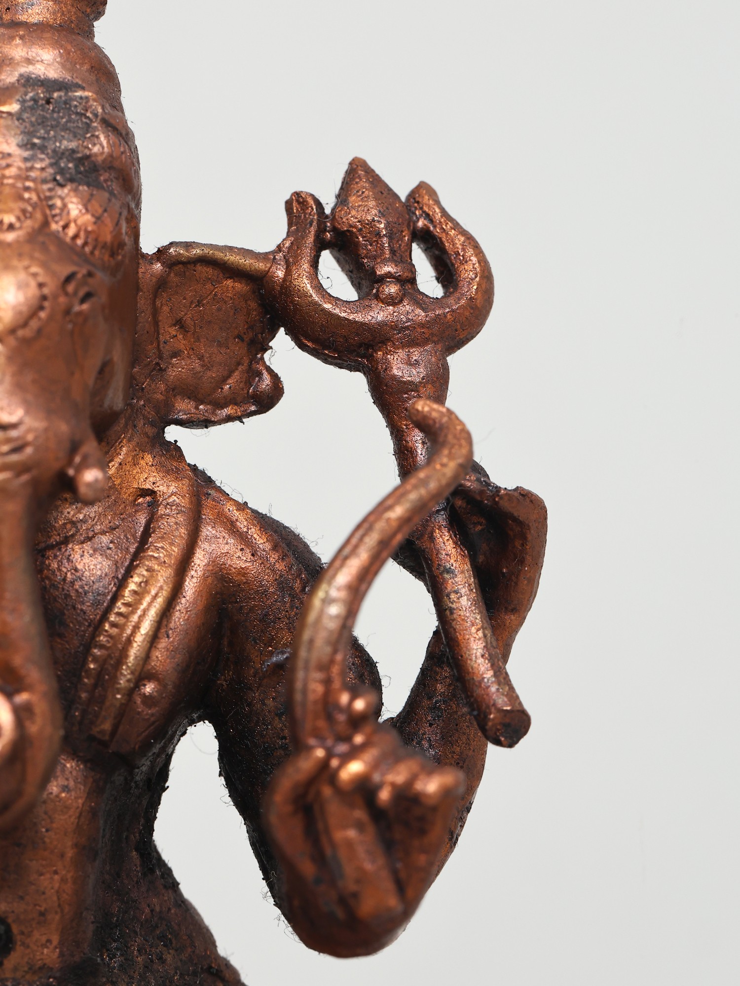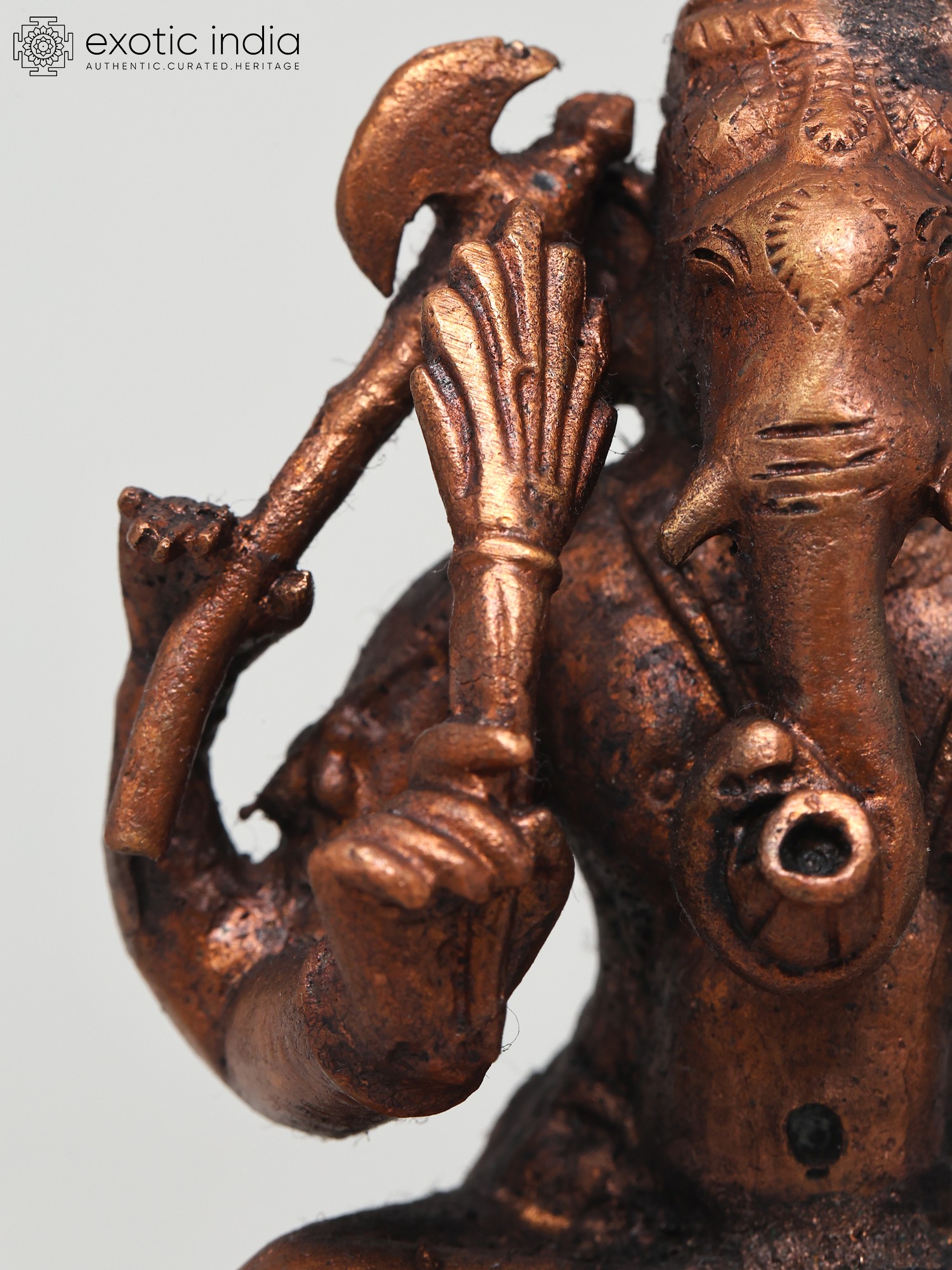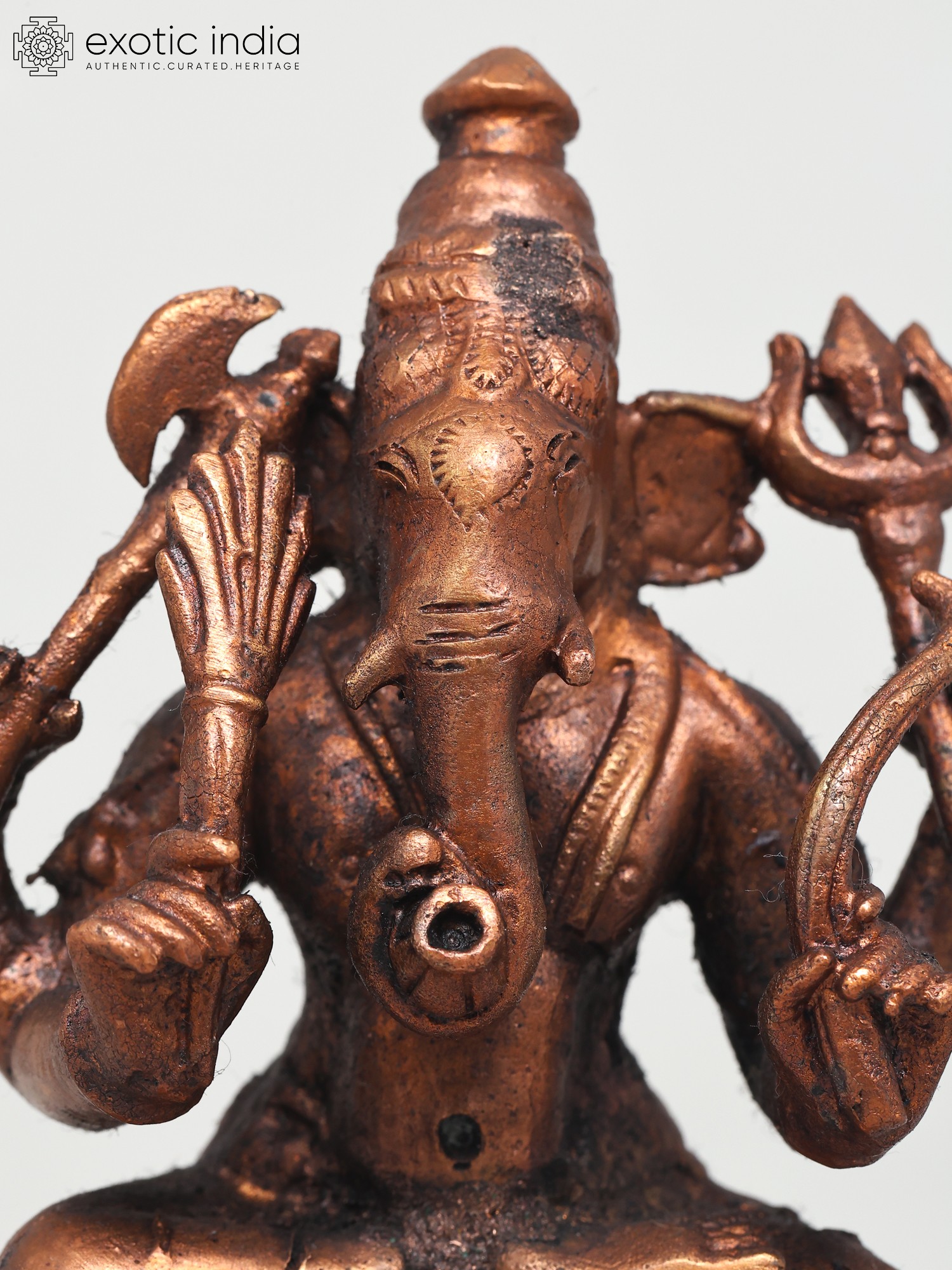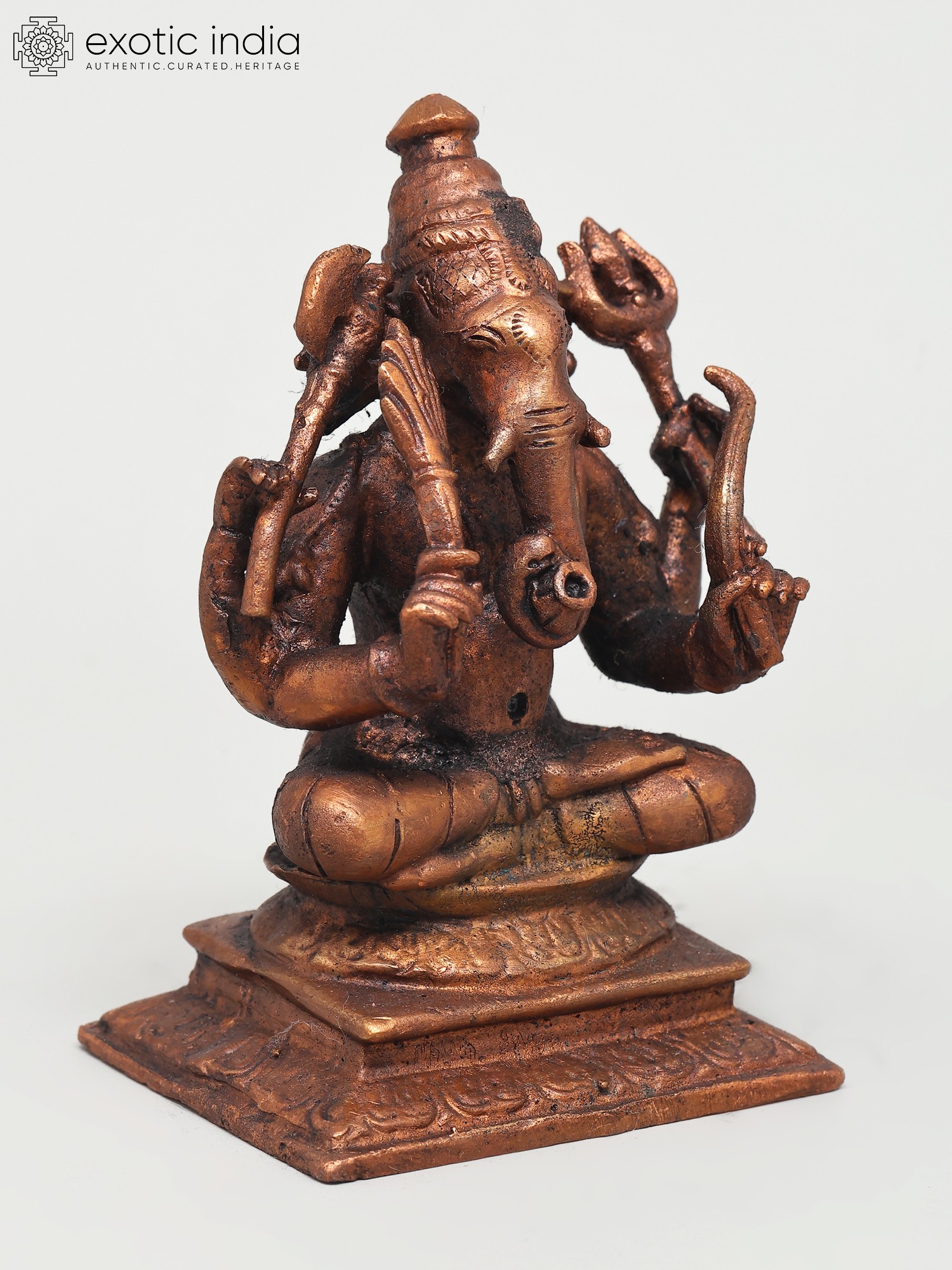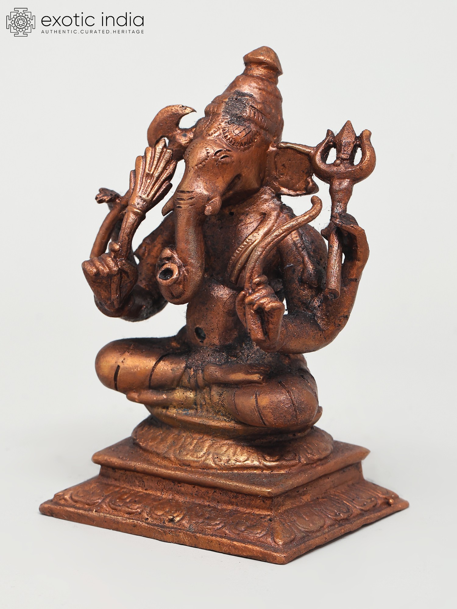 This exquisite copper idol portrays Bhagawan Ganesha, the beloved elephant-headed deity revered as the remover of obstacles and the god of beginnings. In Hindu mythology, Ganesha's unique form is said to have been sculpted by Parvati from her own divine essence, brought to life by Lord Shiva. His wisdom, auspiciousness, and ability to overcome challenges make him a central figure in countless prayers and rituals across India and beyond. This particular rendition captures the divine essence of Ganesha in a compact and beautifully crafted copper form, perfect for gracing your home altar, desk, or any sacred space.