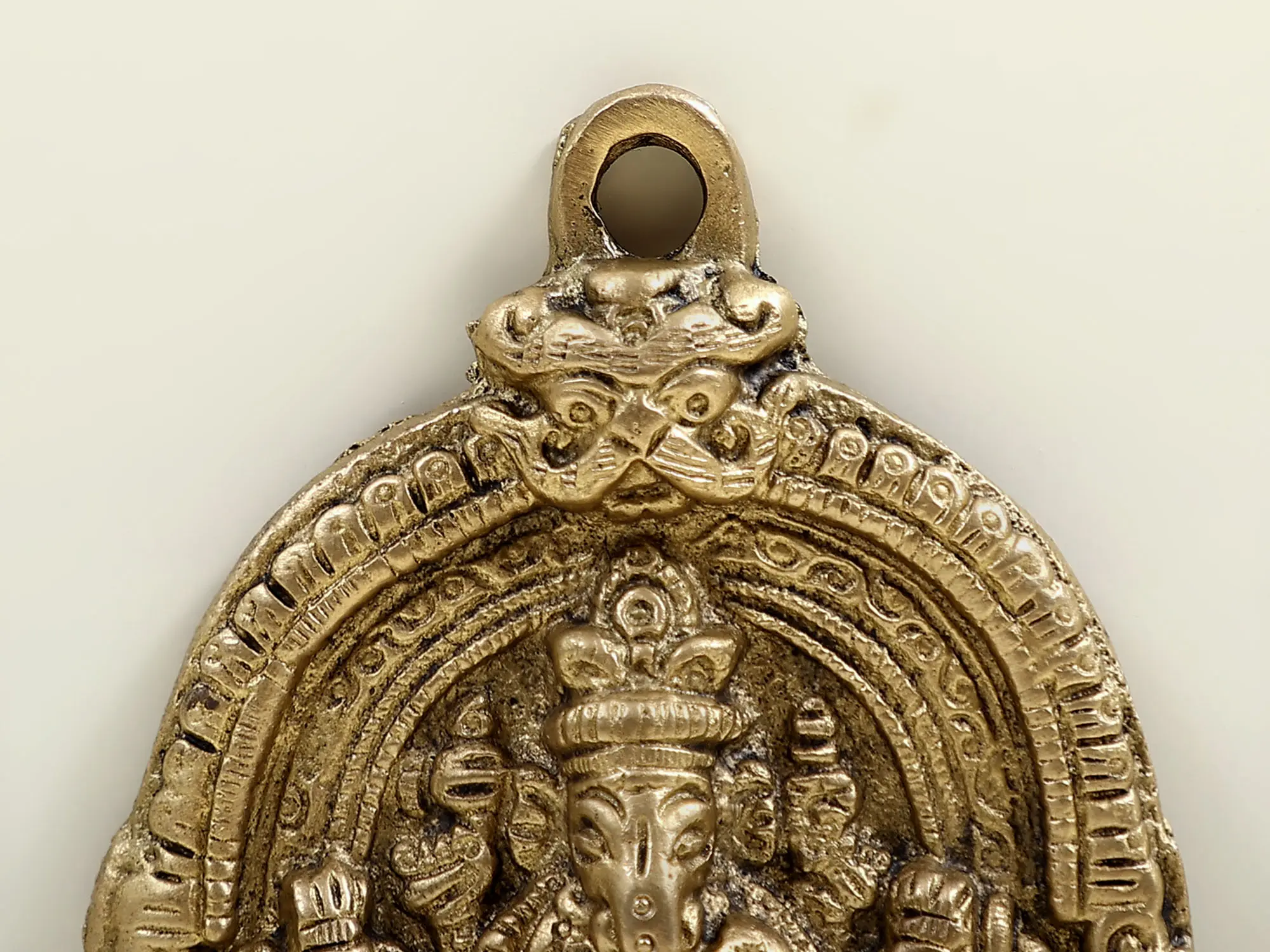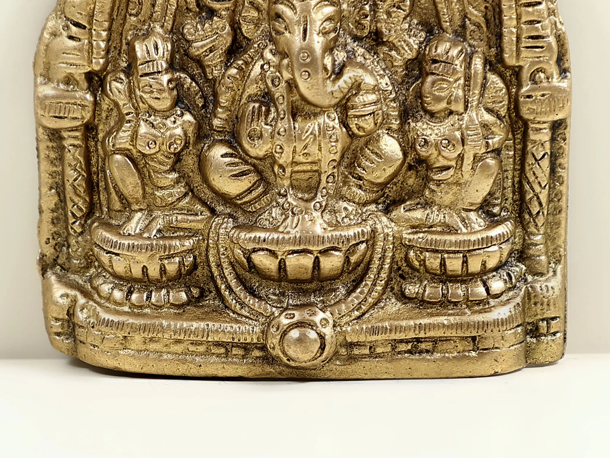 This wall hanging serves as a source of devotion and inspiration - Lord Ganesha, with his elephant head and benevolent demeanour, is revered as the guardian of beginnings, wisdom, and the remover of obstacles. Flanking Lord Ganesha are the divine consorts, Riddhi and Siddhi. Riddhi represents spiritual prosperity, while Siddhi signifies material abundance. Together, they symbolise the completeness and balance that come from divine grace.