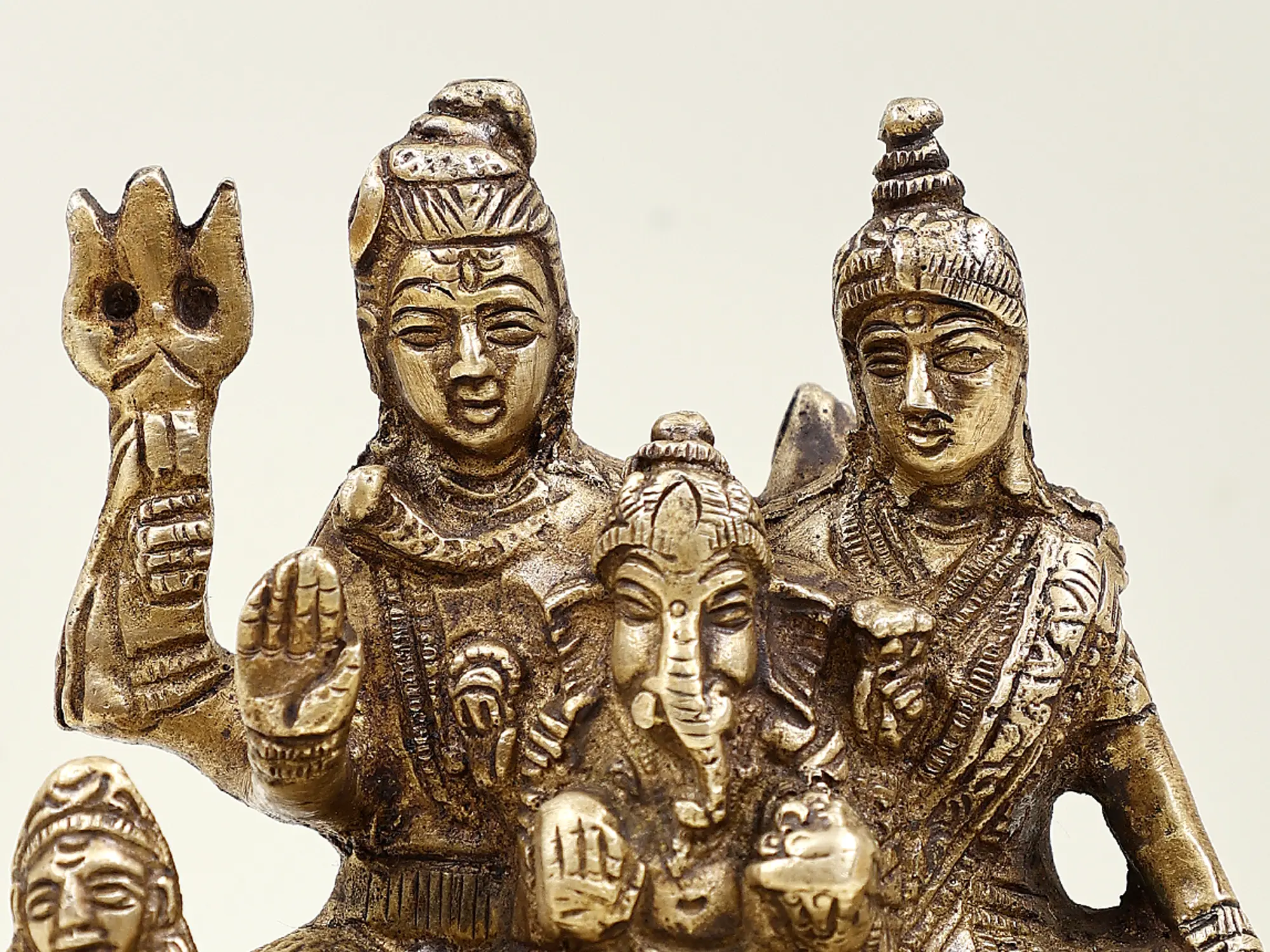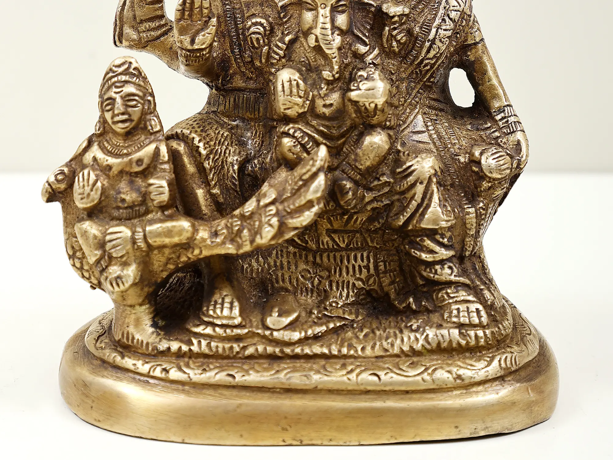 The Small Brass Shiva Parivar unveils a divine family - Shiva, Parvati, Ganesha, and Kartikeya. Shiva, the cosmic dancer, embodies creation and destruction. Parvati, his consort, symbolizes love and nurturing. Ganesha, the elephant-headed remover of obstacles, invites new beginnings, while Kartikeya, the warrior god, represents courage. Each deity's presence becomes a testament to the dynamic interplay of life's energies. Handcrafted in brass, this sculpture tells a story of unity amidst diversity. Just as the divine family thrives in harmony, so can we, celebrating our unique roles while embracing the collective tapestry of existence.
