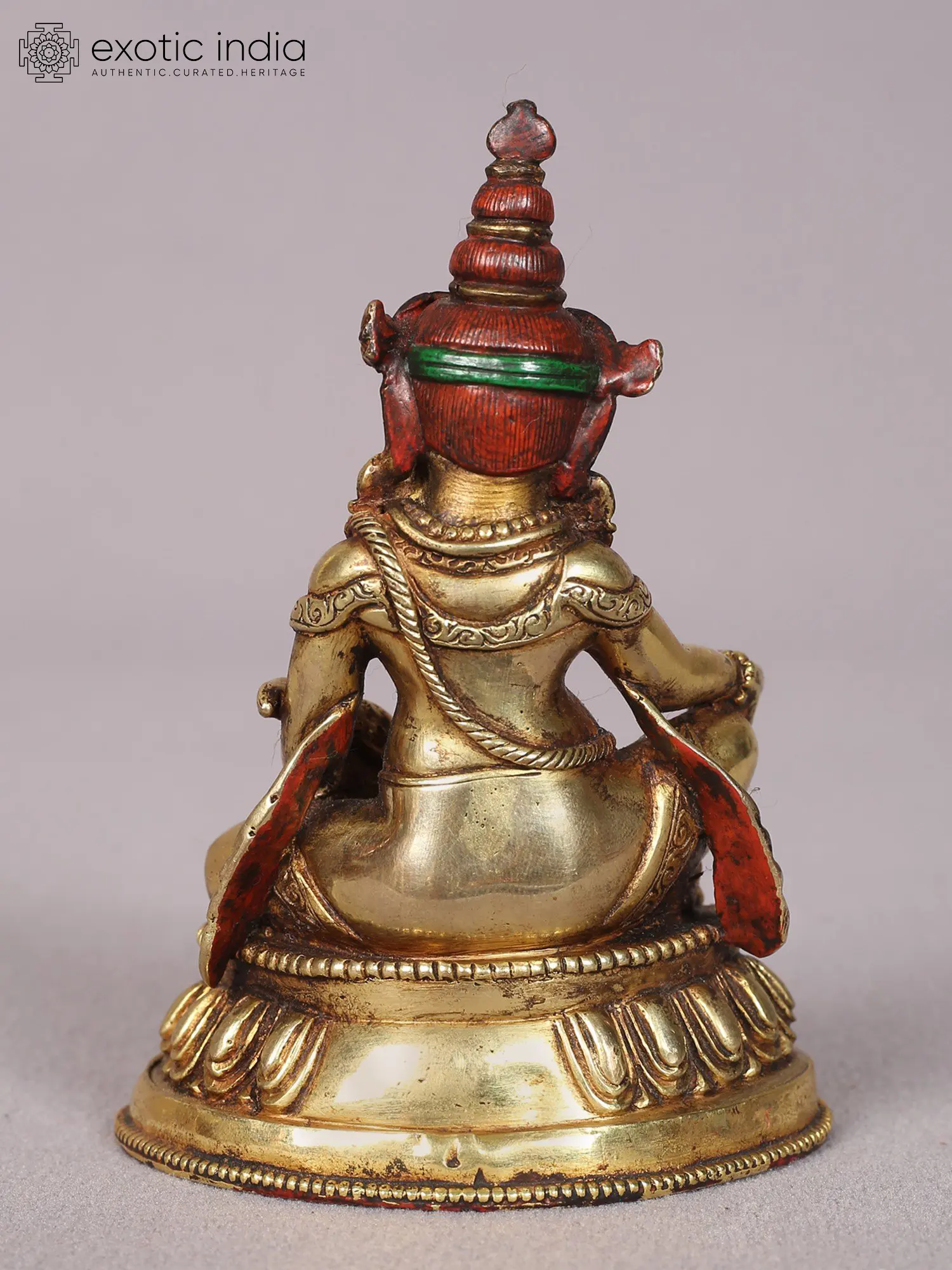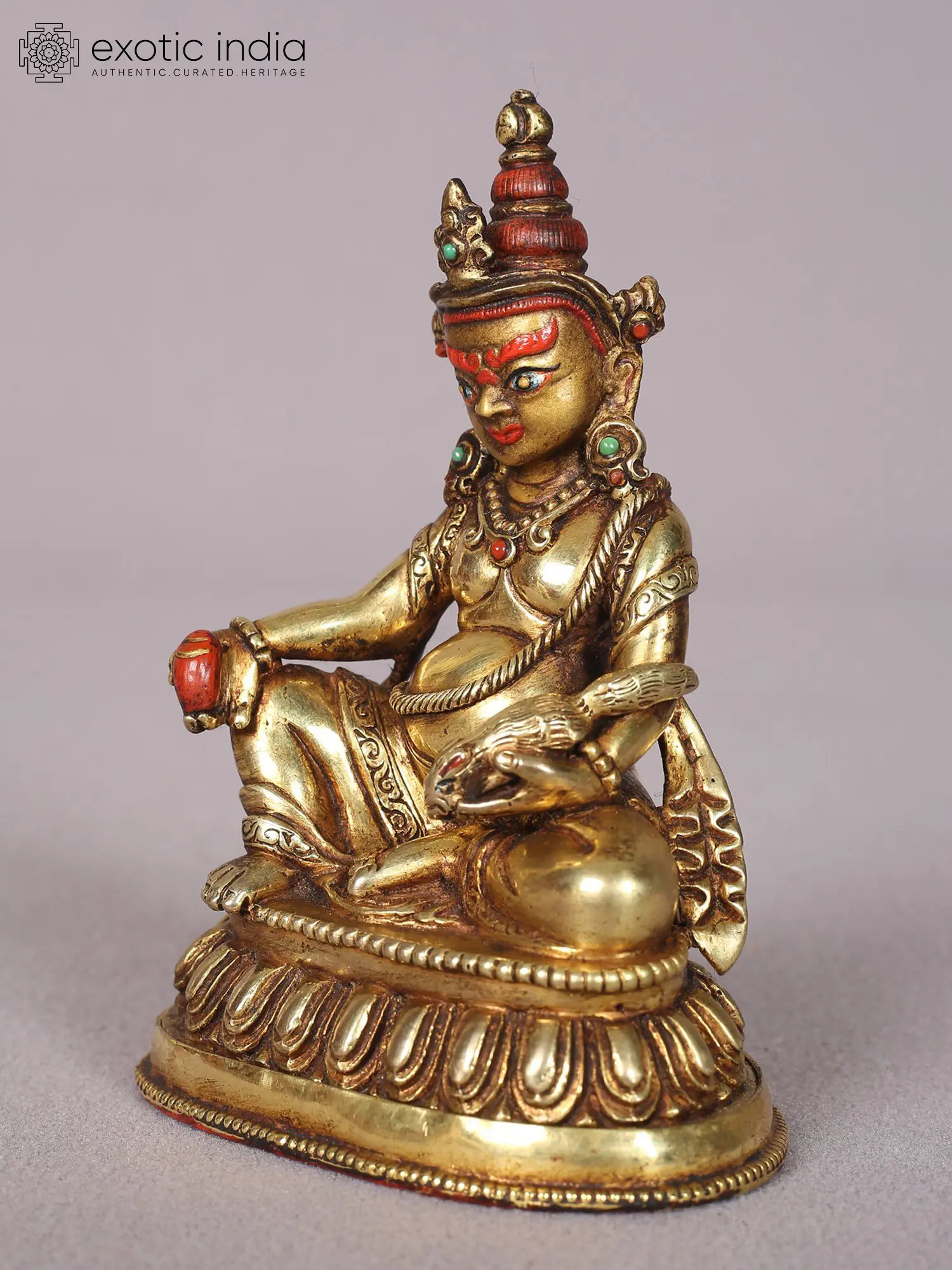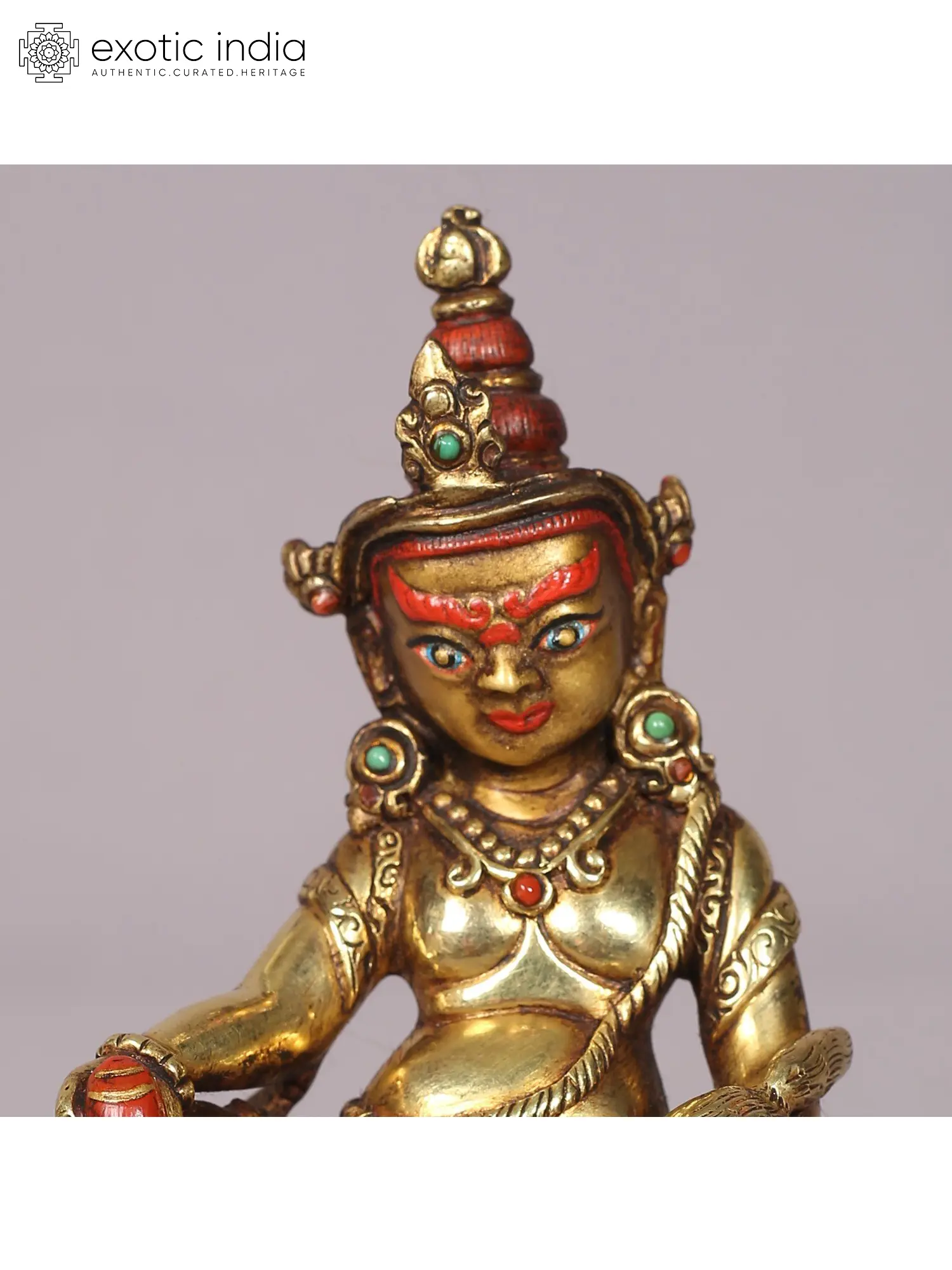 In the tradition of Buddhism, Kubera is a guardian deity who reigns over the Northern direction and he is the king of Yakshas, who bestows upon the devotees the hidden riches of the world. The copper Kubera statue here presents the Lord in his characteristic form, sitting on an inverted lotus with his mongoose in his hand. The Maharajalilasana posture of Kubera, the use of gold layering on copper, and finer details on his countenance emphasize the divinity of Yaksharaja, who resides in one's home as the source of heavenly abundance.