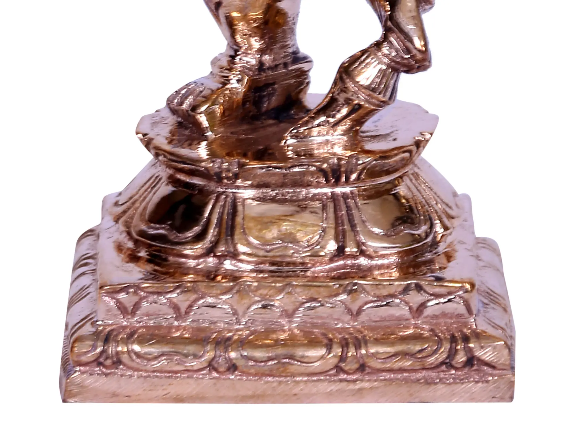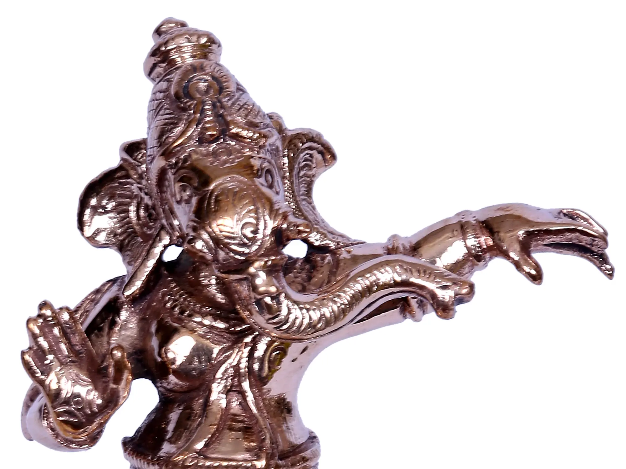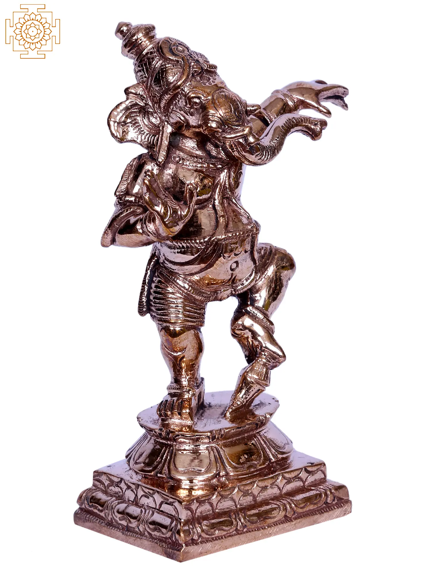 The Dancing Ganesha bronze statue, embodying the liveliness of Nritya Ganapati, exudes a divine aura. The elephant-faced Lord strikes a marvelous pose, one foot gracefully on a lotus, the other raised in the air. With a hand gesturing to Abhaya, symbolizing fearlessness, he removes negativity from the ambiance. This small yet enchanting statue captures the dynamic spirit of Ganesha in every detail, inviting worshippers to revel in the joy of his celestial dance. As a symbol of divine grace and remover of obstacles, the Dancing Ganesha brings a sacred presence, infusing spaces with positive vibrations and the energy of eternal bliss.