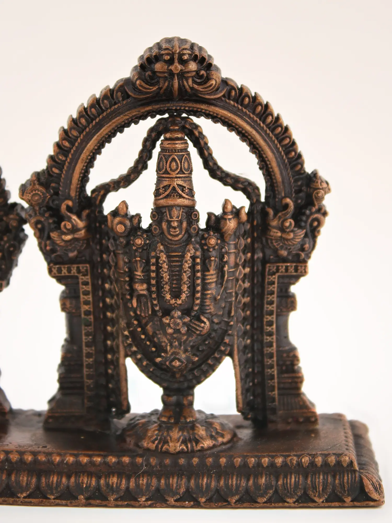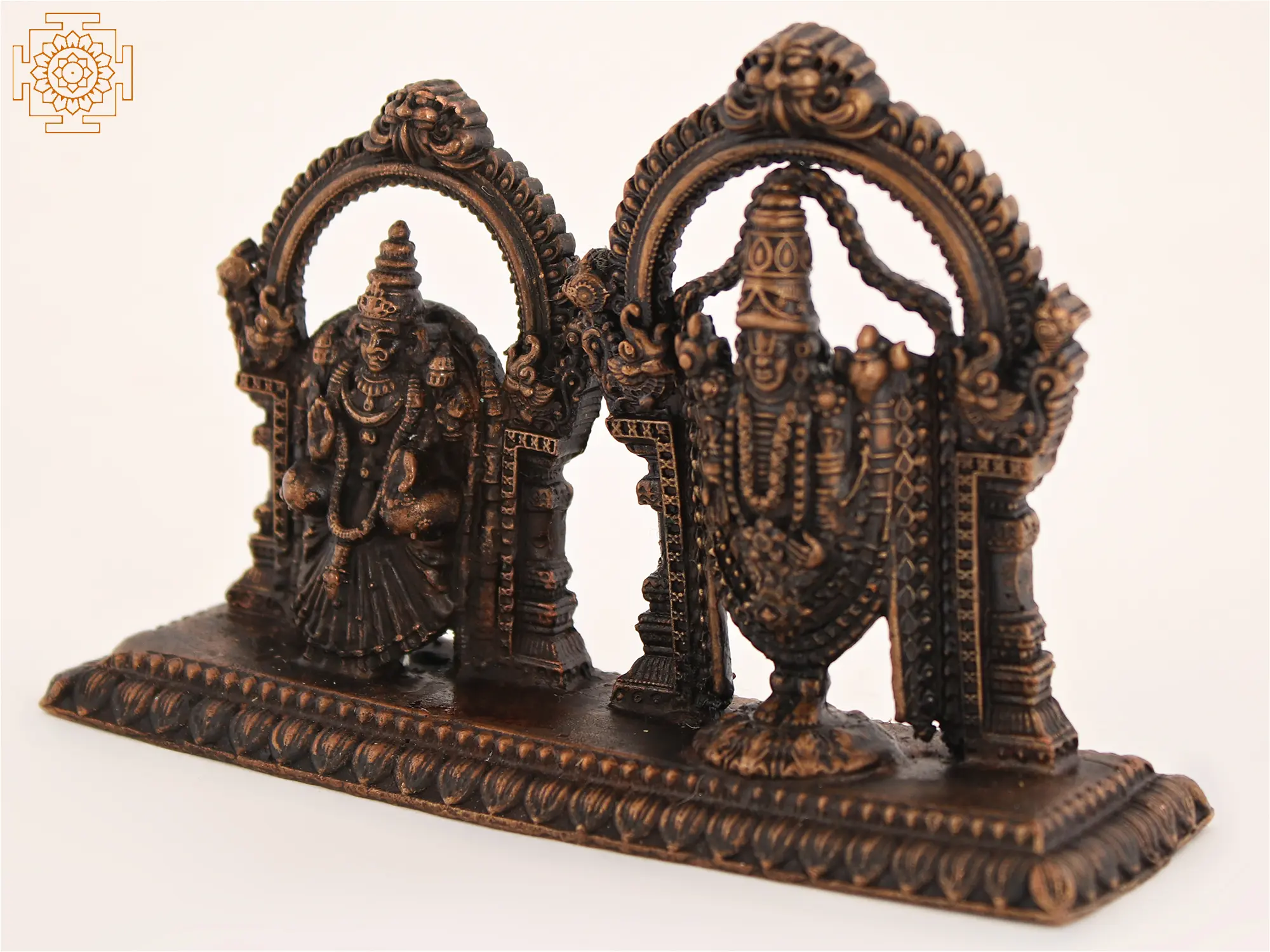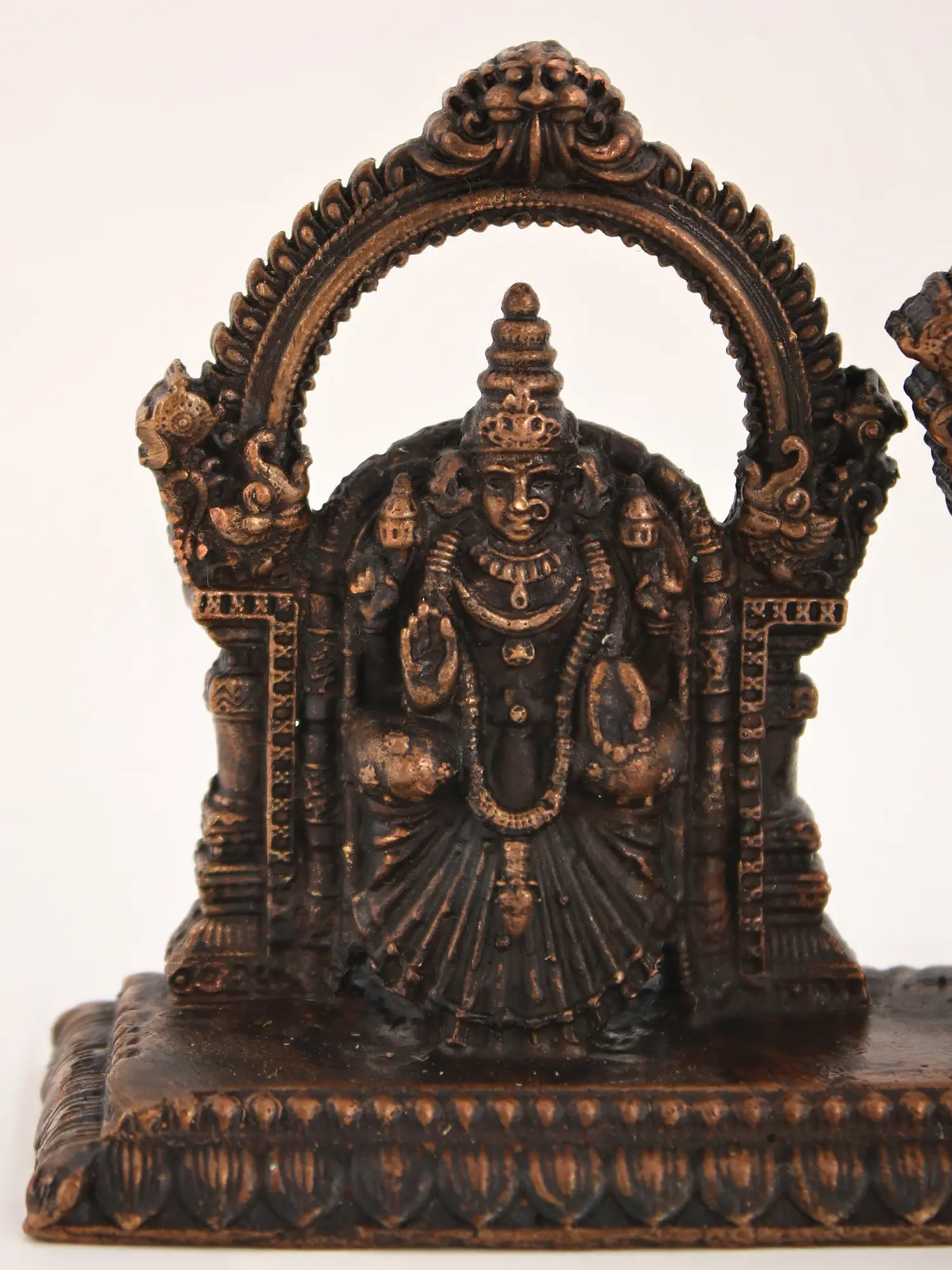 According to Tamil Bhakti tradition, Sri Tirupati Balaji is the pinnacle of divine manifestation and the cosmic parent who, along with Devi Padmavathi (Lakshmi), protects and nurtures his children. Presented as Puja Murti, Balaji, and Padmavati, depicted in this beautiful copper statue exude vitality, majesty, and bliss with their very presence. Each emblem is set icon a separate aureole and is adorned with elaborate jewelry and regal clothing. The intricacy of the details on the idols is alluring, which lends the miniature composition a regalia beyond words.
