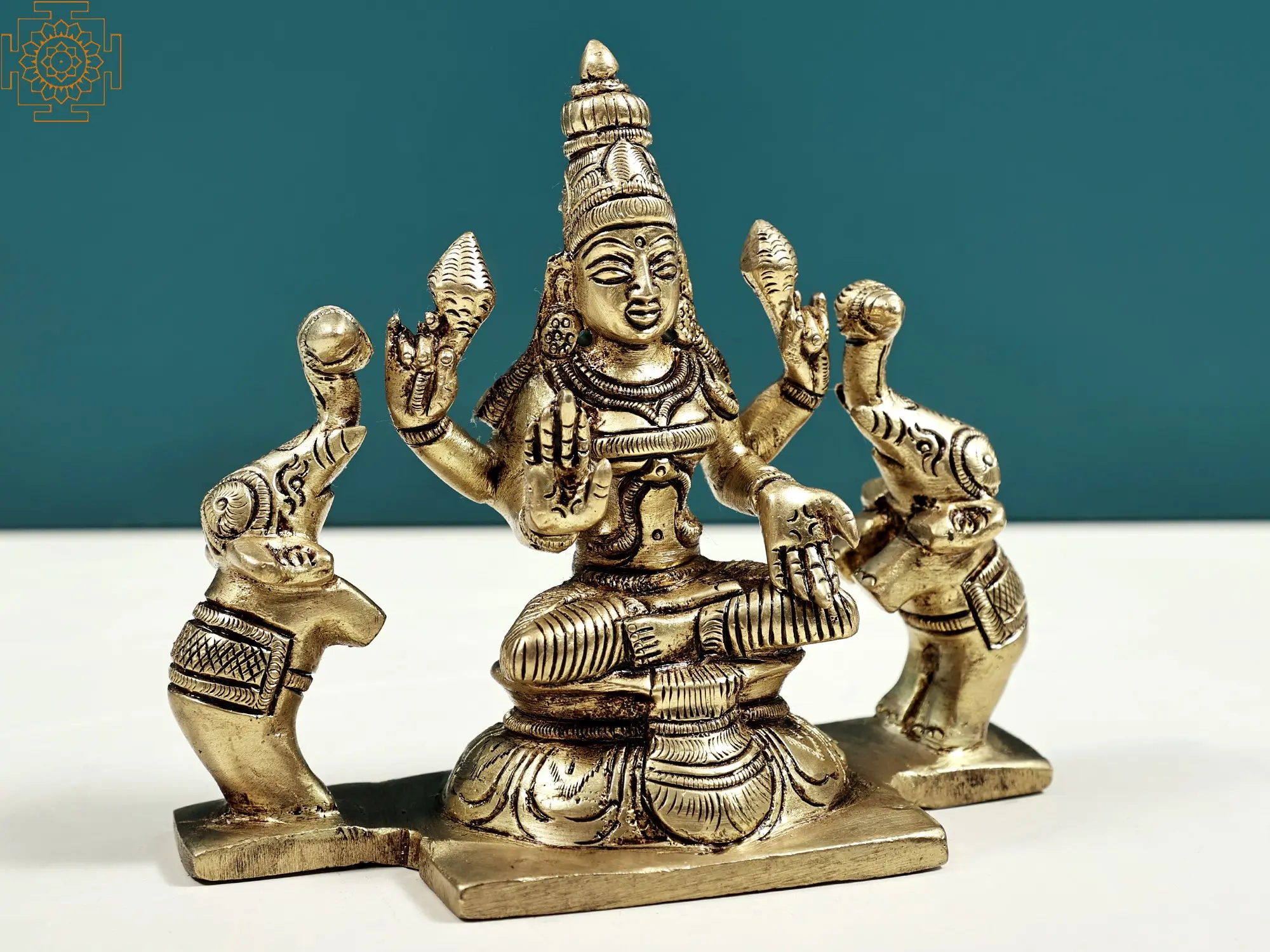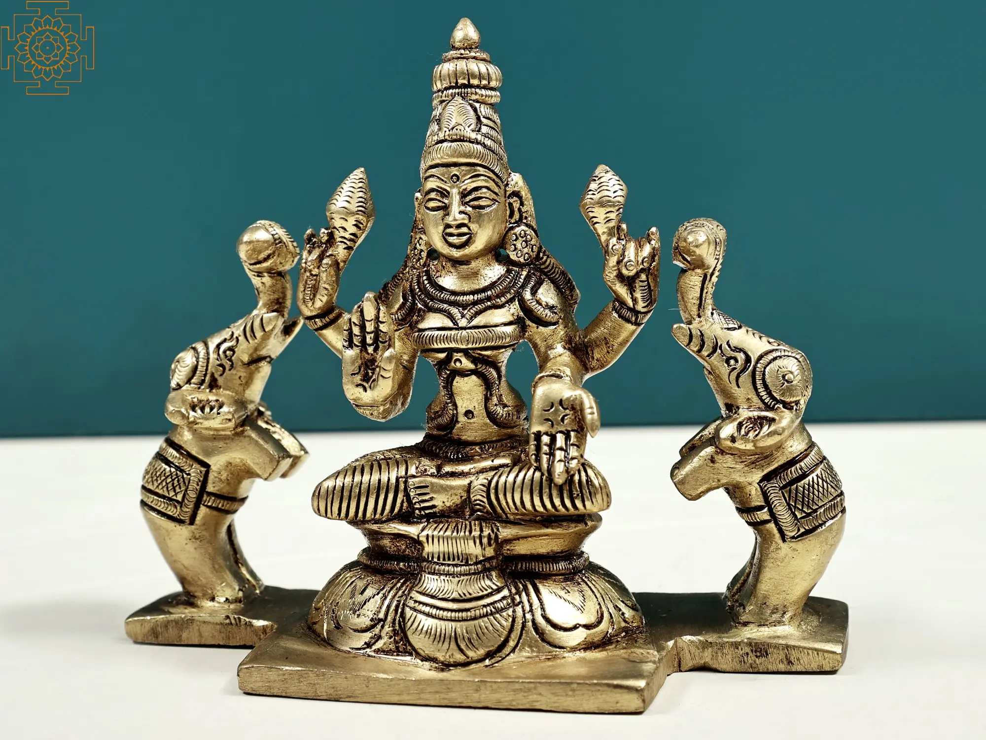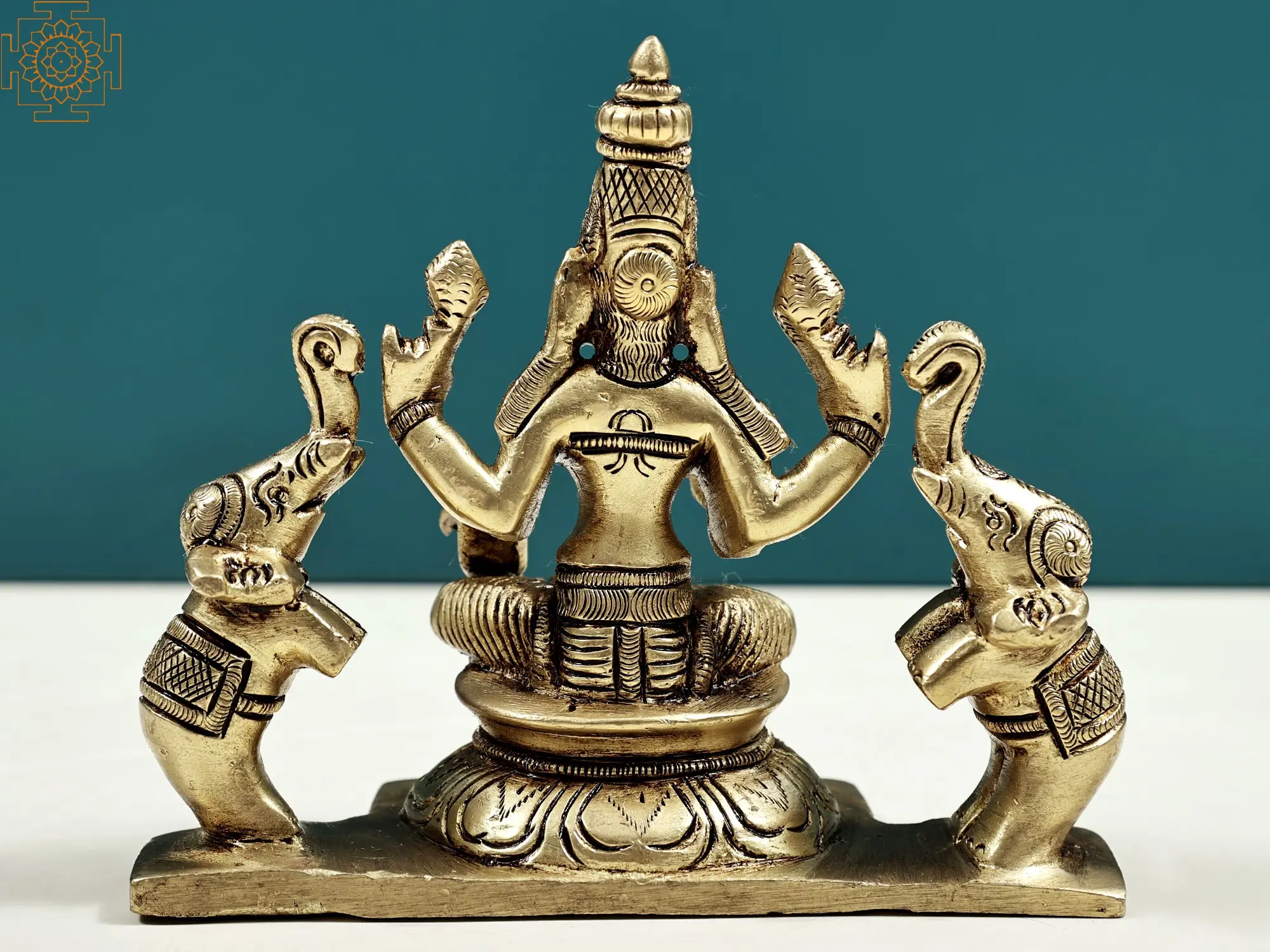 Sri Lakshmi is worshipped across the Indian subcontinent as the harbinger of unimaginable amounts of wealth and luxuries when she is pleased. Kings and commoners seek her blessings in order to gain all kinds of material and spiritual wealth. Goddess Lakshmi is represented in her Gajalakshmi form in this beautiful brass image. She sits on a kamalasana(lotus throne), holding two lotus buds in her hands, while her main left-hand makes the Varada mudra (gesture of bestowing blessings) and her main right hand is held in Abhaya mudra (gesture of fearlessness). The elephants in this brass murti are stylistically drawn, (with only their upper body shown depicted clearly) instead of being naturalistically represented. The artist has conveyed the idea of Gajalakshmi - the provider of grandeur and might that equals an elephant's pride.