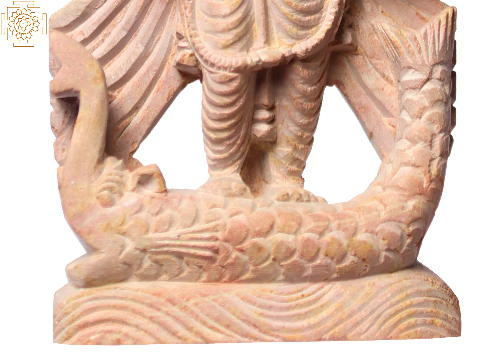 This exquisite pink stone statue captures the divine presence of Goddess Ganga, the personification of the sacred Ganges River. Carved from the heart of Odisha, a land steeped in spiritual heritage and artistic tradition, this piece reflects the meticulous craftsmanship that has been passed down through generations. The delicate pink hue of the stone evokes the gentle dawn breaking over the holy waters, imbuing the sculpture with a serene and ethereal quality.