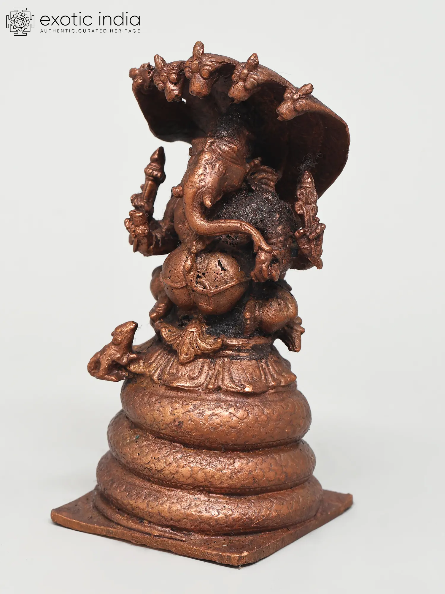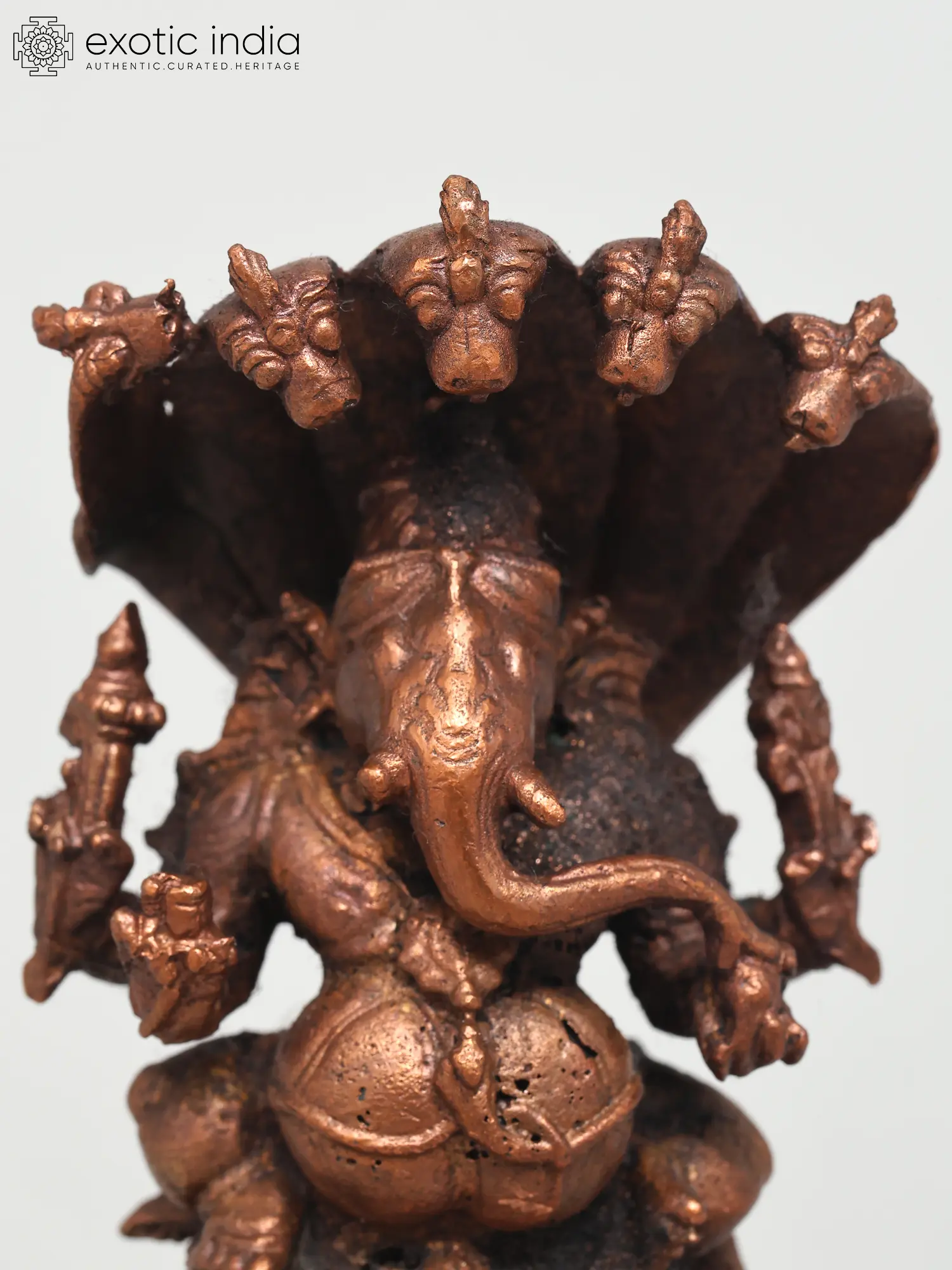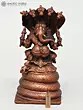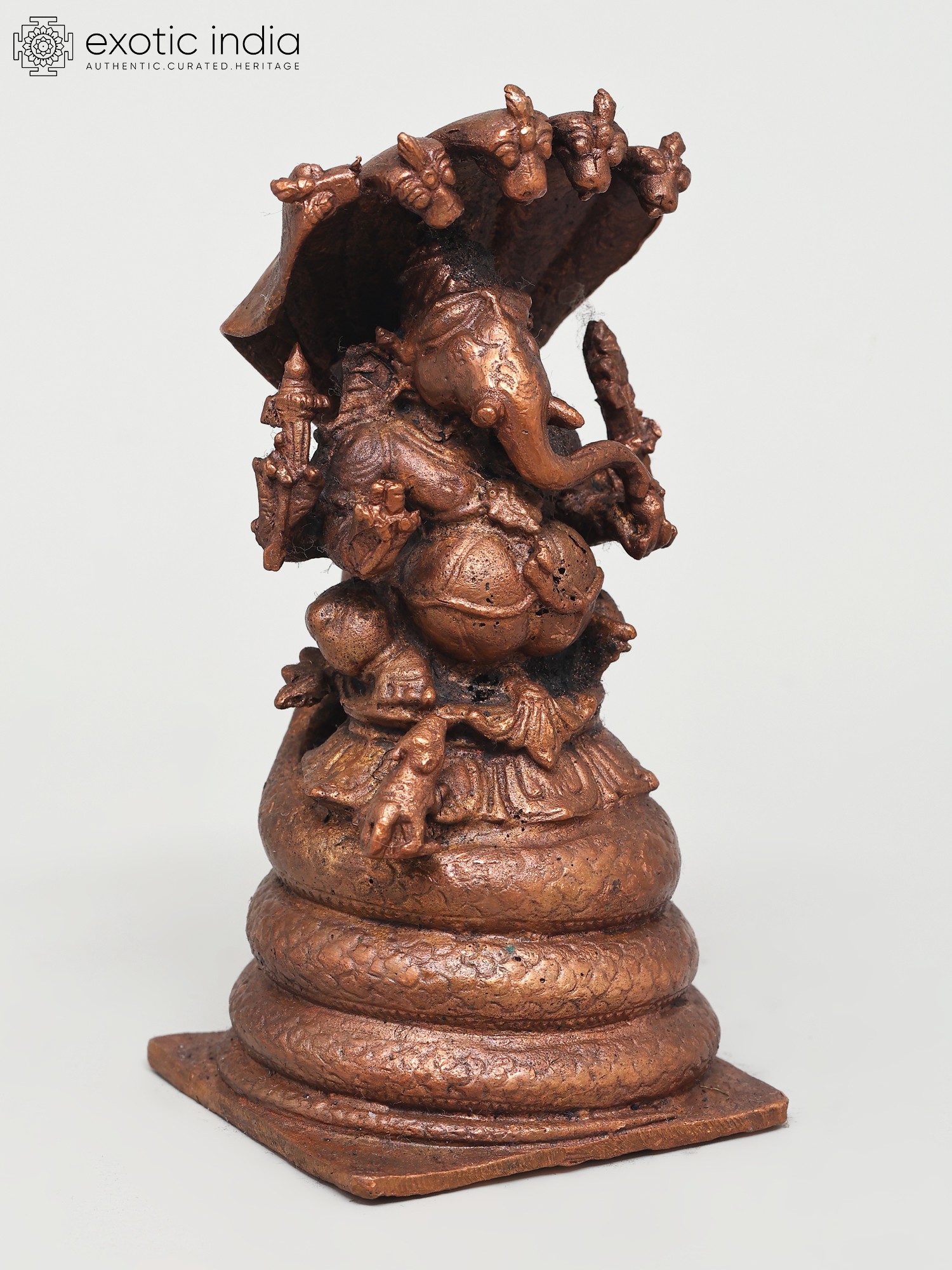 This exquisite copper statue captures Lord Ganesha in a posture of serene power, seated majestically upon the coils of a five-hooded serpent. The intricate detailing of the serpent, with each hood unfurled and poised, evokes a sense of divine protection and guardianship. In Hindu mythology, the serpent, particularly the Naga, is a powerful symbol of cosmic energy, fertility, and eternal time. The five hoods can represent the five elements or the five senses, implying Ganesha's mastery over them all.
