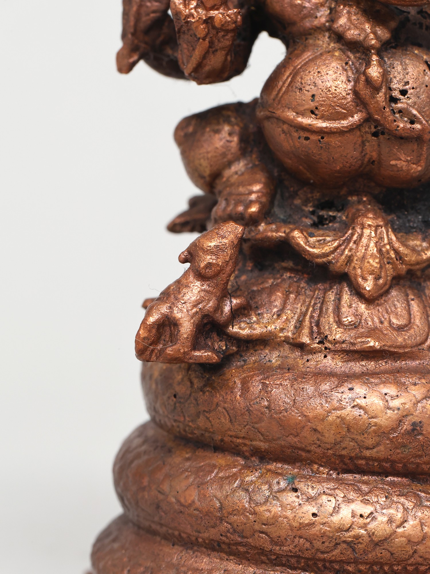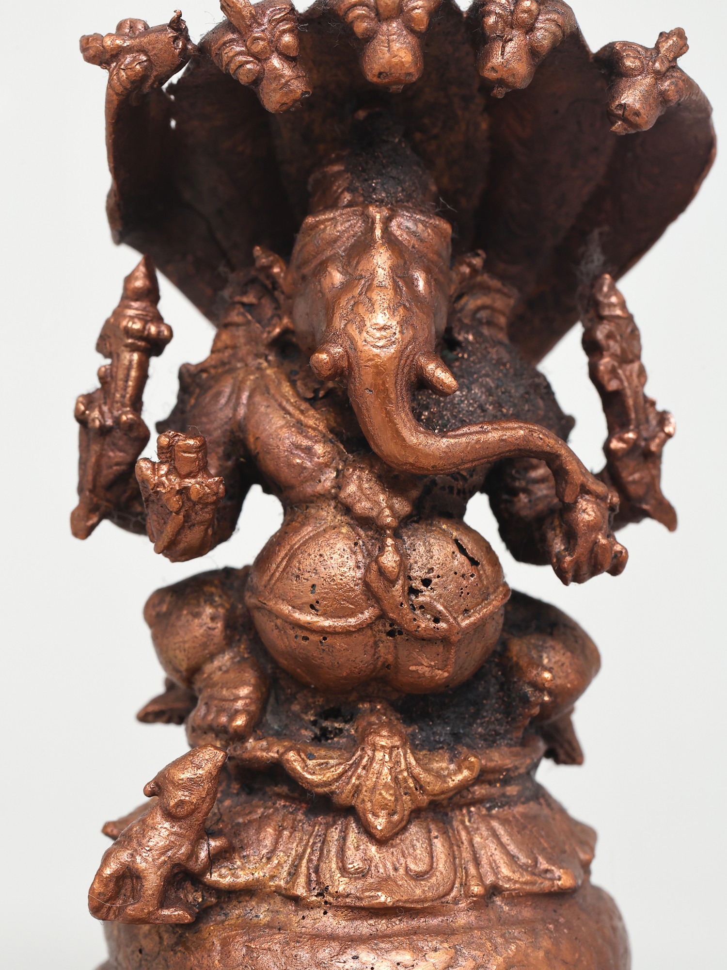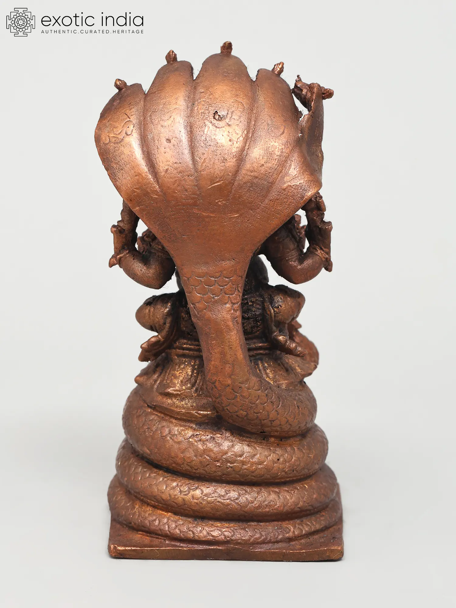 This exquisite copper statue captures Lord Ganesha in a posture of serene power, seated majestically upon the coils of a five-hooded serpent. The intricate detailing of the serpent, with each hood unfurled and poised, evokes a sense of divine protection and guardianship. In Hindu mythology, the serpent, particularly the Naga, is a powerful symbol of cosmic energy, fertility, and eternal time. The five hoods can represent the five elements or the five senses, implying Ganesha's mastery over them all.