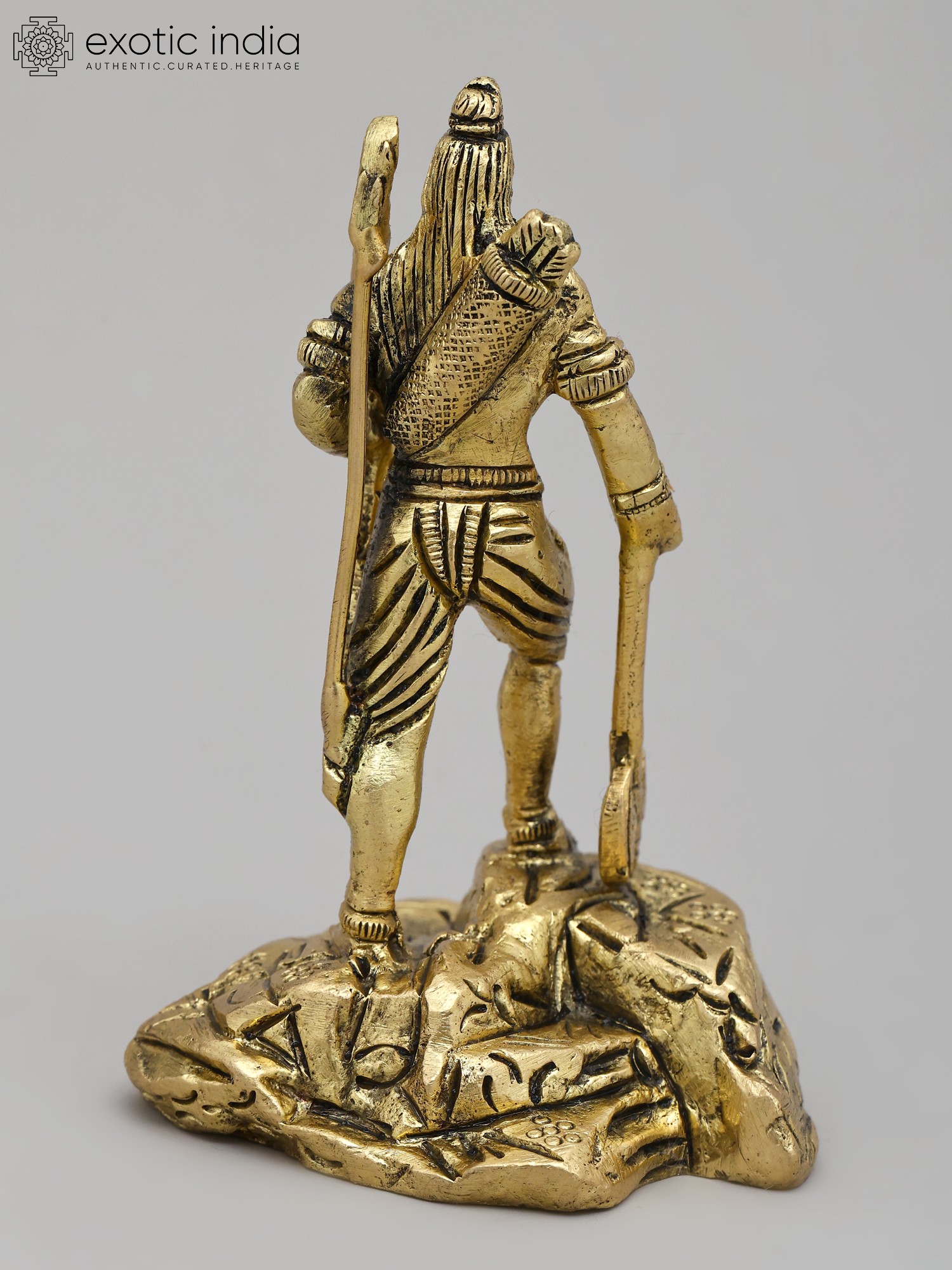 The statue is meticulously crafted from brass, a material historically associated with deities and religious artifacts due to its enduring nature and radiant sheen. The artist has skillfully rendered the intricate details of Parashurama's attire, including his dhoti, sacred thread, and ornamentation, imbuing the figure with a sense of regality and power. The textured base upon which he stands further enhances the narrative, suggesting a rugged terrain or a mountain peak from which he surveys his domain. His characteristic weapons – a bow and arrow slung over his shoulder and an axe held firmly in his hand – are depicted with precision, symbolizing his readiness to combat any force that threatens cosmic order. This compact yet impactful sculpture is a perfect addition to any altar, study, or collection, radiating an aura of strength and divine protection.