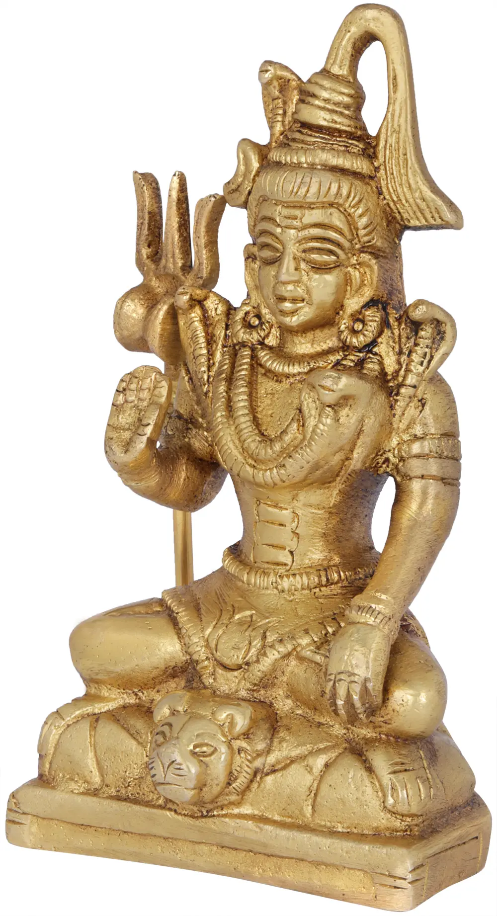 Lord Shiva, also called “Mahadev”, is the supreme deity who is known as the transformer of the Universe. In this form, He is sitting in a gesture of fearlessness (Abhaya Mudra), exuding an aura of tranquillity and protection. Adorned with serpents, symbolising his mastery over fear and mortality, Lord Shiva embodies both Destruction and Creation. His trident (Trishul), a potent symbol of power, represents the three gunas “Sattva”, “Rajas”, and “Tamas”. Seated in deep meditation, Shiva’s presence bridges the mortal realm with the cosmic. This magnificent brass statue of Lord Shiva, which represents his heavenly presence, will elevate your sacred area.