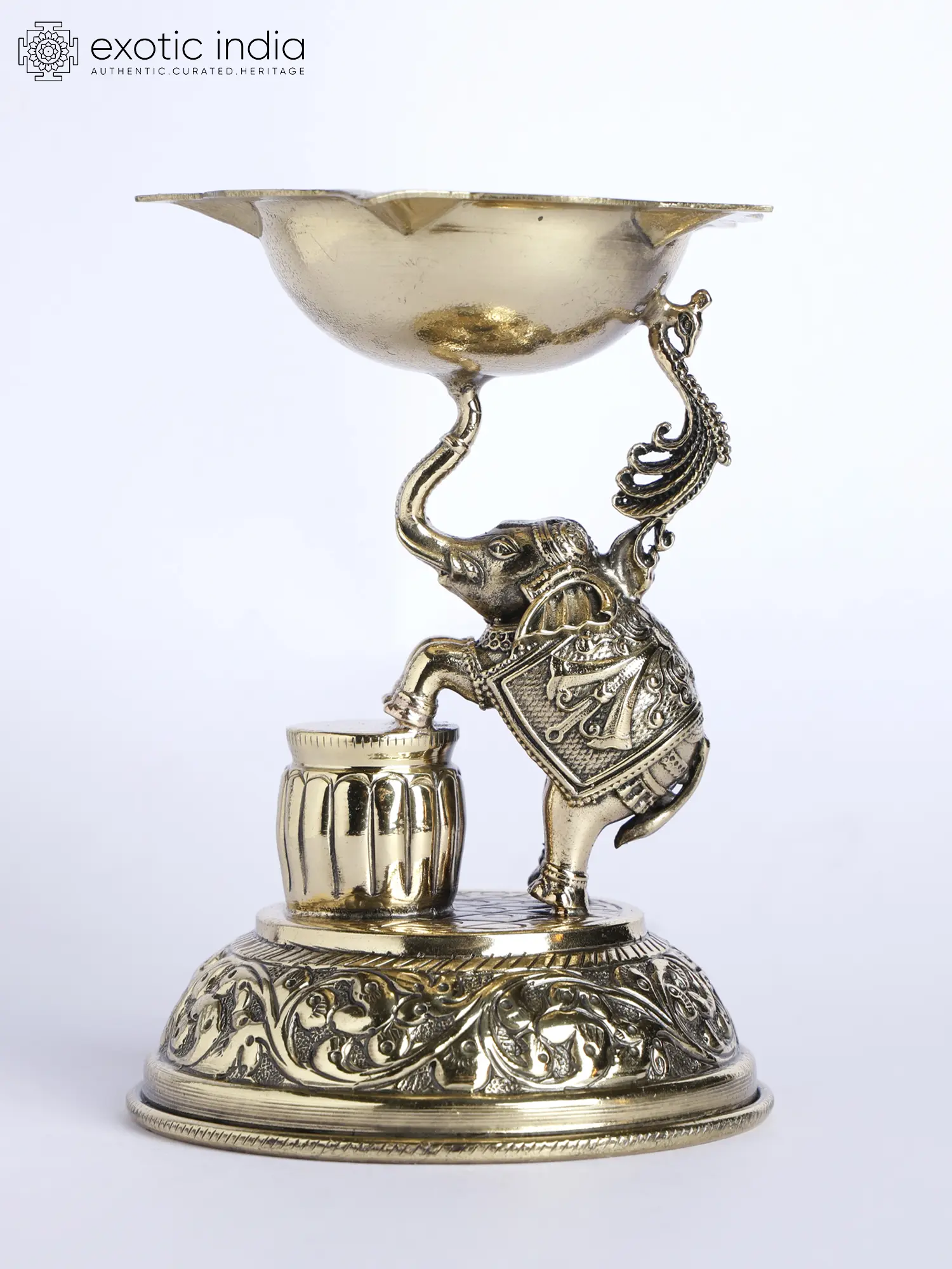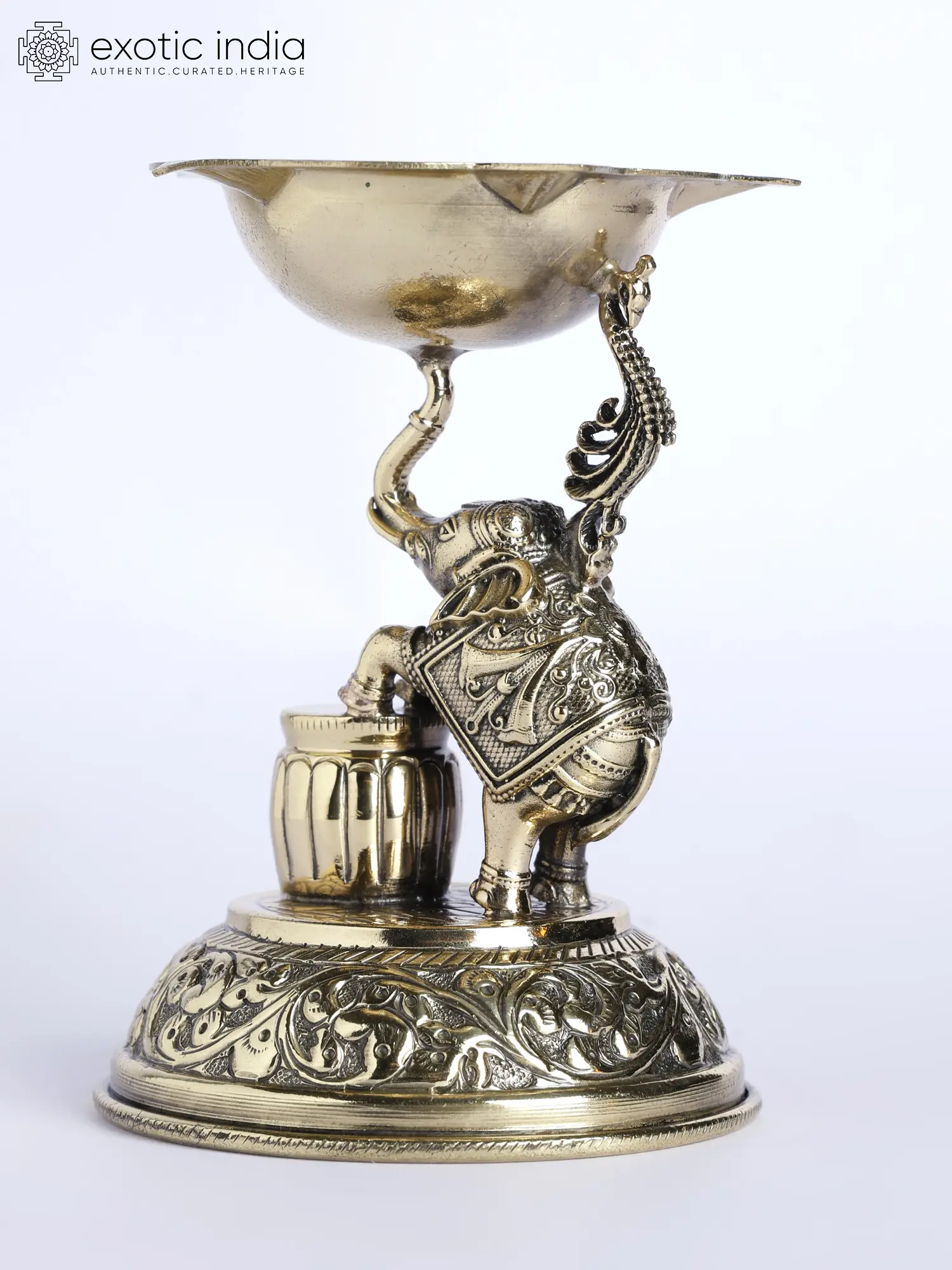 The superfine brass statue transforms a lamp into a miniature marvel with an elephant balancing the Diya on its trunk.