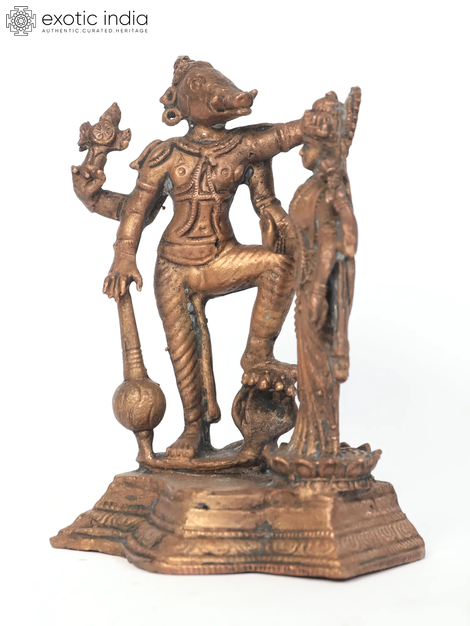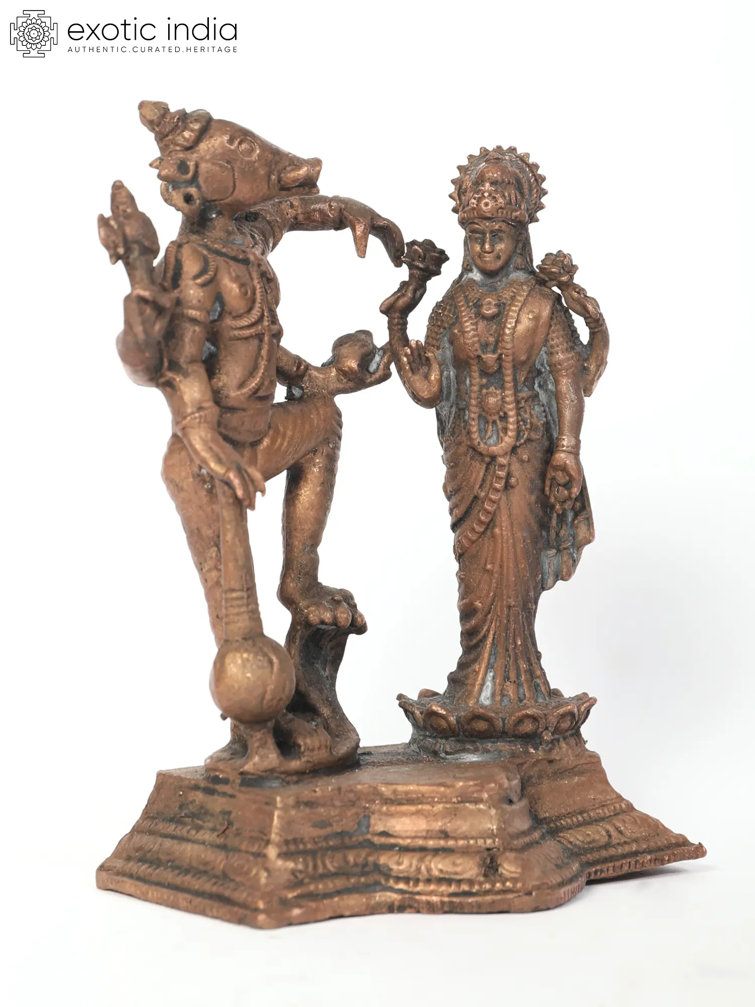 Together, the great god and goddess are worshipped as the pinnacle of worldly and metaphysical achievements. In this small copper statue, Lakshmi-Varaha stands on a pedestal they share, with Sri Varaha standing on the hood of Adi Shesha and Devi Lakshmi placed on her Kamalasana (lotus seat).