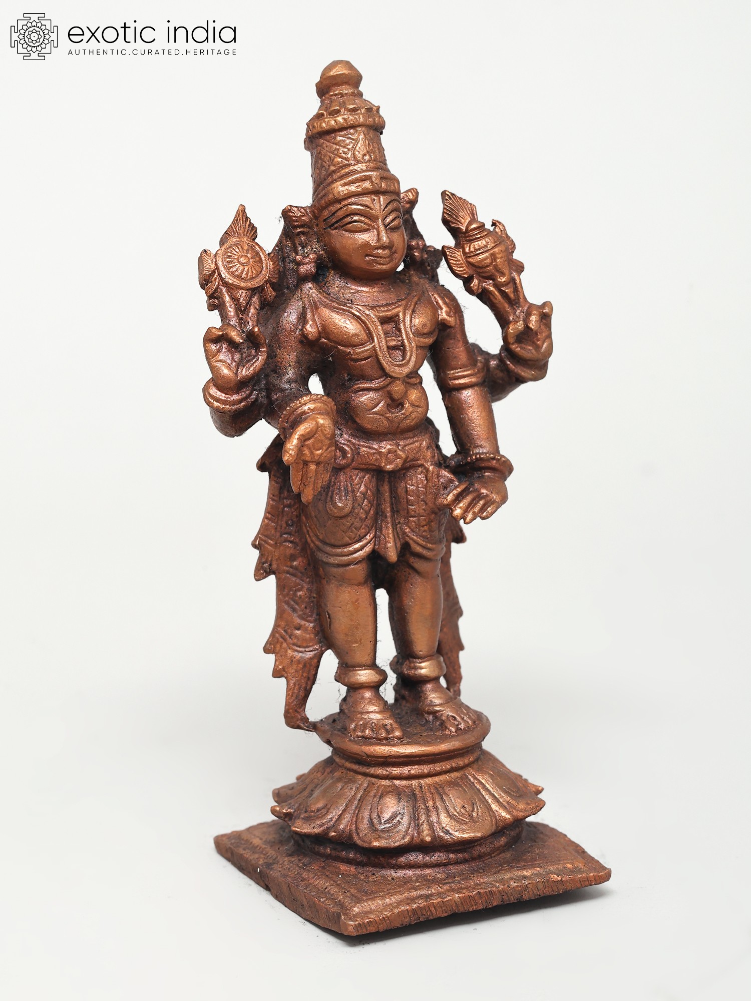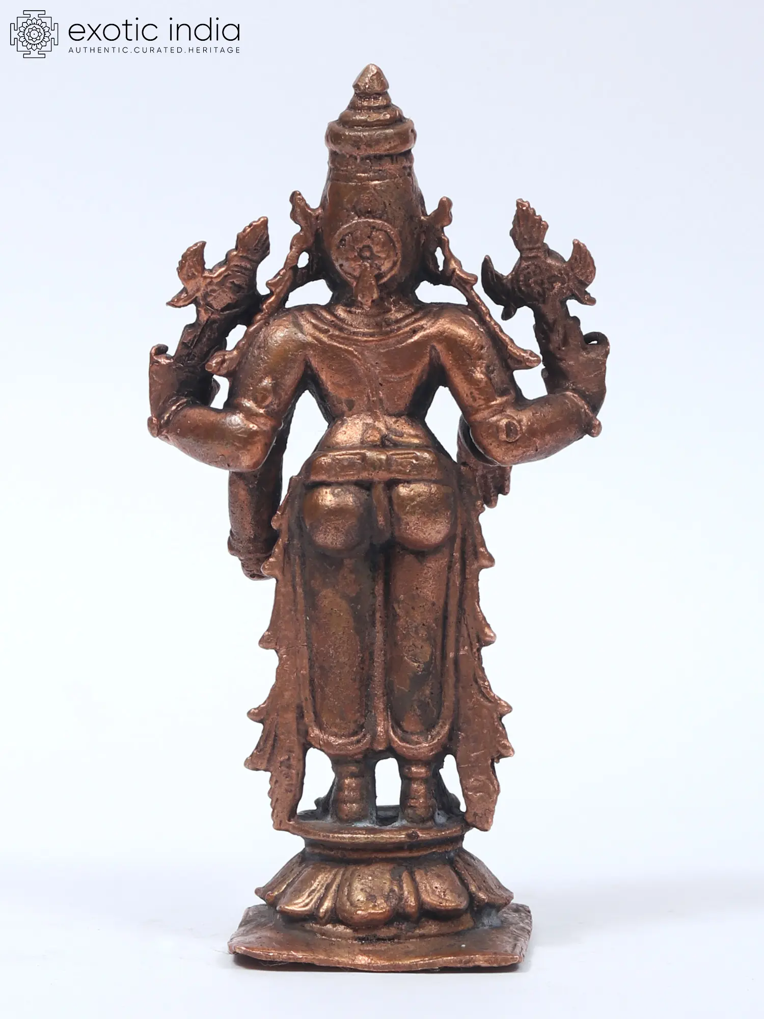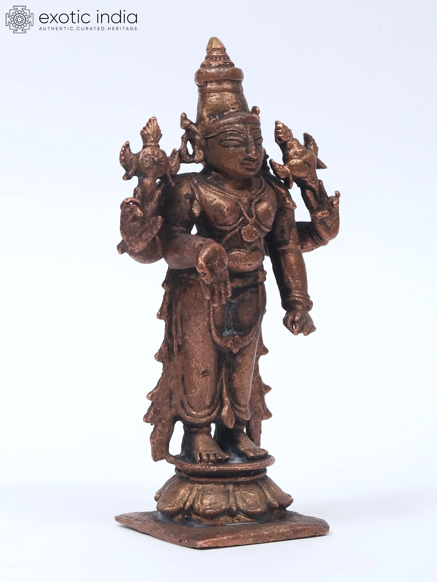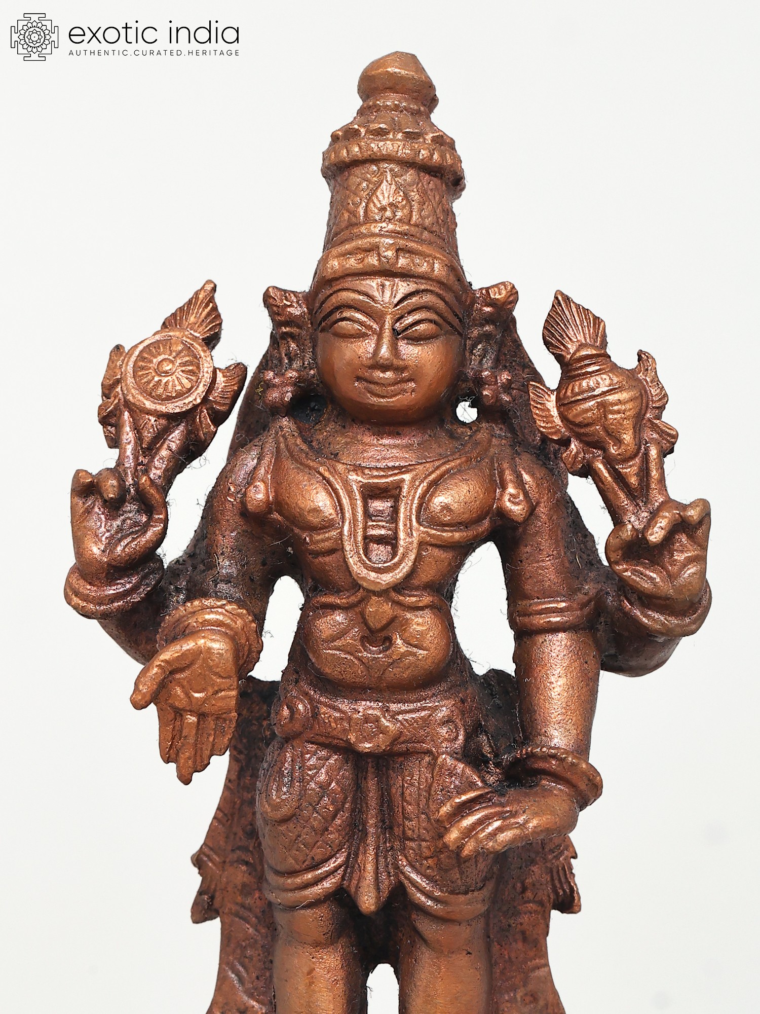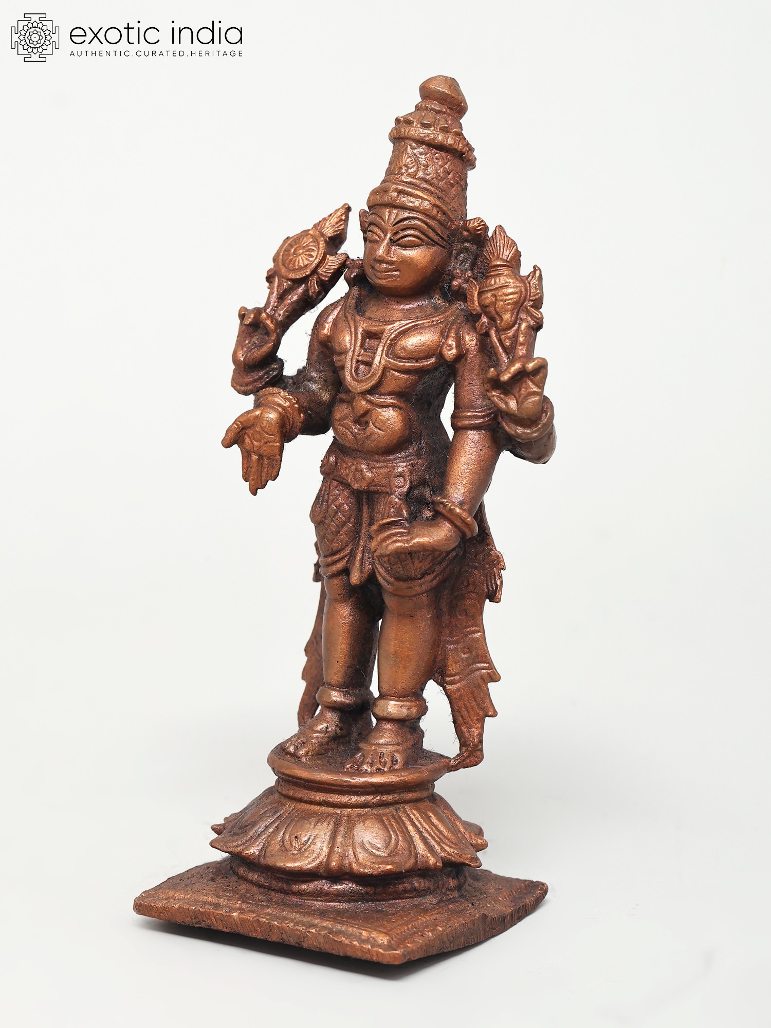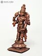 Lord Vishnu's standing picture represents his awareness and intention to protect his devotees at all times and in any situation. This Small Standing Lord Vishnu Copper Statue constructed in copper is a tribute to the benevolent image of Lord Vishnu. The statue captures the deity in a standing posture, symbolizing cosmic balance and harmony. Every nuance, from the four symbolic arms to the serene facial features, reflects the artisan's reverence. Here the Lord while holding his regular Shankha and Chakra blesses his devotees in the Varada mudra. His other hand is in Kati-Haasta gesture. Ideal for home shrines or as a spiritual centerpiece, this statue invites a sense of peace and divine presence.