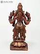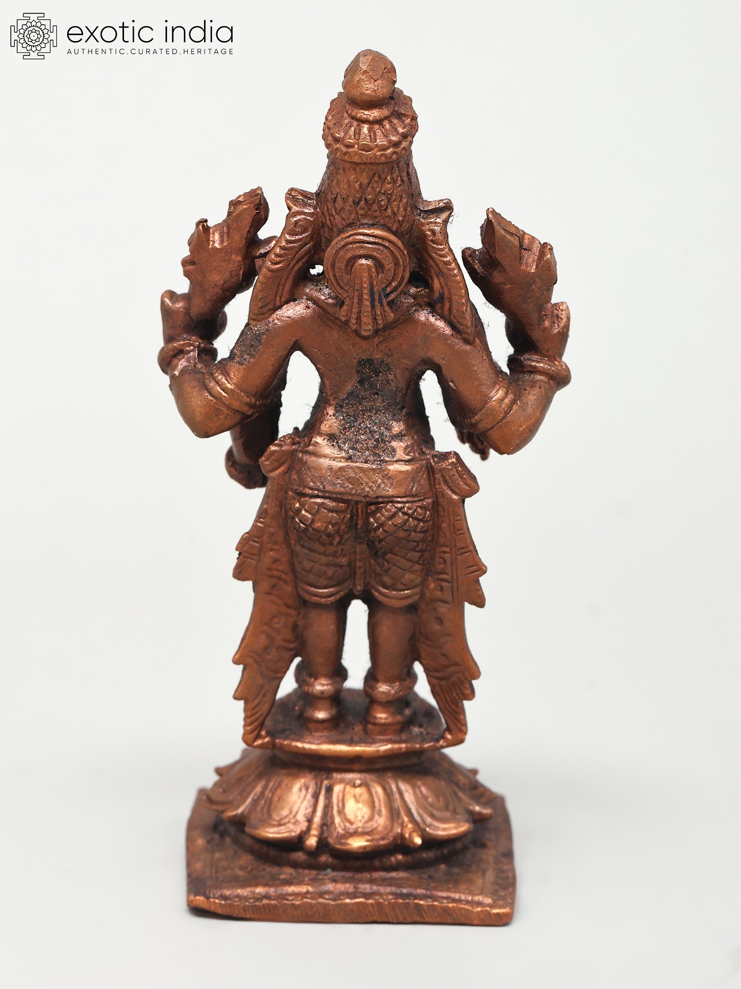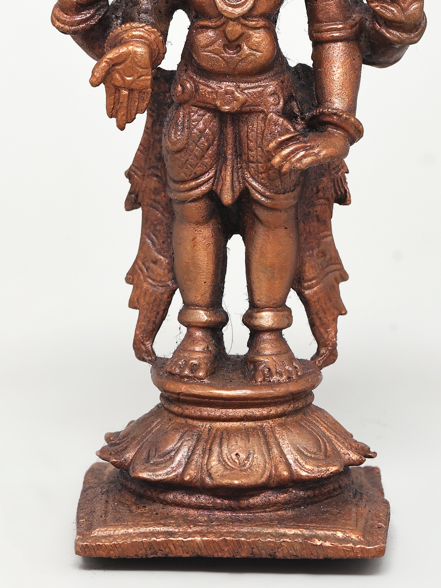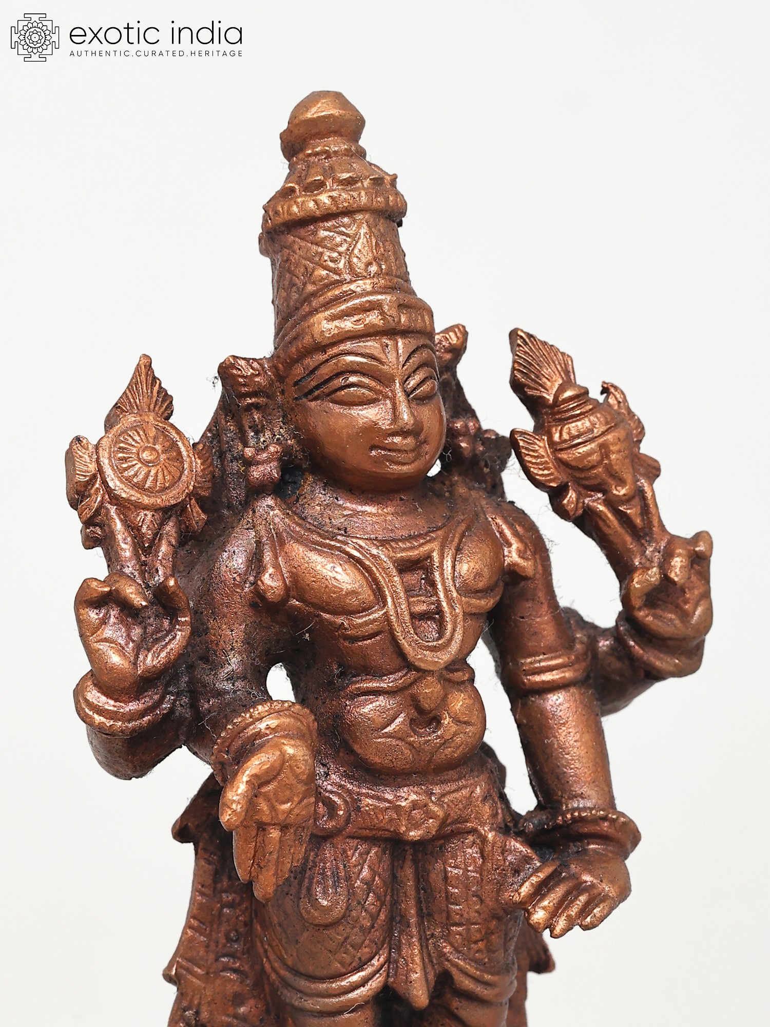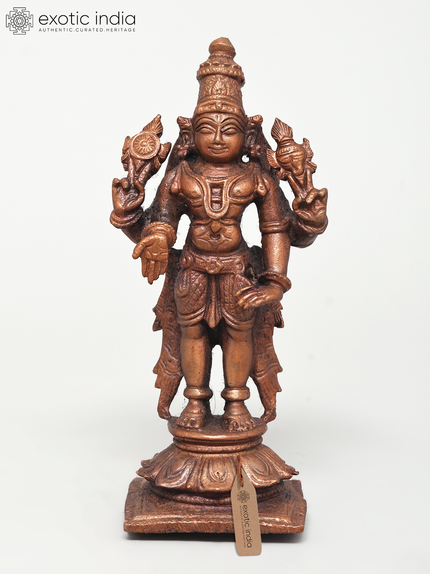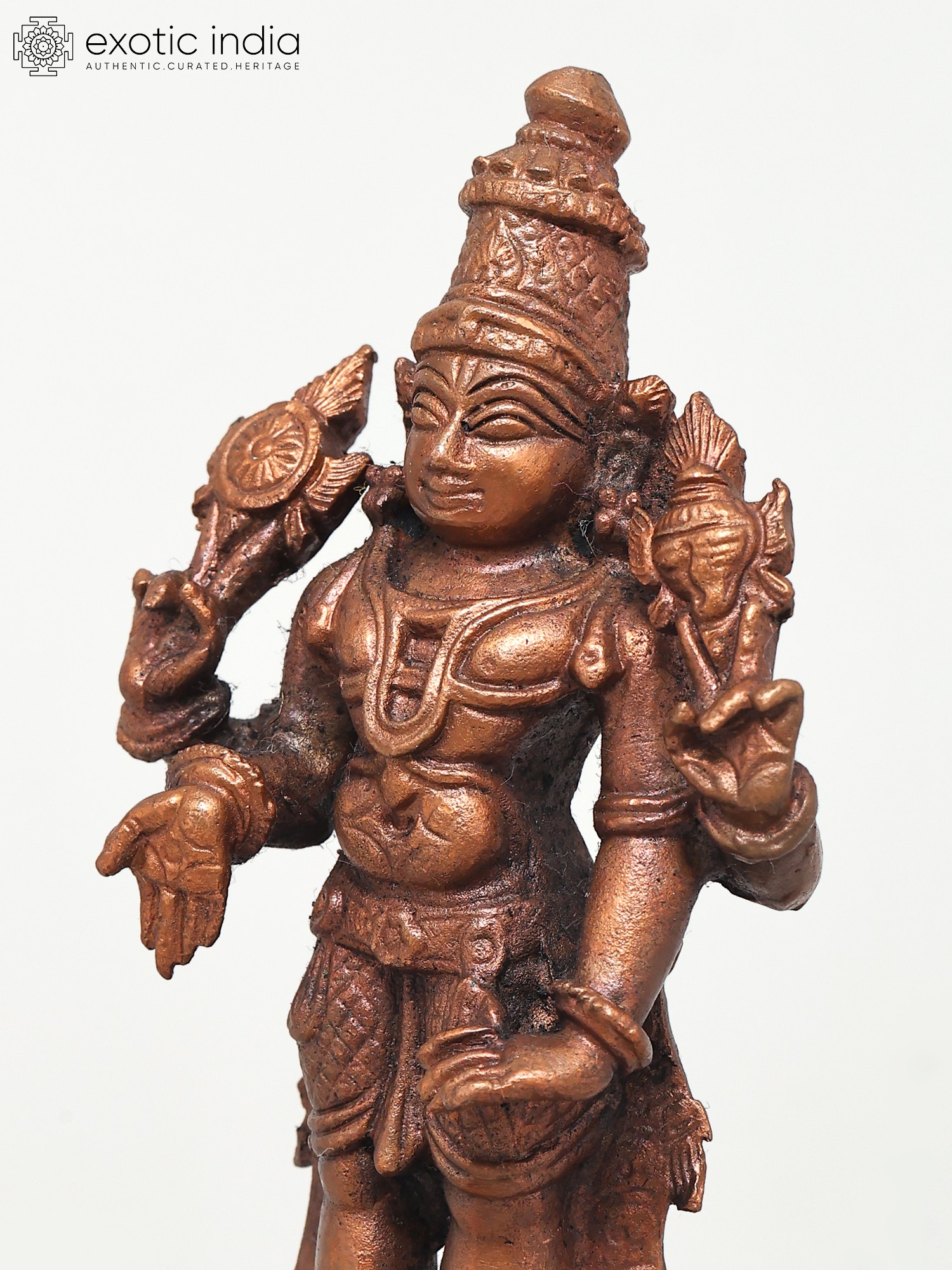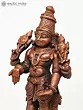 Lord Vishnu's standing picture represents his awareness and intention to protect his devotees at all times and in any situation. This Small Standing Lord Vishnu Copper Statue constructed in copper is a tribute to the benevolent image of Lord Vishnu. The statue captures the deity in a standing posture, symbolizing cosmic balance and harmony. Every nuance, from the four symbolic arms to the serene facial features, reflects the artisan's reverence. Here the Lord while holding his regular Shankha and Chakra blesses his devotees in the Varada mudra. His other hand is in Kati-Haasta gesture. Ideal for home shrines or as a spiritual centerpiece, this statue invites a sense of peace and divine presence.