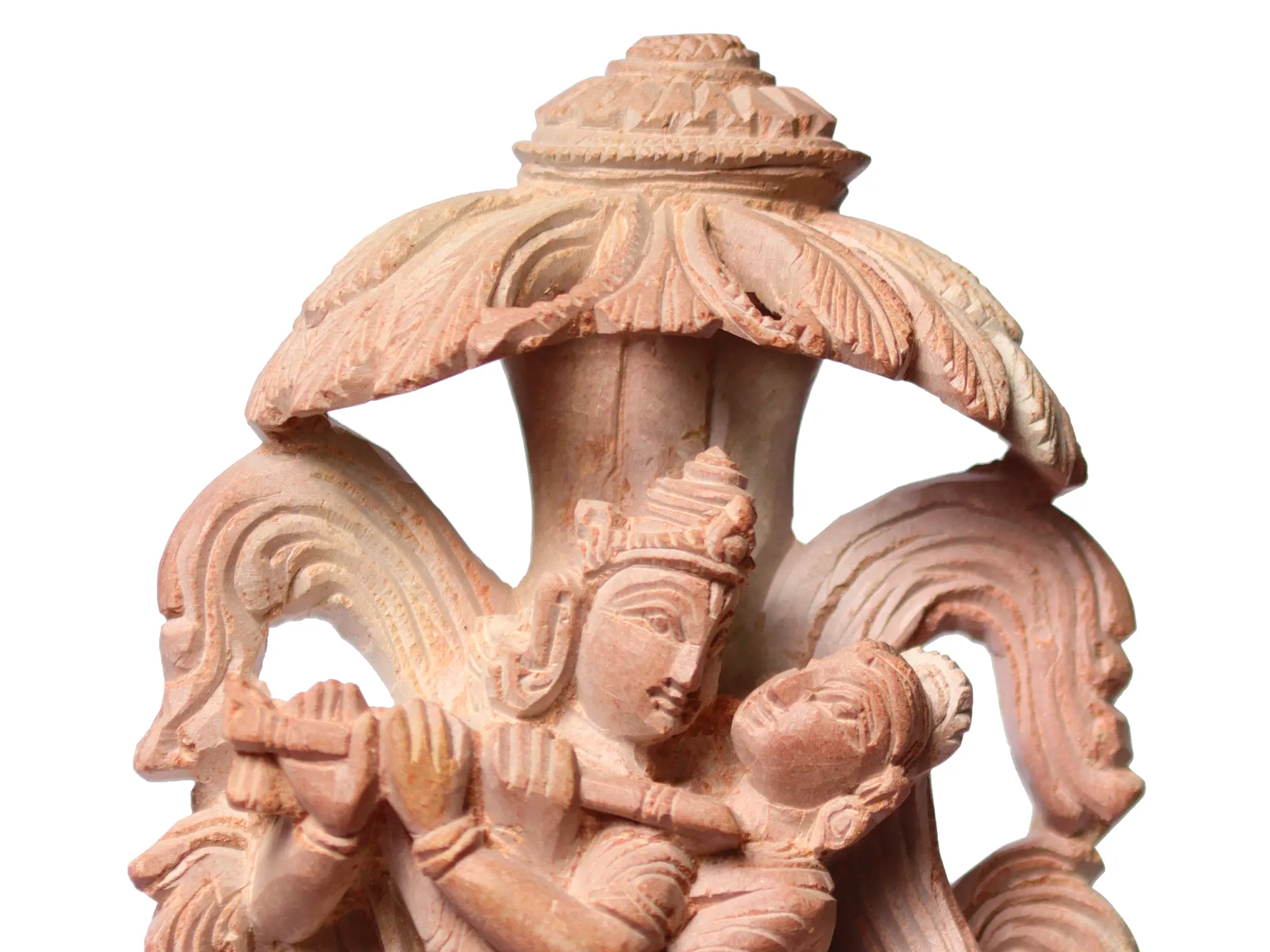 The Radha Krishna motif is central to Vaishnavism, representing the ultimate form of unconditional love and selfless devotion. It is believed that the love between Radha and Krishna is a metaphor for the soul's yearning for the divine. Tales from the Puranas, particularly the Bhagavata Purana and the Gita Govinda, narrate their celestial love, their playful dalliances in the forests of Vrindavan, and their profound spiritual union. This sculpture, with its intricate details and the warmth of the pink stone, brings this sacred narrative into your living space, serving as a constant reminder of devotion, love, and the pursuit of spiritual harmony.