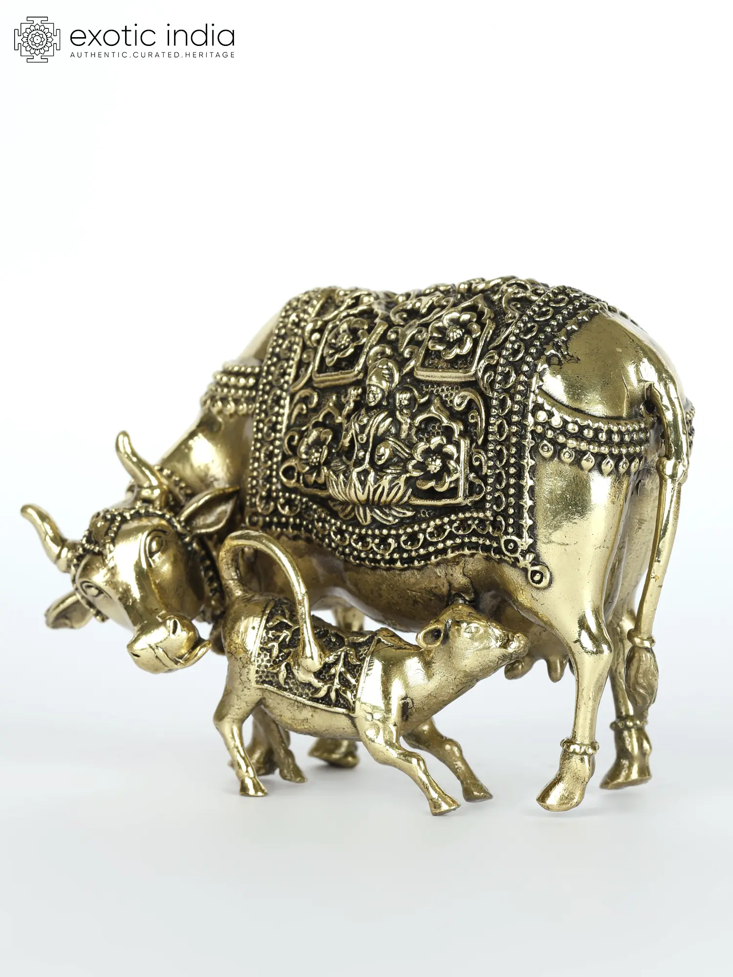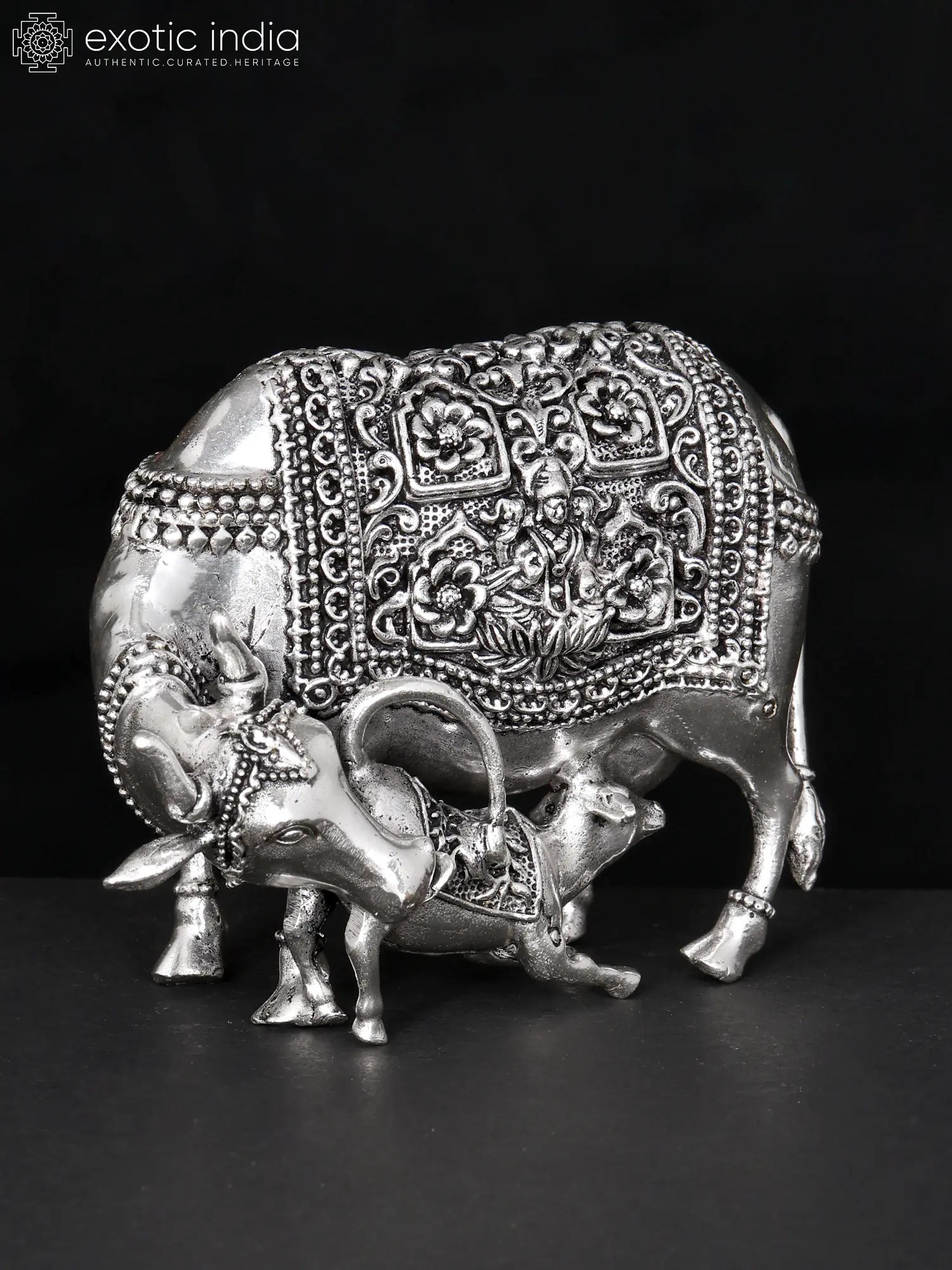 The intricate floral etchings on the cow's body further enhance its aesthetic appeal and spiritual significance. The presence of Goddess Lakshmi, the goddess of wealth and prosperity, and Lord Ganesha, the remover of obstacles, add to the power of this imagery.