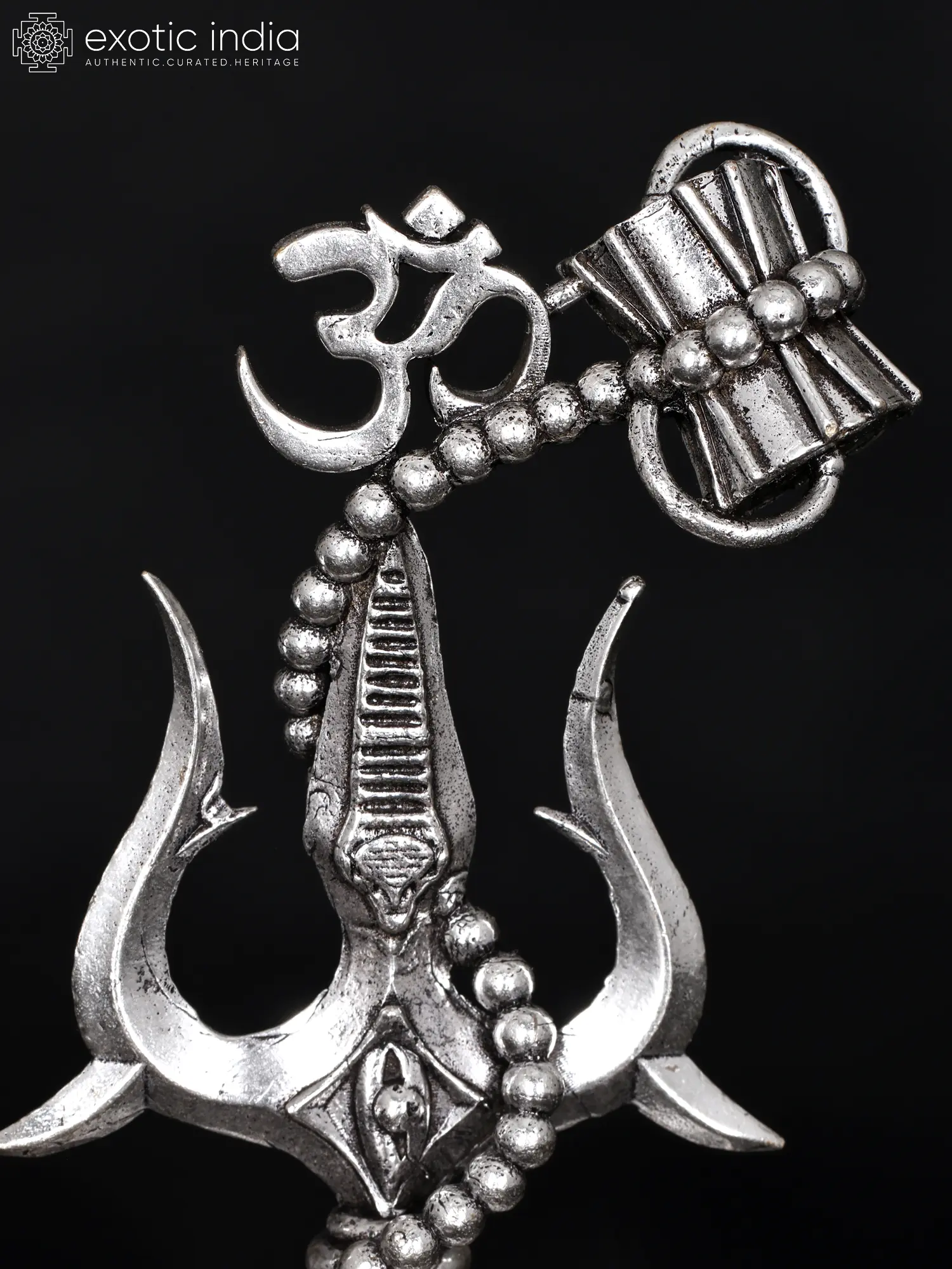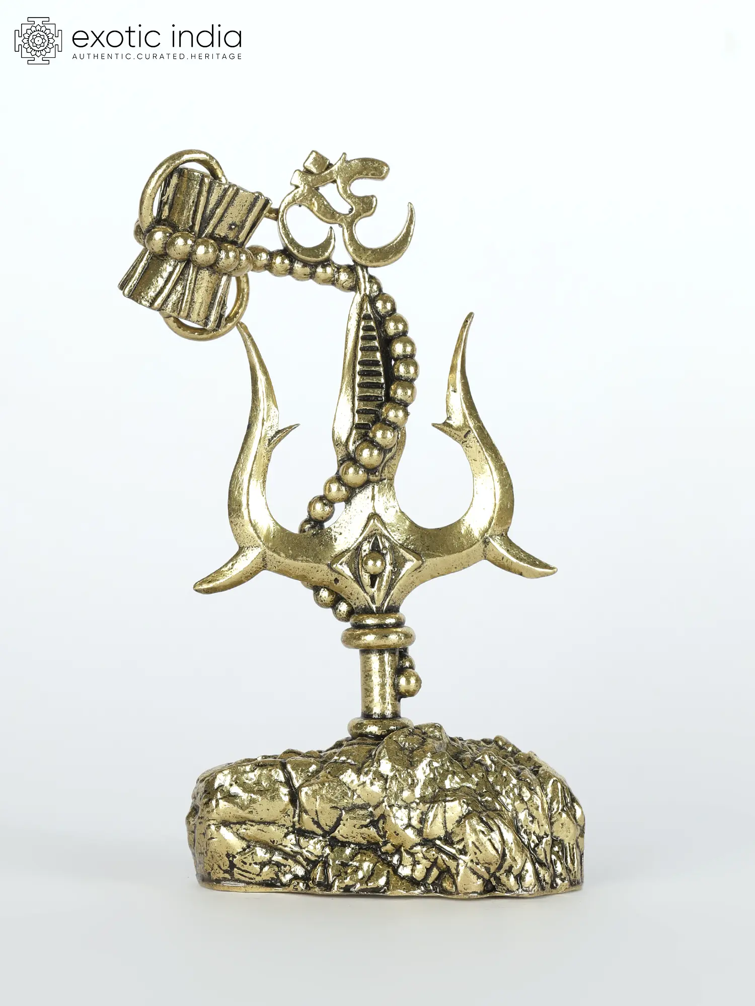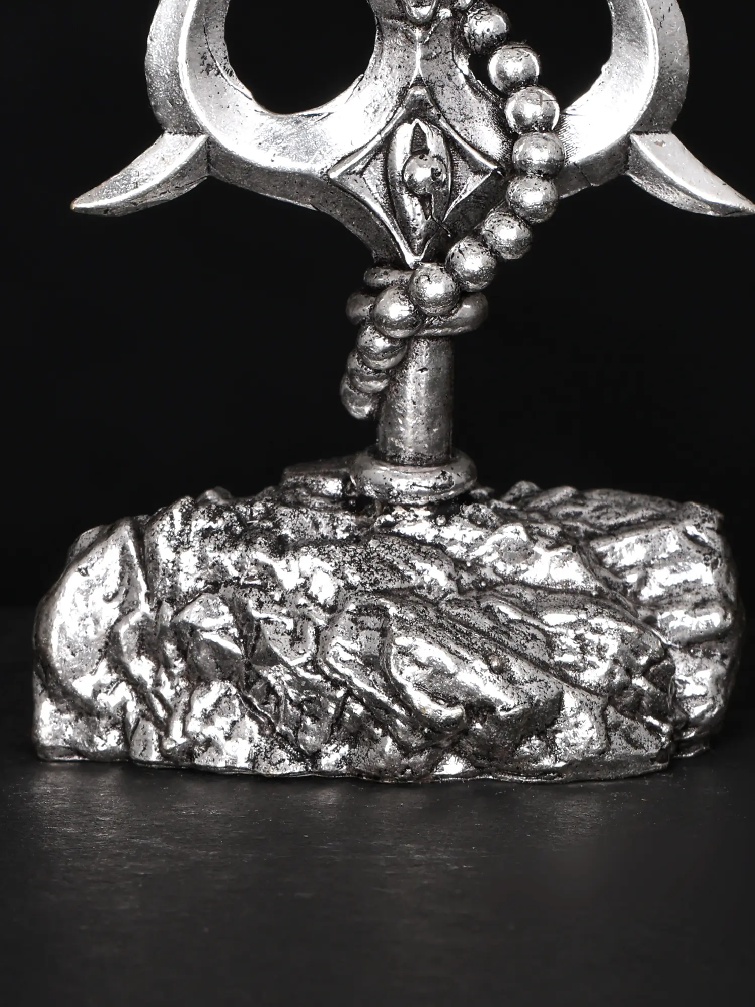 The Trishula is placed on the rugged pedestal, with a Rudraksha rosary embracing it, clasping the Damru, embellished by Om on its top.