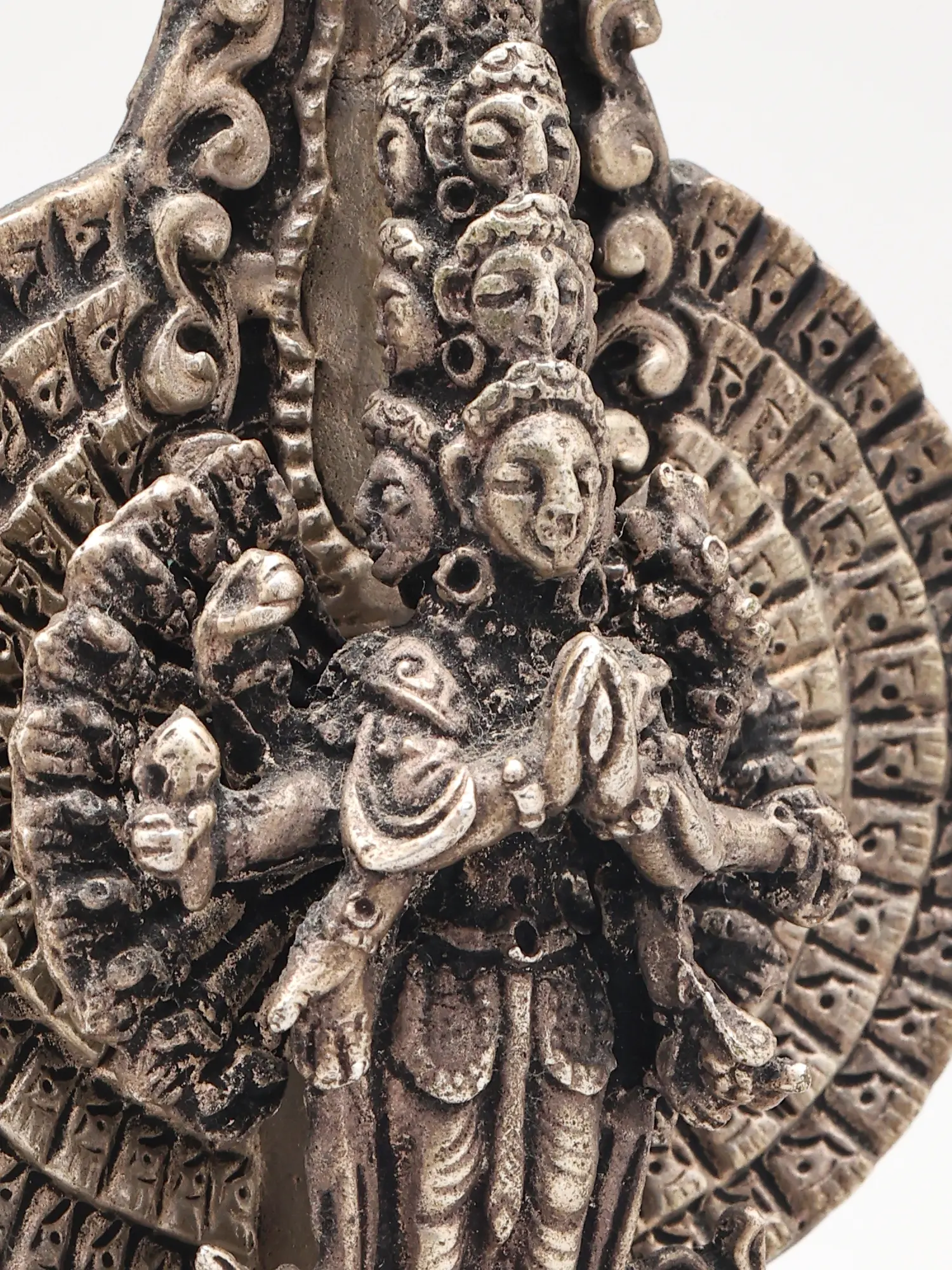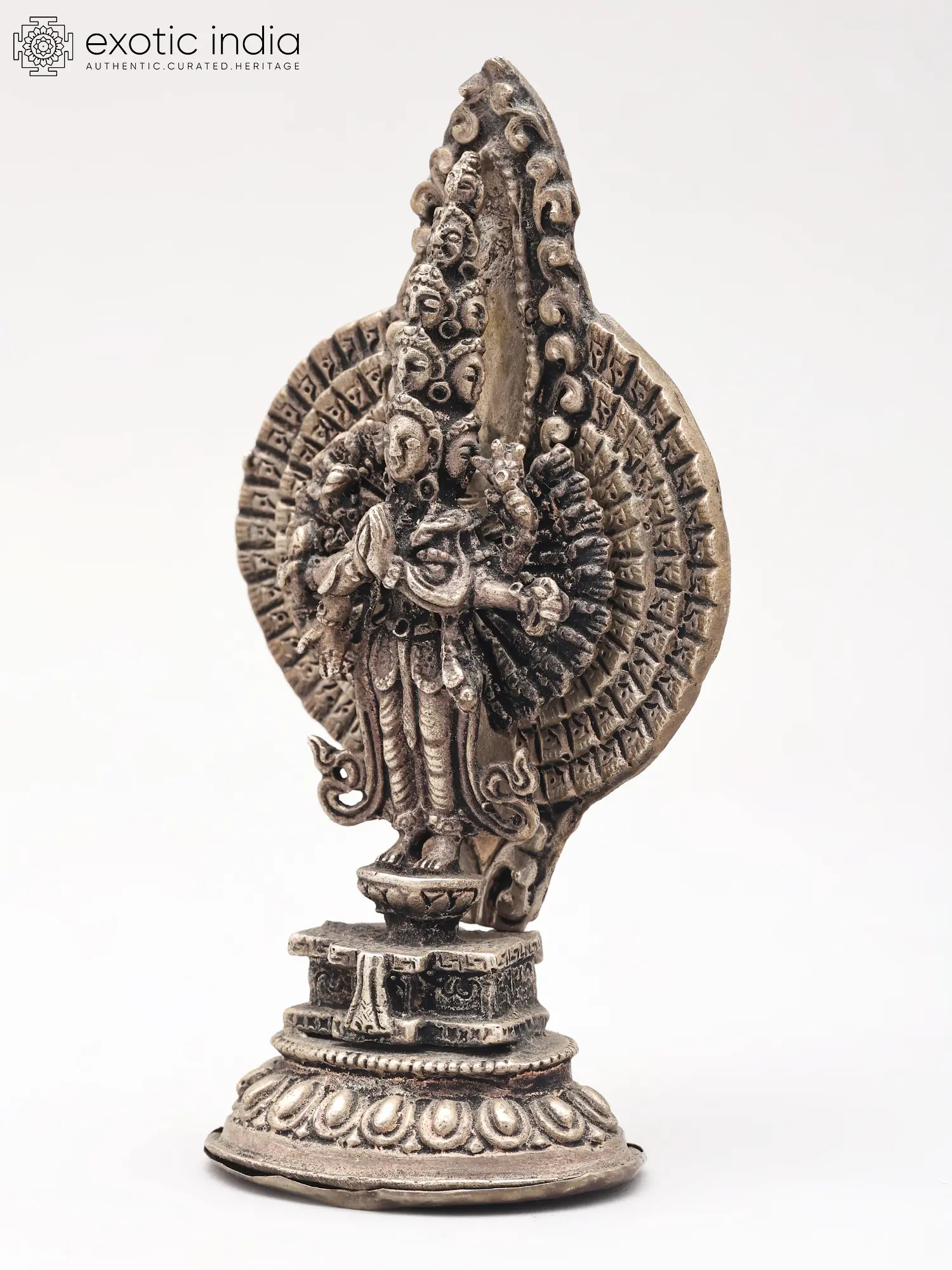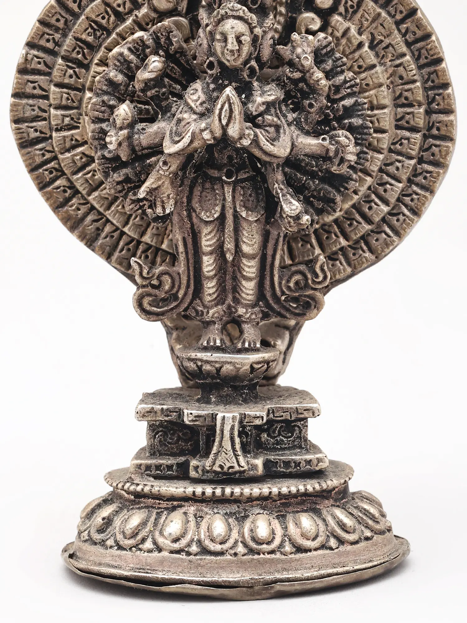 The circular halo behind the deity, adorned with mantra inscriptions and miniature representations of multiple faces, signifies Avalokiteshvara's omnipresent awareness and infinite compassion. Numerous arms extend outwards, each in a gesture of blessing or protection, a visual testament to the Bodhisattva's ability to respond to the suffering of all beings across all directions. Measuring approximately 4 inches in height, its dimensions make it a remarkably detailed yet unobtrusive addition to any space.