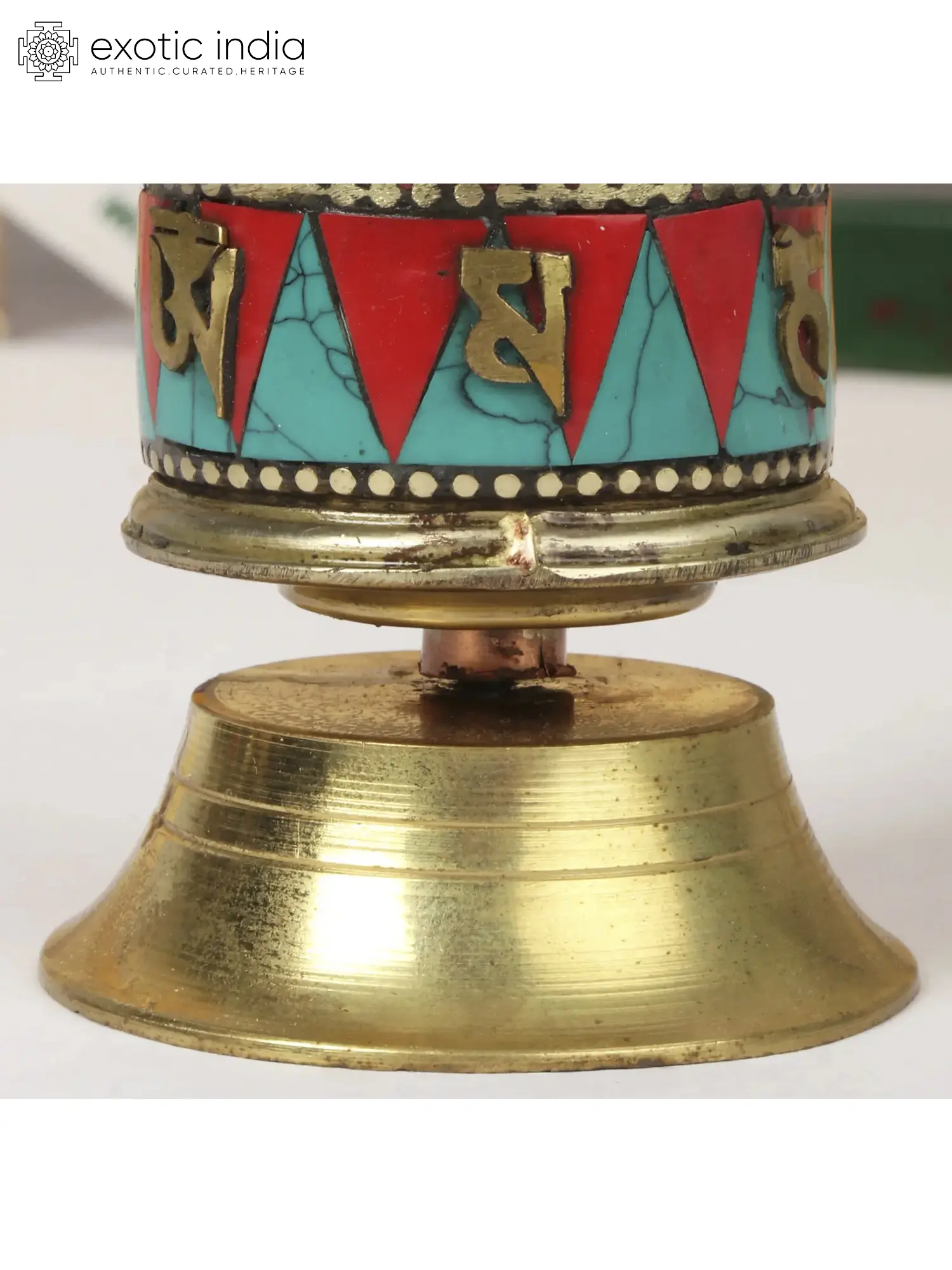 Spinning the prayer wheel is analogous to reading texts in Tibetan culture, and it is the best way to repent of the past, purge negativities (bad karma), and amass merit (good karma). The number of spins of the prayer wheel increases the merit. This copper and brass prayer wheel with turquoise and red inlay work is a portable meditation item on a pedestal. The Om Mani Padme Hum mantras are inscribed on the prayer wheel's body. The mantra is circulated in the atmosphere and helps purify the air by spinning this wheel clockwise.