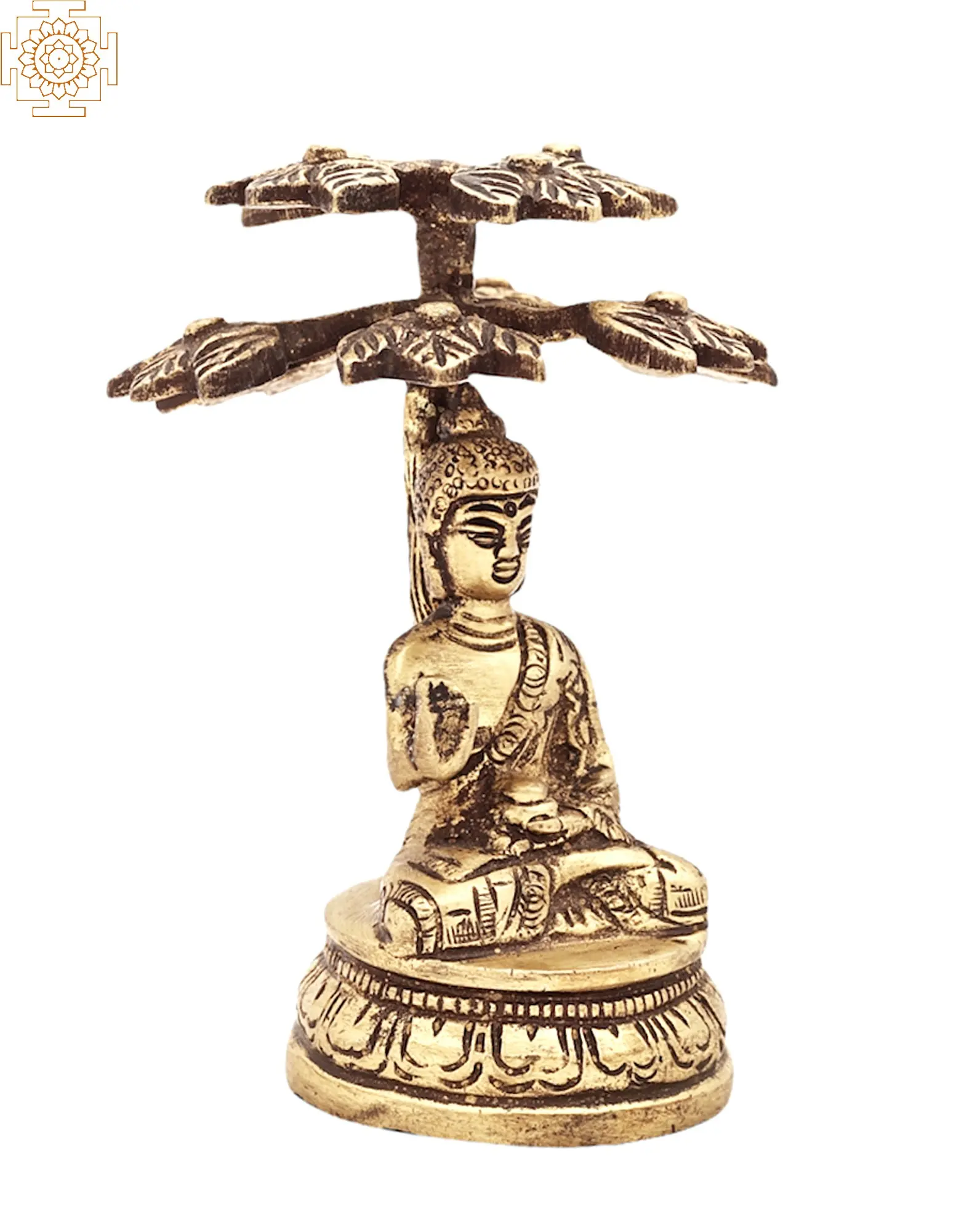 Beneath the sheltering embrace of the Bodhi tree, Siddhartha Gautama found enlightenment, becoming the Buddha. "The mind is everything. What you think, you become," he proclaimed. The Tibetan Buddhist Lord Buddha Seated Under a Tree sculpture is a remembrance of this transformative moment. The statue crafted in brass portrays the Buddha's serene contemplation. With eyes closed and hands in the Bhumisparsha Mudra, his touch signifies calling the earth to witness his enlightenment. Each delicate detail in this piece invites reflection, connecting us to the Buddha's heavenly journey.