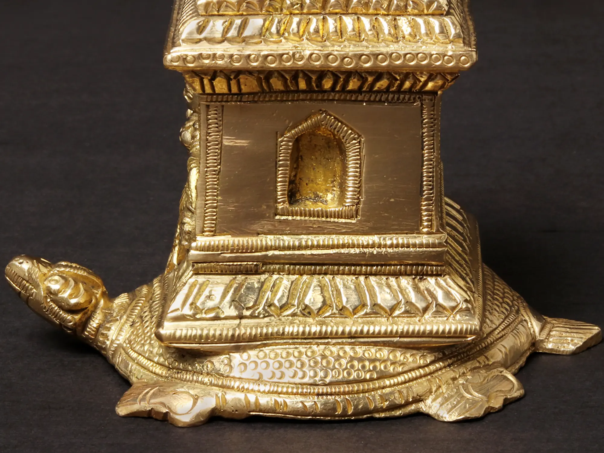 Elevate your spiritual practice and home ambiance with this exquisite brass incense stick holder, a testament to intricate craftsmanship and divine artistry. Designed to hold your favorite incense sticks, this piece transcends mere functionality, offering a visual and olfactory journey into devotion. At its foundation lies the symbolic representation of Kurma, the divine tortoise from Hindu mythology, upon whose back the universe is often depicted resting. This grounding element signifies stability, endurance, and the cosmic order, providing a solid and sacred base for your sacred ritual. The meticulous detailing of the tortoise's shell and form speaks to the artisan's skill, creating a lifelike foundation that anchors the entire piece with ancient reverence.