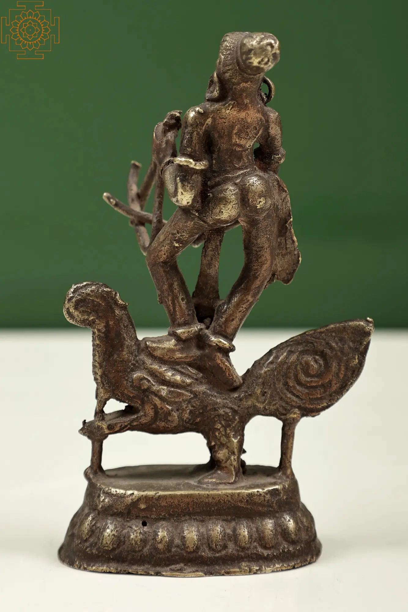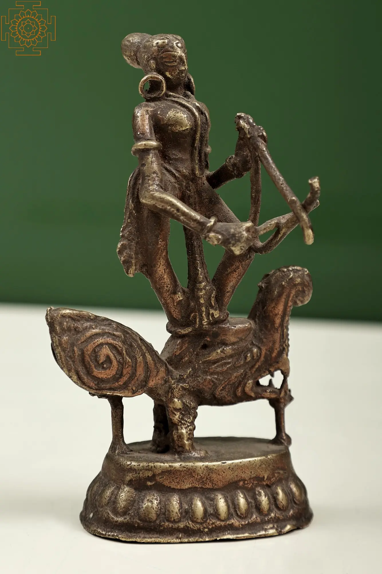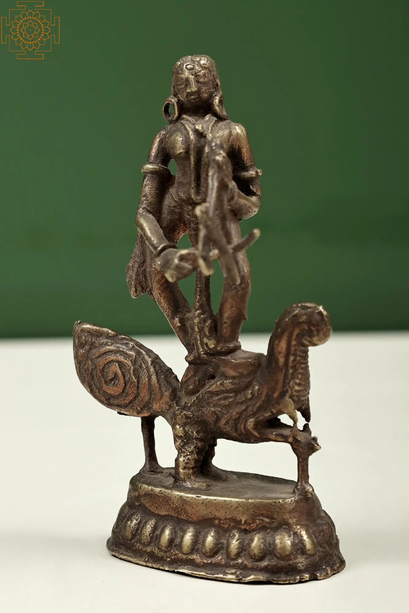 The sculpture showcases a tribal lady riding a makara, a mythical creature often associated with water and prosperity. The intricately carved details of her attire and accessories reflect the aesthetics of Central Indian tribal art, celebrating the elegance of indigenous cultures. The peacock tail fanning out behind the lady is a striking symbol of beauty, immortality, and renewal. In Indian mythology, the peacock is associated with grace and divine protection, adding a spiritual dimension to the artefact.