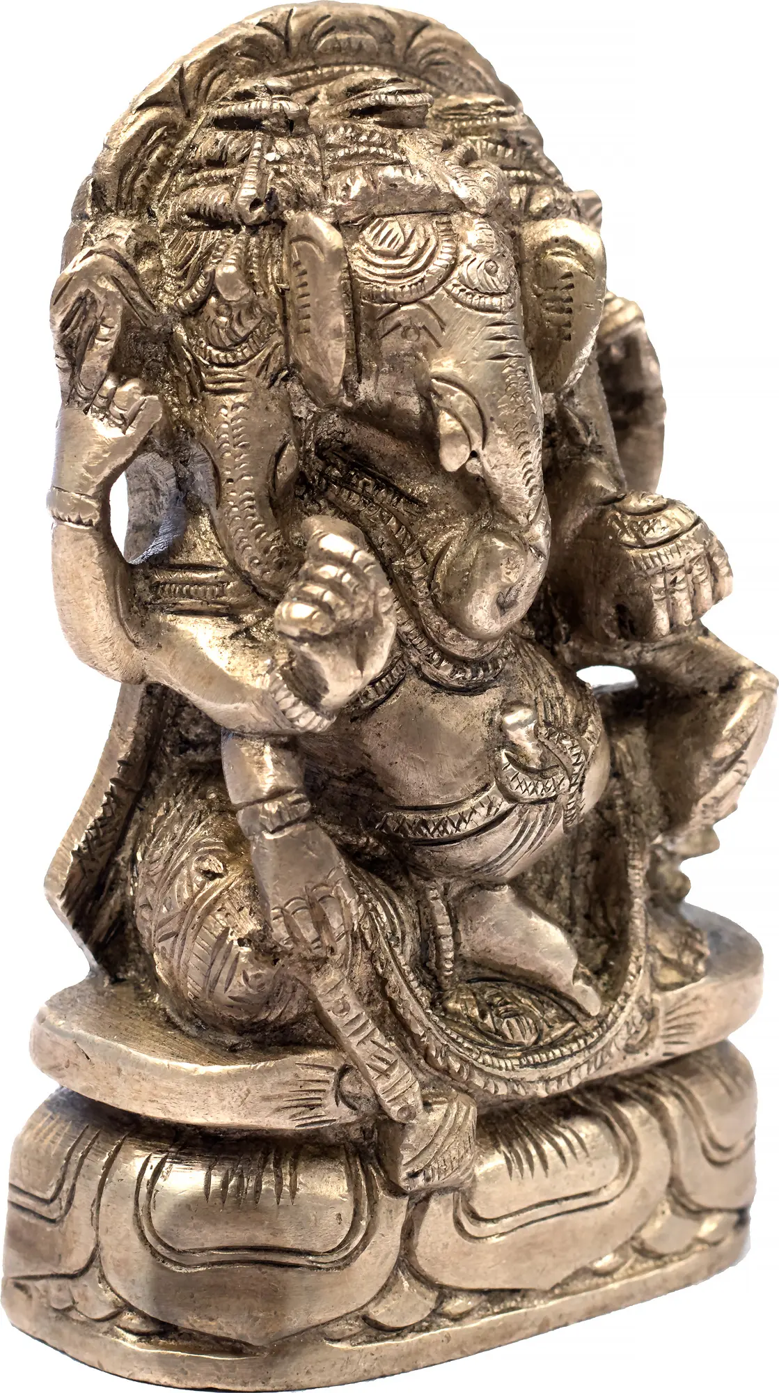 Trimukha Ganesha, also known as Three-Faced Ganesha, is a unique form of the Hindu elephant-headed deity, Lord Ganesha. In this representation, Ganesha is depicted with three faces, symbolising his omniscience, omnipresence, and omnipotence. The iconography of Trimukha Ganesha features six arms, each holding various symbolic attributes like a mace, a noose, a broken tusk, and a modak (sweet delicacy). This form represents Ganesha’s ability to overcome obstacles from all directions and grant blessings. Trimukha Ganesha is worshipped for wisdom, protection, and the removal of hindrances, making him a popular and revered deity among devotees seeking success and spiritual fulfilment. This cherished creation in brass is an auspicious addition to any spiritual collection to inspire divine blessings.