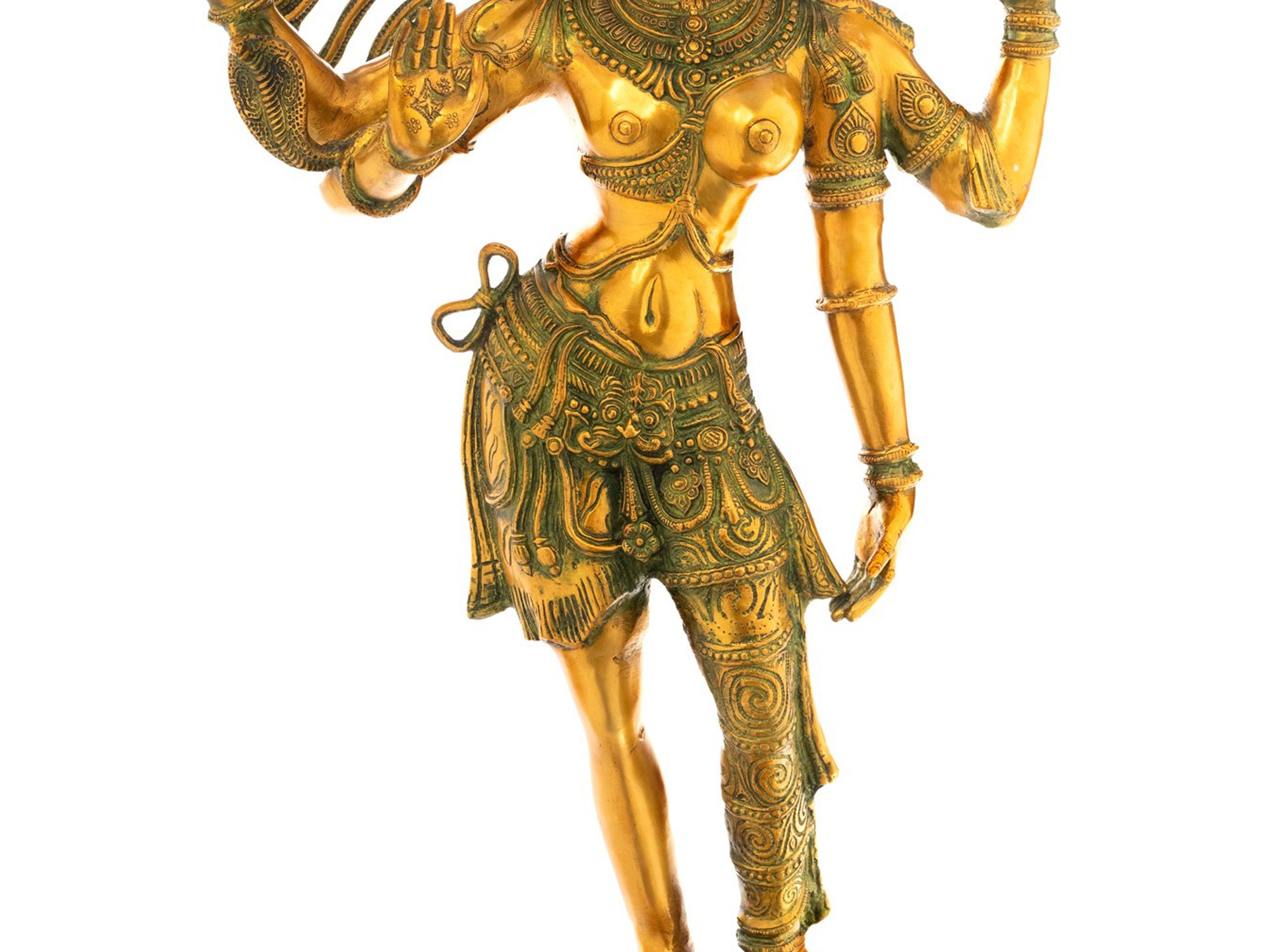 This quite a tall brass statue in the tradition of great Chola bronzes of South represents the Ardhanarishvara, that is, half male and half female, form of Lord Shiva.