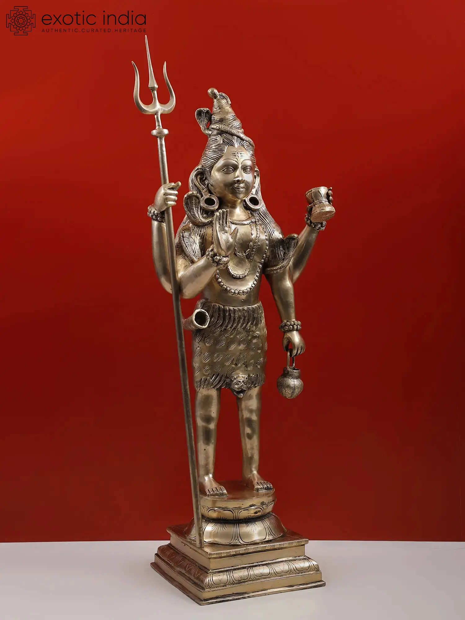 In the hands of this Mahadeva big statue are a quantum of blessing in the aashirvaad mudra and the kamandalu in the anterior hands, and trishoola va damroo in the posterior hands. It is a monotone brass composition that would look great both in the outdoors (say, in the garden or at the entrance to your home) and indoor.