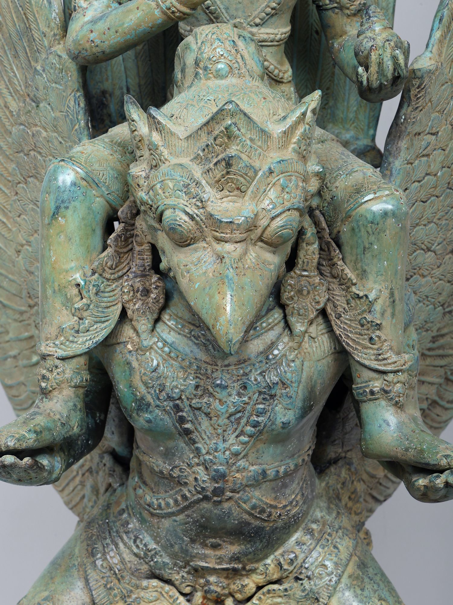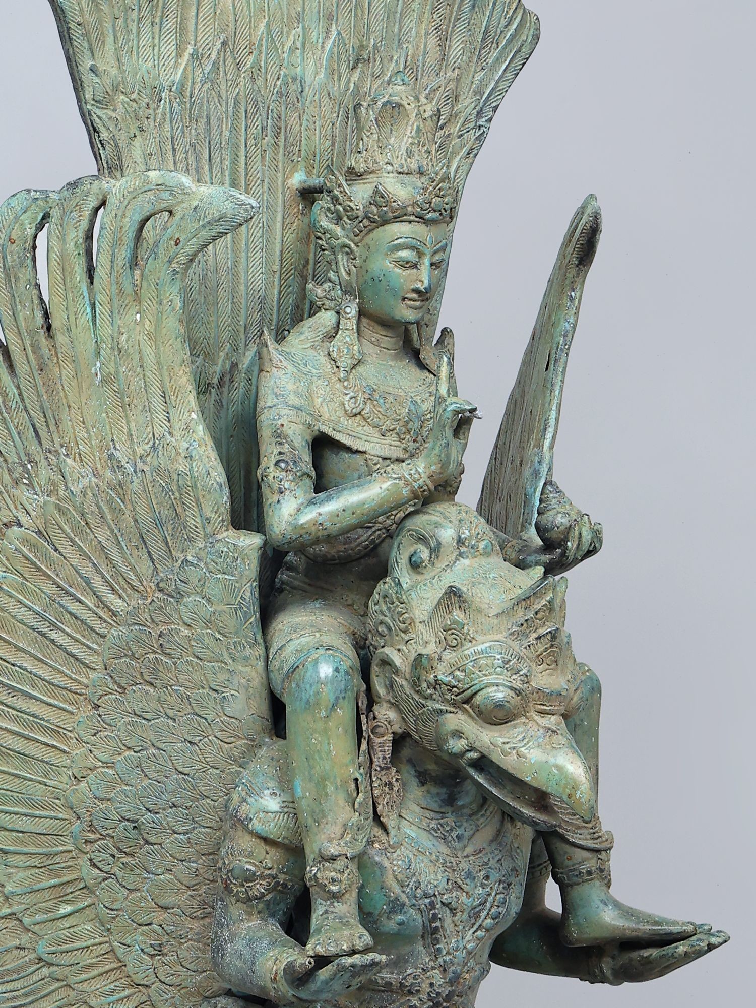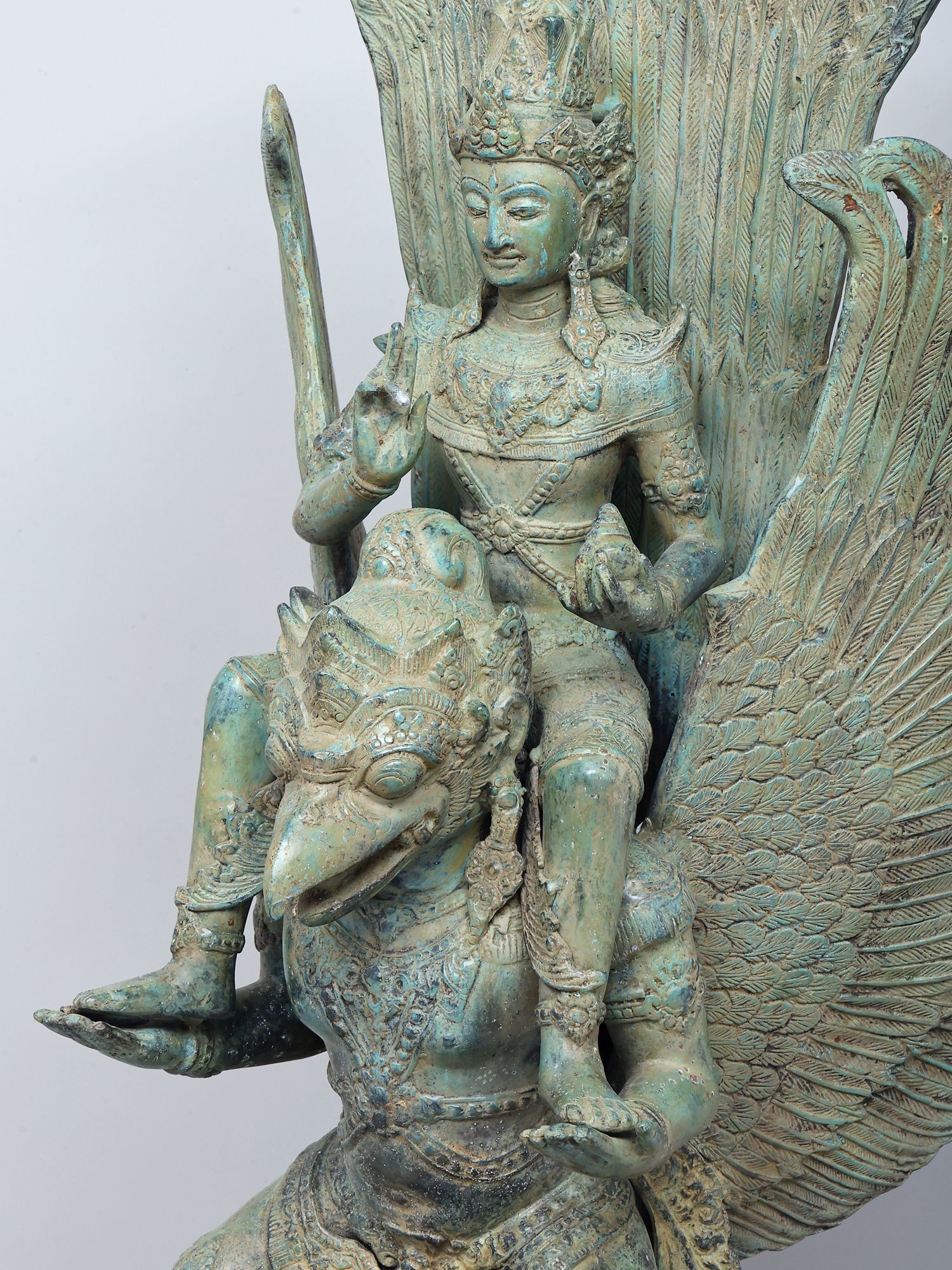Depicts Lord Vishnu, the preserver, riding his celestial vahana, Garuda, the eagle-like divine.