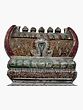 At the heart of this captivating panel is the iconic depiction of Rishabarudar, a manifestation of Lord Shiva accompanied by Goddess Parvati, seated upon his celestial vahana, the sacred bull Nandi. This imagery evokes the powerful union of Shiva and Shakti, the cosmic masculine and feminine energies. Nandi, often depicted as a demigod and the gatekeeper of Shiva's abode, symbolizes devotion, strength, and righteousness. The serene yet powerful posture of the divine couple, flanked by protective mythical creatures, speaks of their supreme authority and benevolent grace. The delicate details in their adornments, the flowing drapery, and the expressive features of Nandi are testaments to the exceptional skill of the artisans who brought this piece to life.