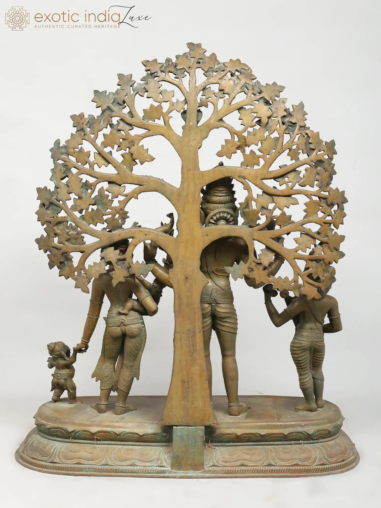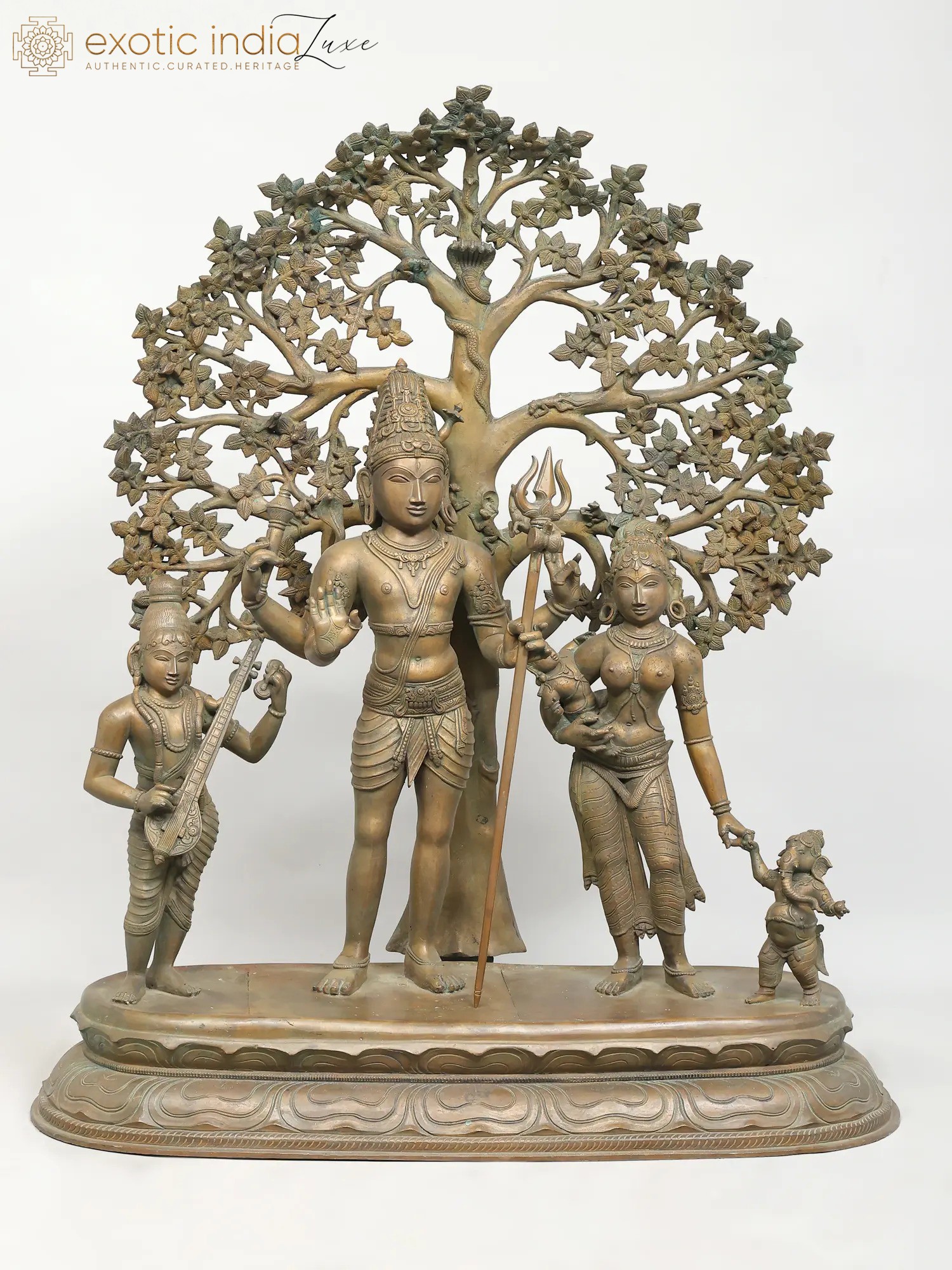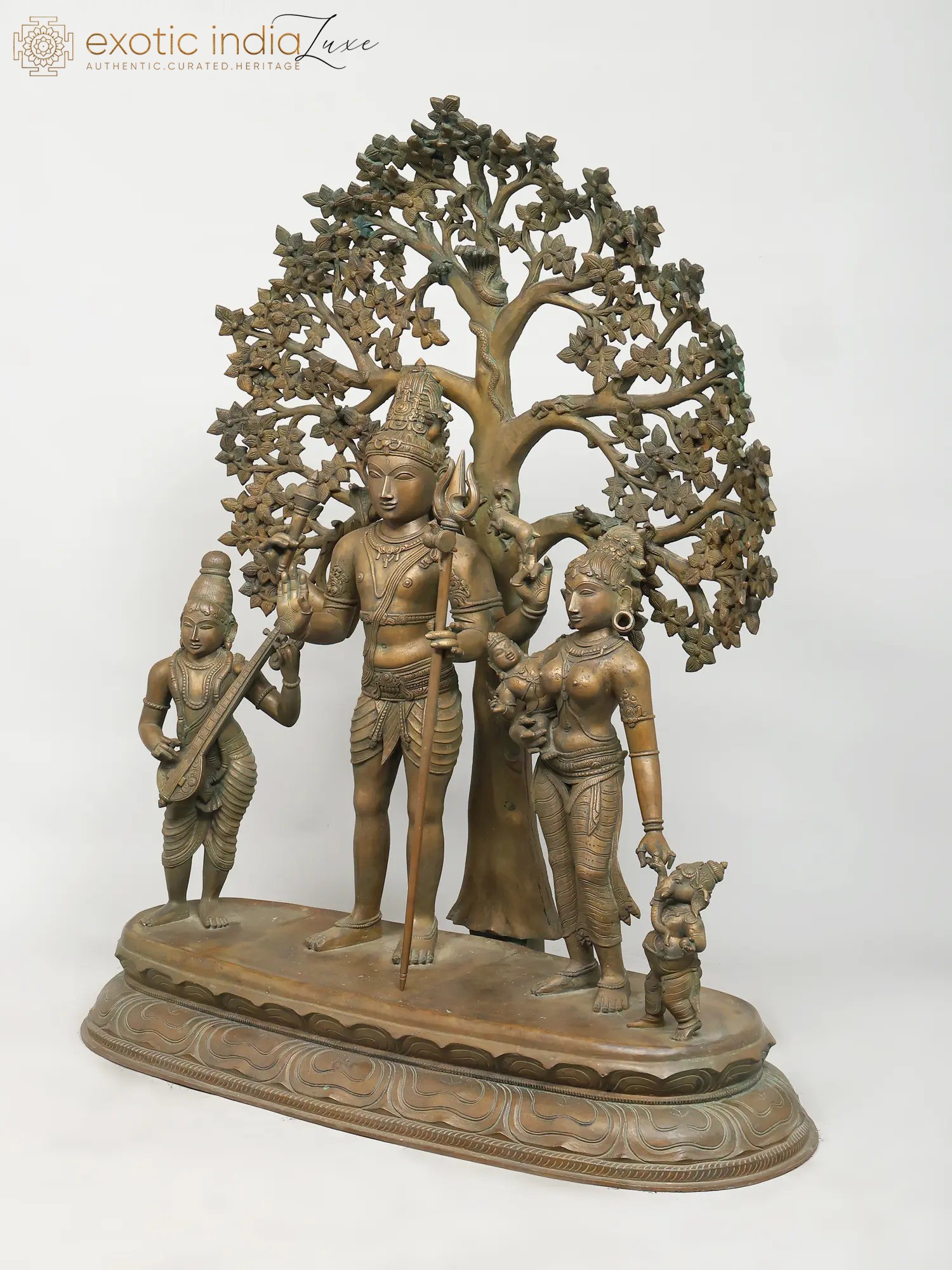Shaded by a naturalistically depicted tree that houses various animals in animated poses, Shiva’s family appears decked up for a heavenly portrait in metal.