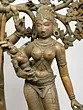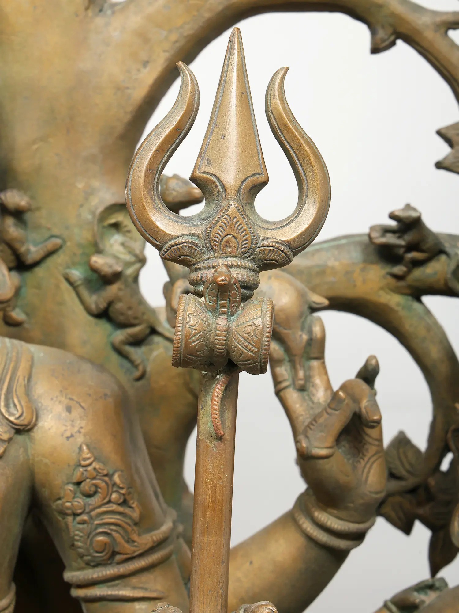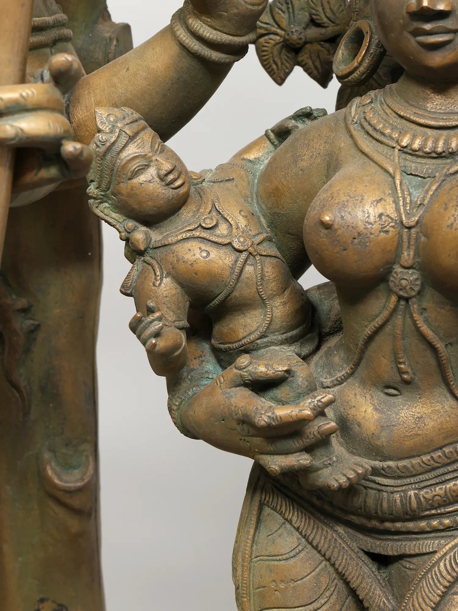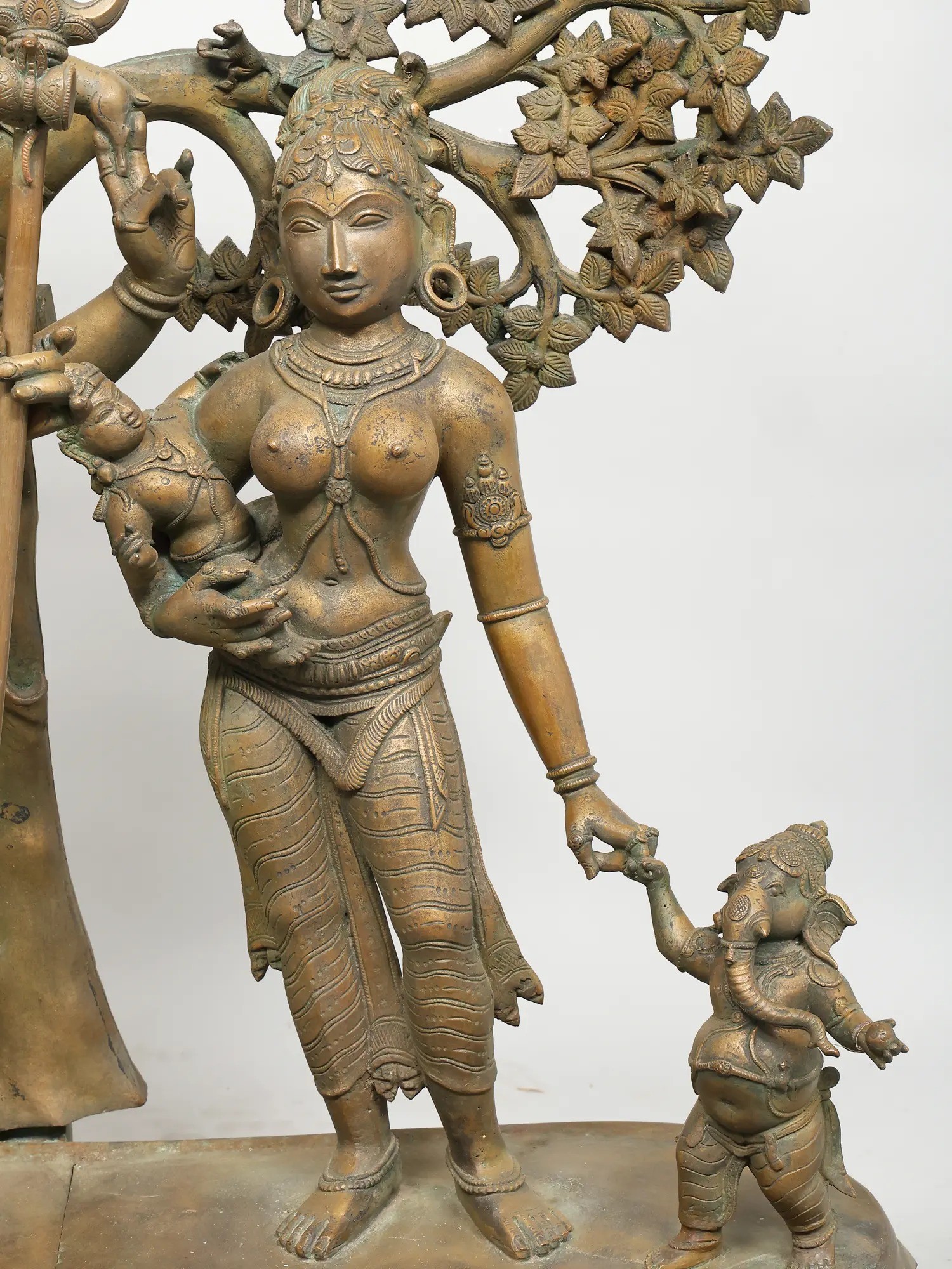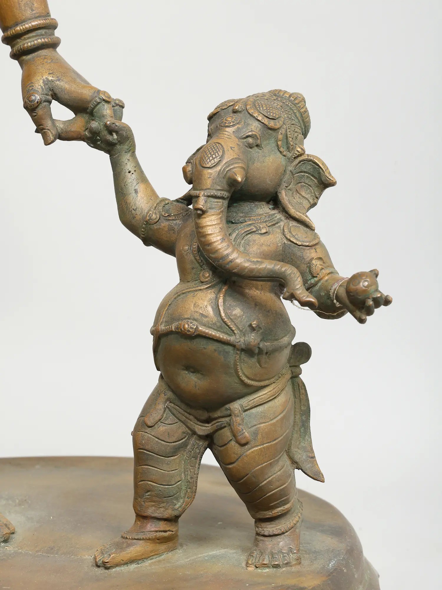 Accompanying him is Parvati, the embodiment of femininity- wifely and motherly virtues, exquisite in appearance, carrying Kumara on her waist and holding the hand of a dotting Ganesha who seems to have walked on the lotus pedestal a few moments ago. The immaculate sculpting of each icon, the visible smile on their idealistically delineated faces, and their graceful poses fill the bronze composition with a sense of life.