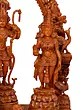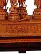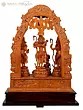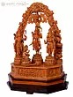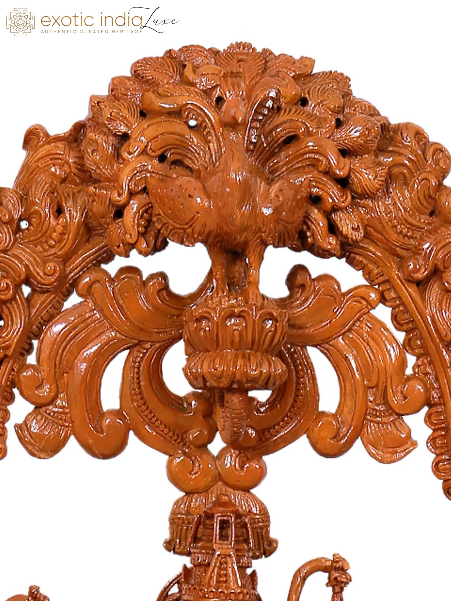 An enchantingly carved foral aureole surrounds the three figures- Rama, Lakshman, and Sita. The vegetation, a symbol of a new beginning and auspiciousness, sprouts dynamically, captured gorgeously in wood. From the center of the aureole hangs a lotus flower as the Chattra or royal umbrella, held in the grip of a beautiful peacock. The peacock or Mayura motif, associated with beauty, regalia, and divinity in Indian tradition, is repeated on the pillars of the aureole, filling the composition with a natural loveliness.