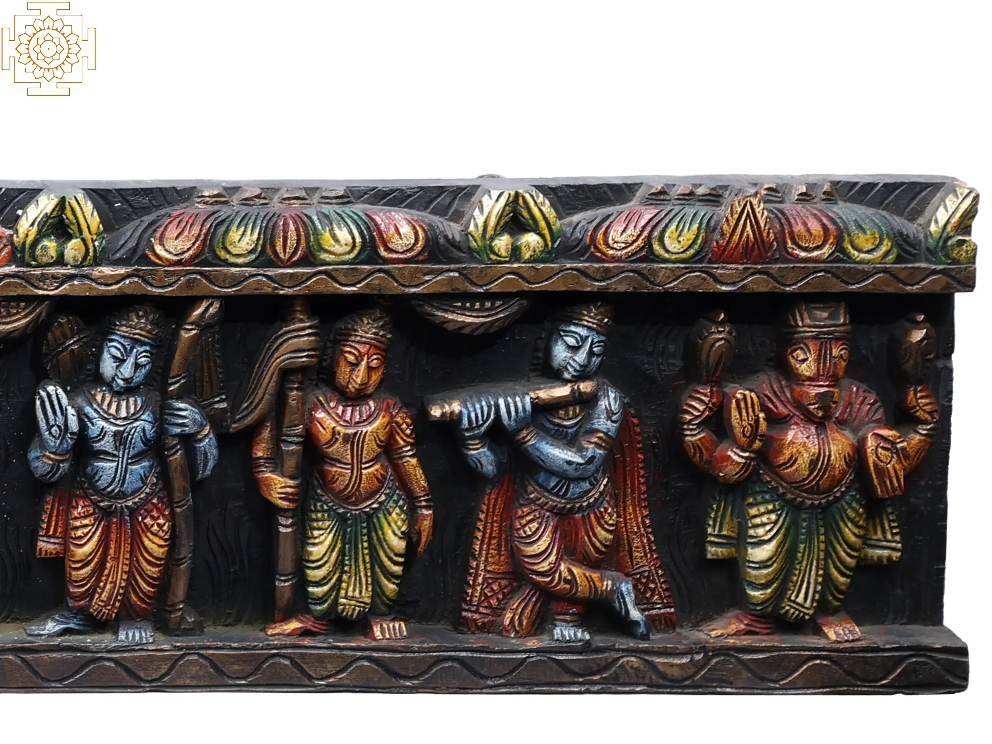 This exquisitely crafted wooden wall panel is a vibrant testament to the rich cultural and mythological heritage of Hinduism. Measuring a substantial 41 inches in length, this piece captures the essence of Lord Vishnu's ten principal avatars, known as the Dashavatara. Each figure is meticulously carved and brightly colored, bringing to life the divine beings who have descended to Earth to restore cosmic balance and protect dharma. The panel is arranged chronologically, depicting the avatars in their traditional order. From the primordial Fish, Matsya, who saved Manu from a great deluge, to the tortoise, Kurma, who supported Mount Mandara during the churning of the ocean, each incarnation tells a story of divine intervention. We see Varaha, the boar, who rescued the Earth from the depths, and Narasimha, the half-man, half-lion, who vanquished the arrogant demon Hiranyakashipu. The dwarf Vamana, the righteous Parashurama, the serene Lord Rama, the wise Balarama, the playful Krishna, and finally, the anticipated Kalki, all stand in procession, their forms imbued with power and grace. —
